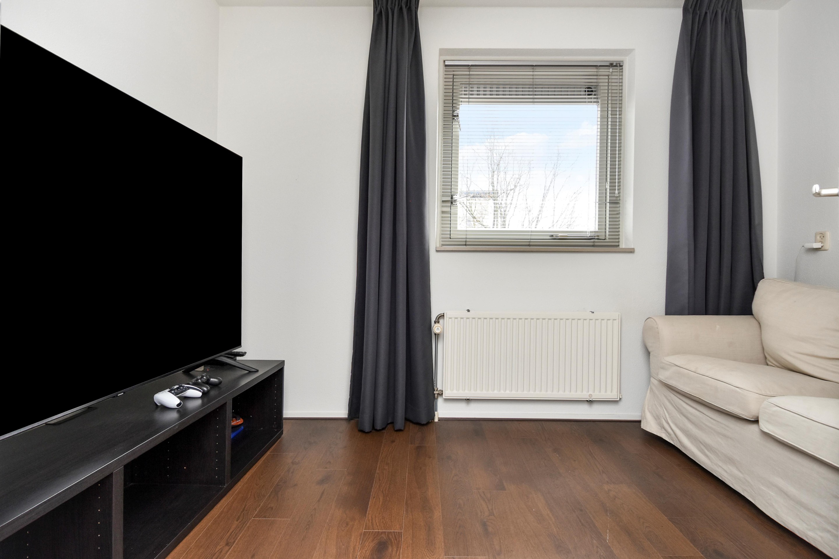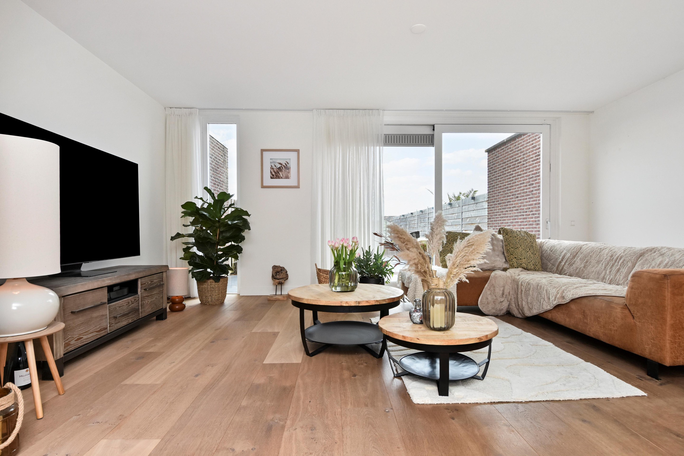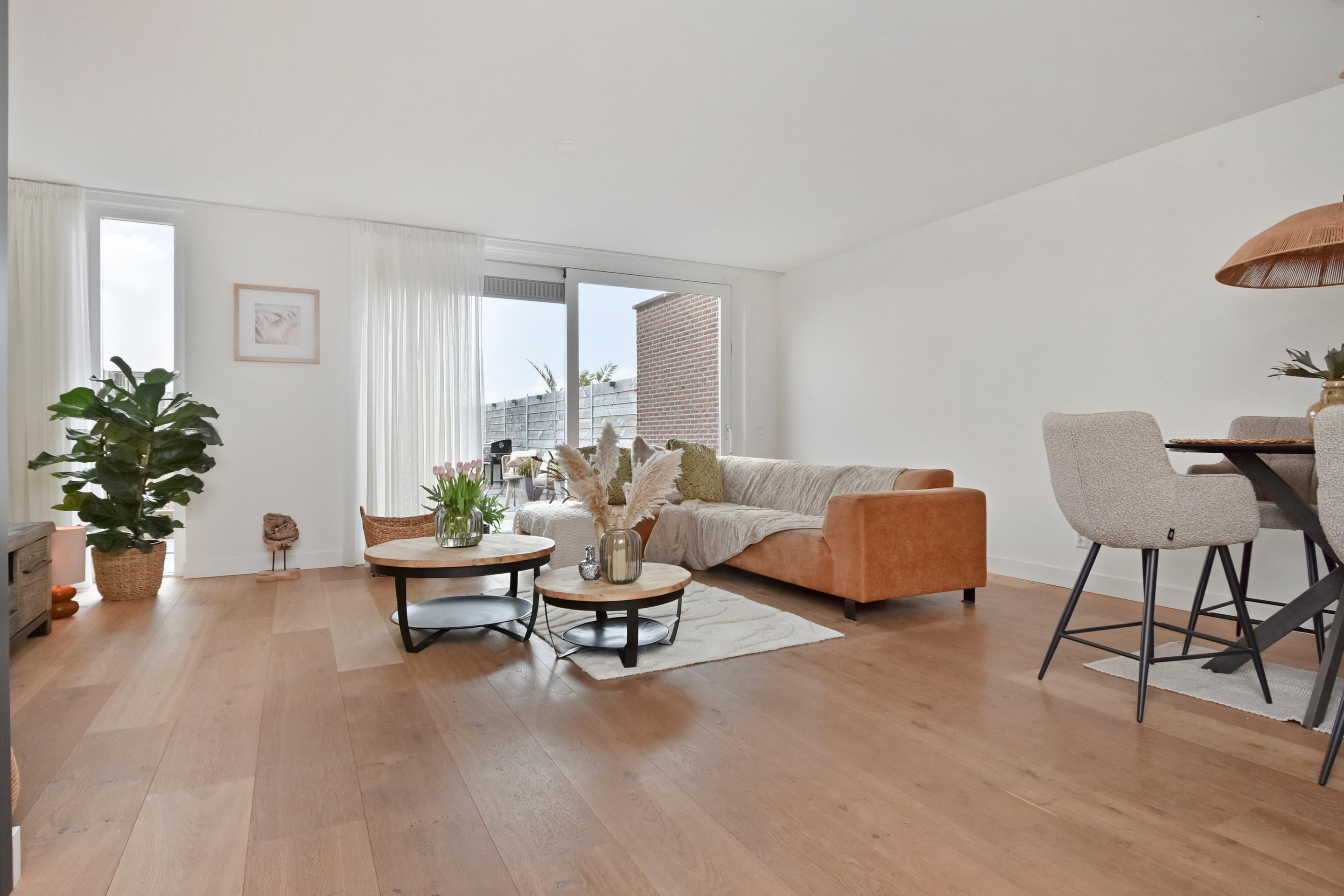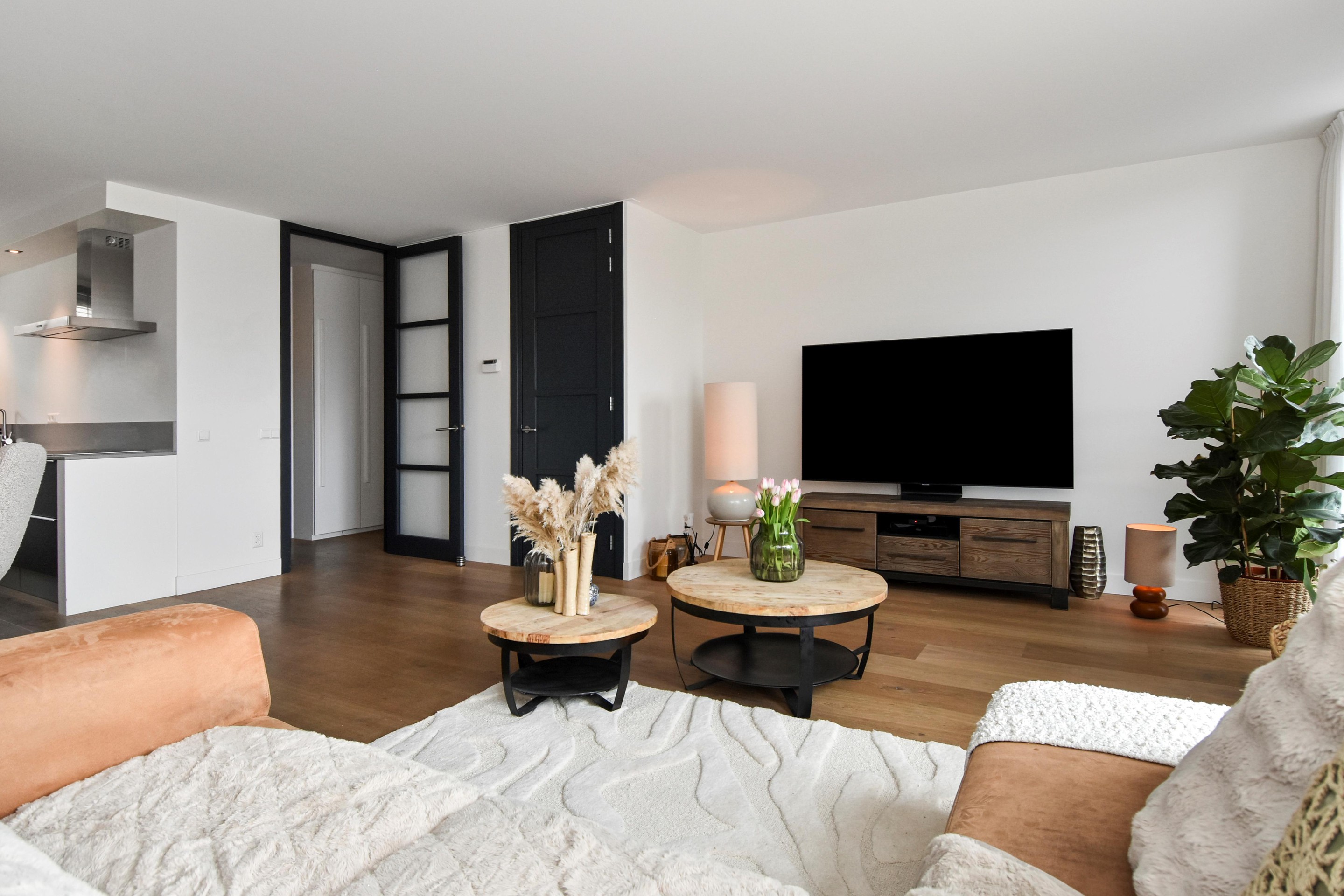 De woonkamer is goed afgewerkt met houtenvloeren, gestuucte wanden en plafonds en handige trapkast. De open keuken is te vinden aan de voorzijde en is door de breedte een ruim. De keuken is voorzien van combi-oven, grote koel-/vriescombinatie, inductiekookplaat met afzuigkap en vaatwasser.