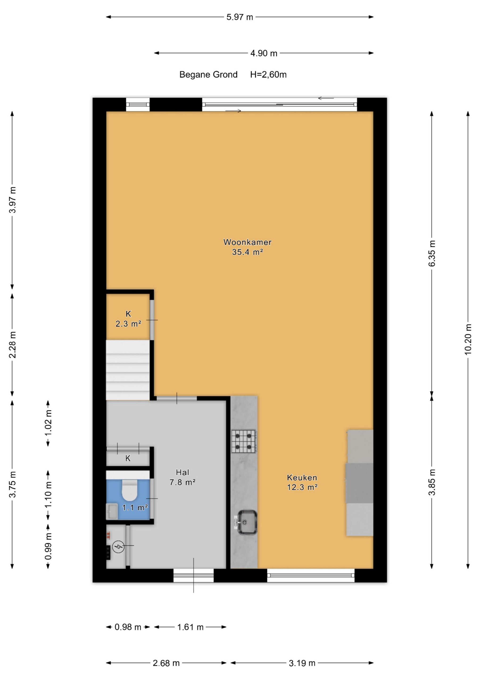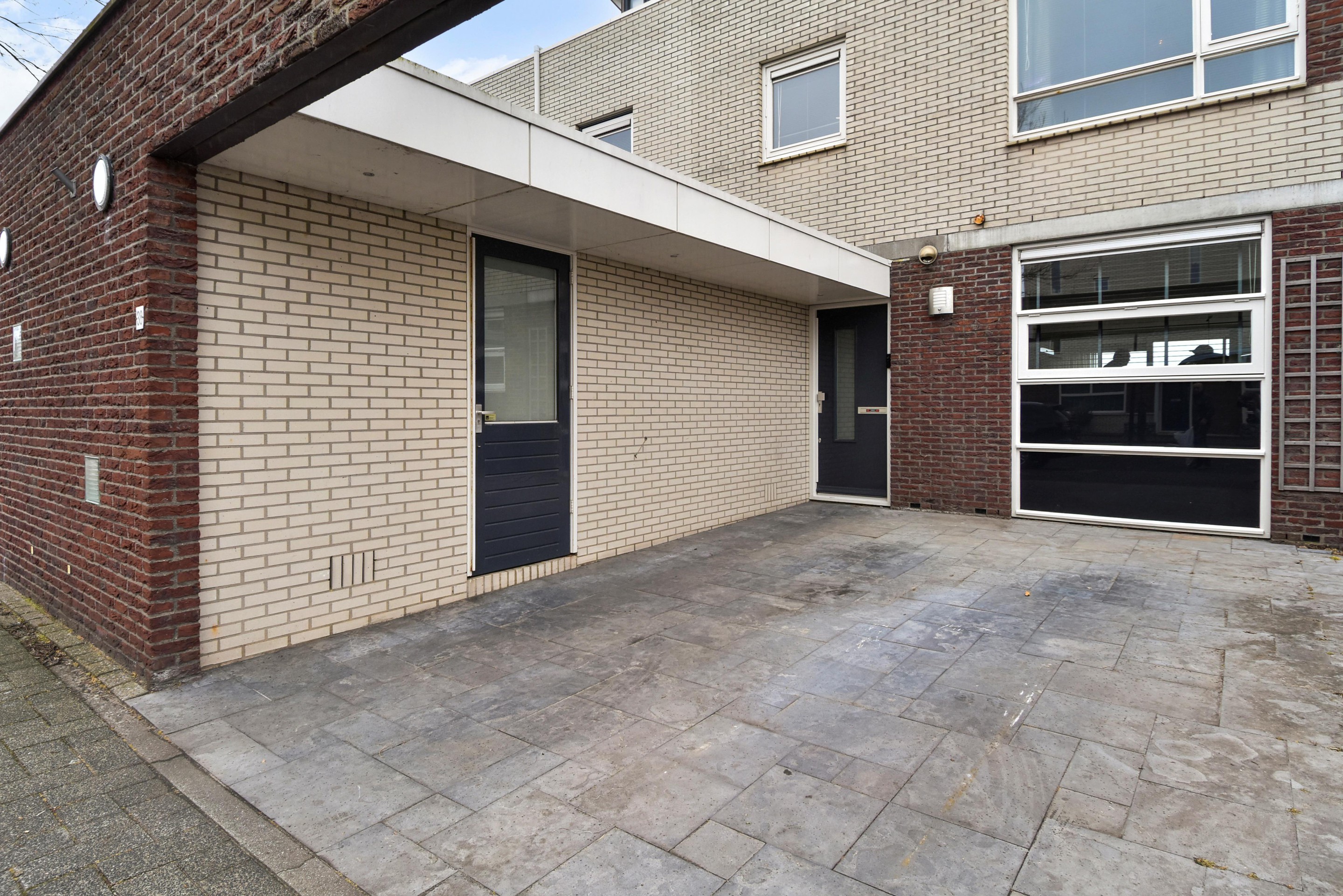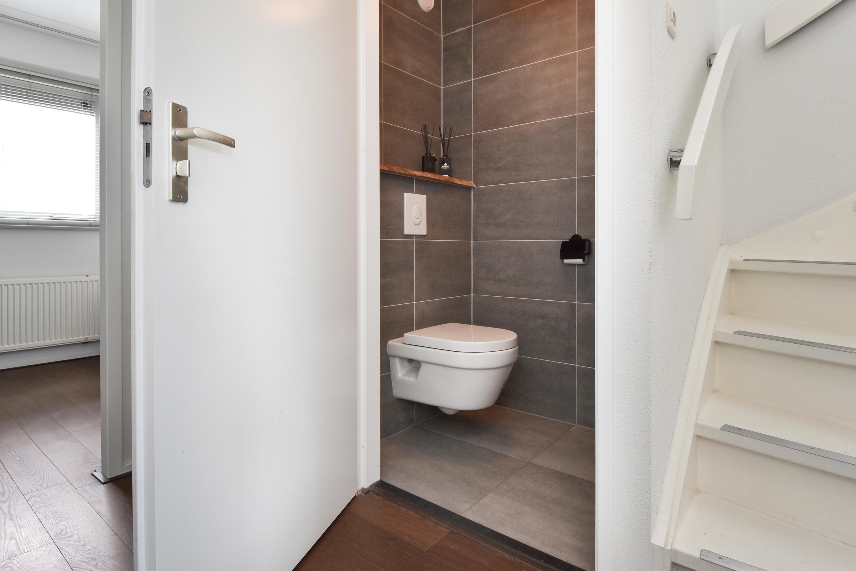 Via de voortuin met eigen parkeerplaats en aangebouwde stenen berging bereik je de entree van de woning. Hal met meterkast, modern toilet met hangend closet en fonteintje, garderobe en trapopgang naar de eerste verdieping en toegang tot de woonkamer.