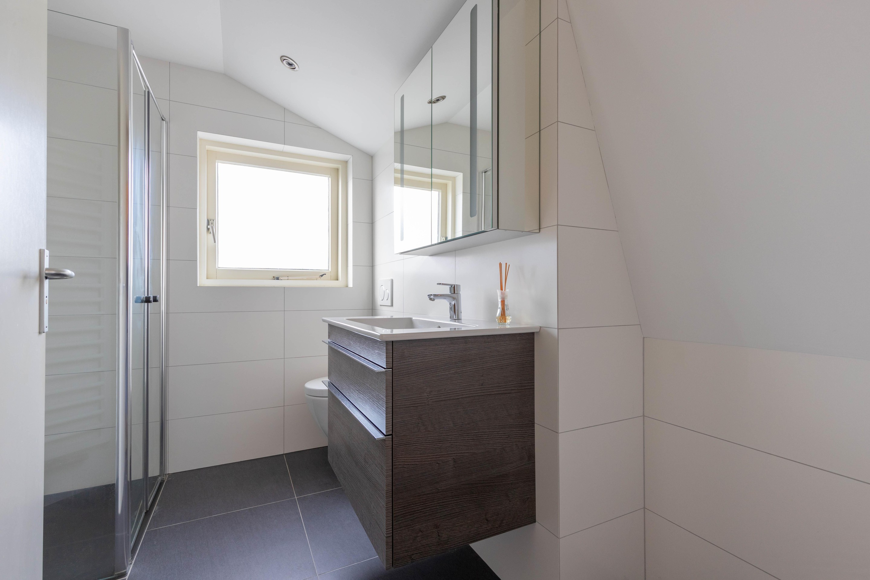 Daarnaast beschikt deze verdieping over een luxe tweede badkamer (2017), modern afgewerkt met een ruime inloopdouche, stijlvol wastafelmeubel en zwevend toilet. Dit biedt volop comfort en privacy voor het hele gezin of gasten.