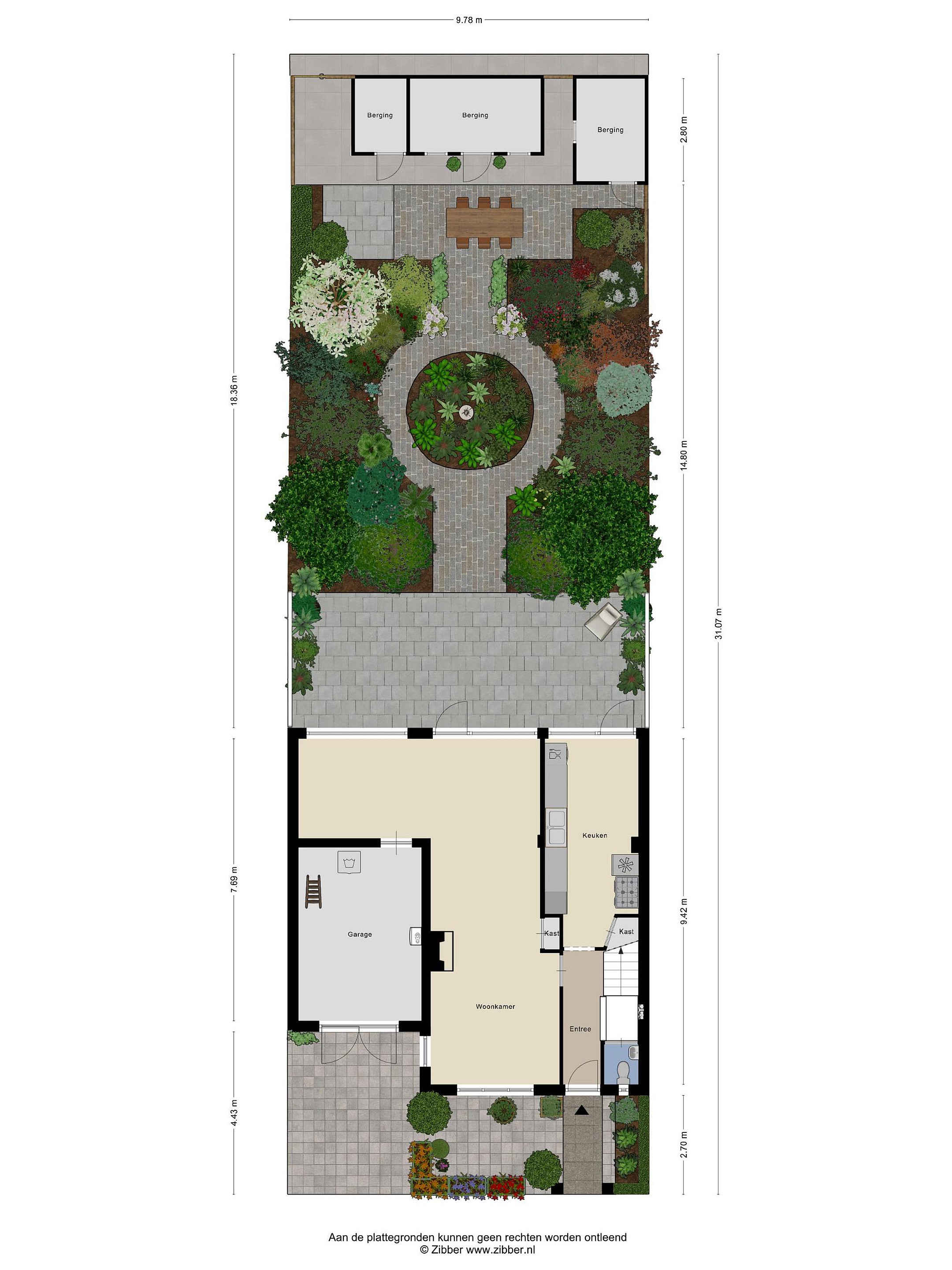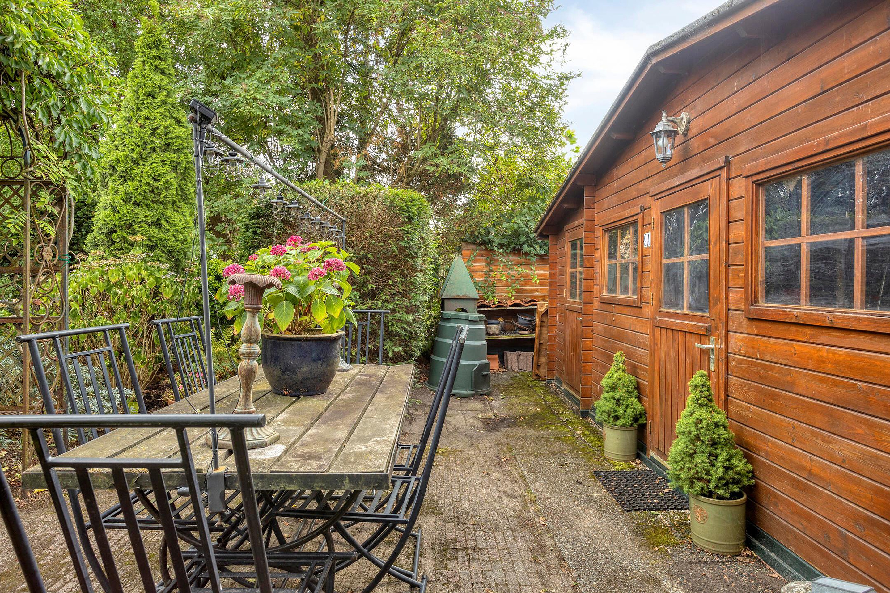 - Fraai beplante, brede en diepe (ca. 15 m) achtertuin op zonnige westen met veel privacy en zowel houten als stenen berging en handige achterom;