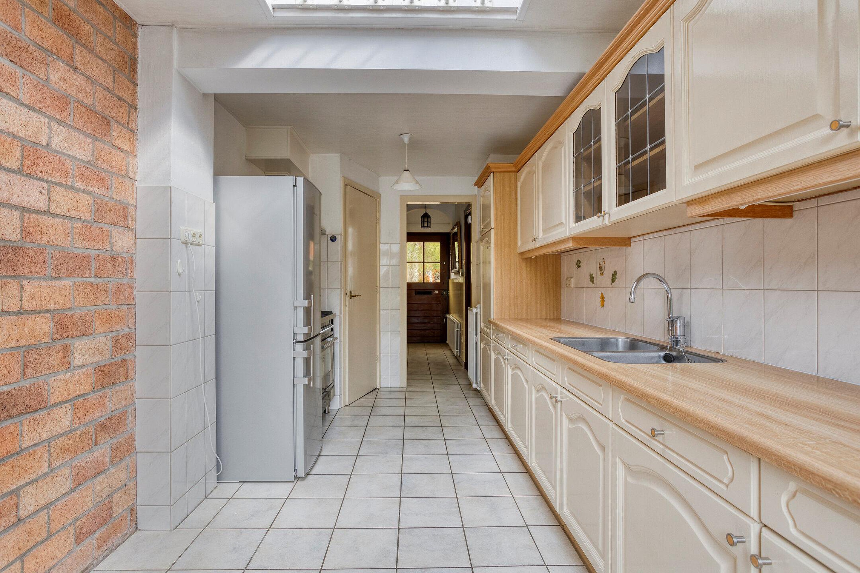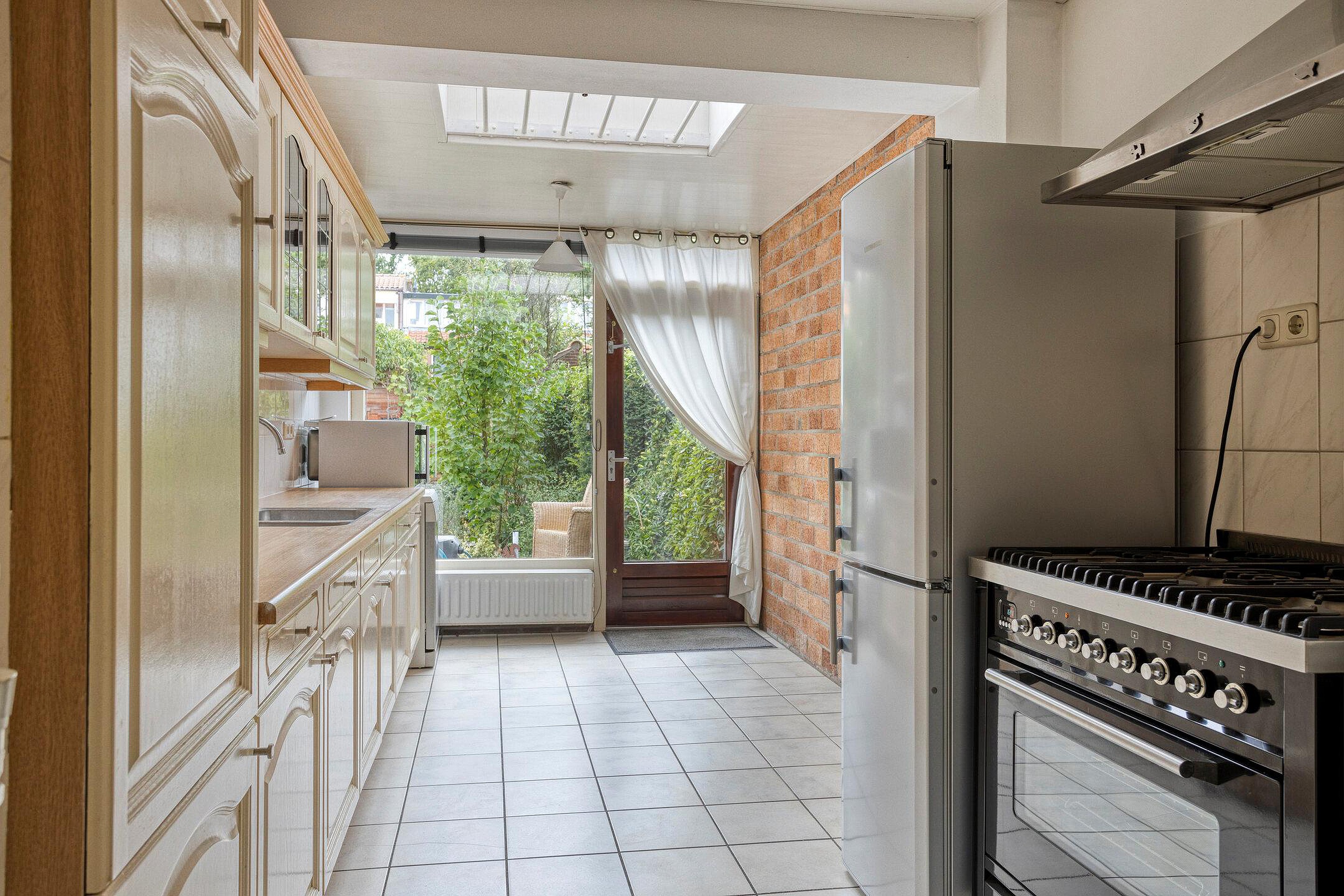 Begane grond Fraai aangelegde en bestrate voortuin met parkeergelegenheid op eigen terrein en via openslaande deuren toegang tot de inpandige garage met bergzolder. De garage is eenvoudig bij gebruiksoppervlakte wonen te betrekken. Hal met vernieuwde meterkast en toilet met fontein. Ruime en lichte (dankzij de vele raampartijen), aan de achterzijde uitgebouwde, tuingerichte L-vormige woonkamer met mogelijkheid tot het realiseren van een open haard en met toegangsdeur naar de garage en achtertuin. Aan de achterzijde bevindt zich de ruime keuken met trapkast, dakvenster en toegangsdeur naar de tuin.