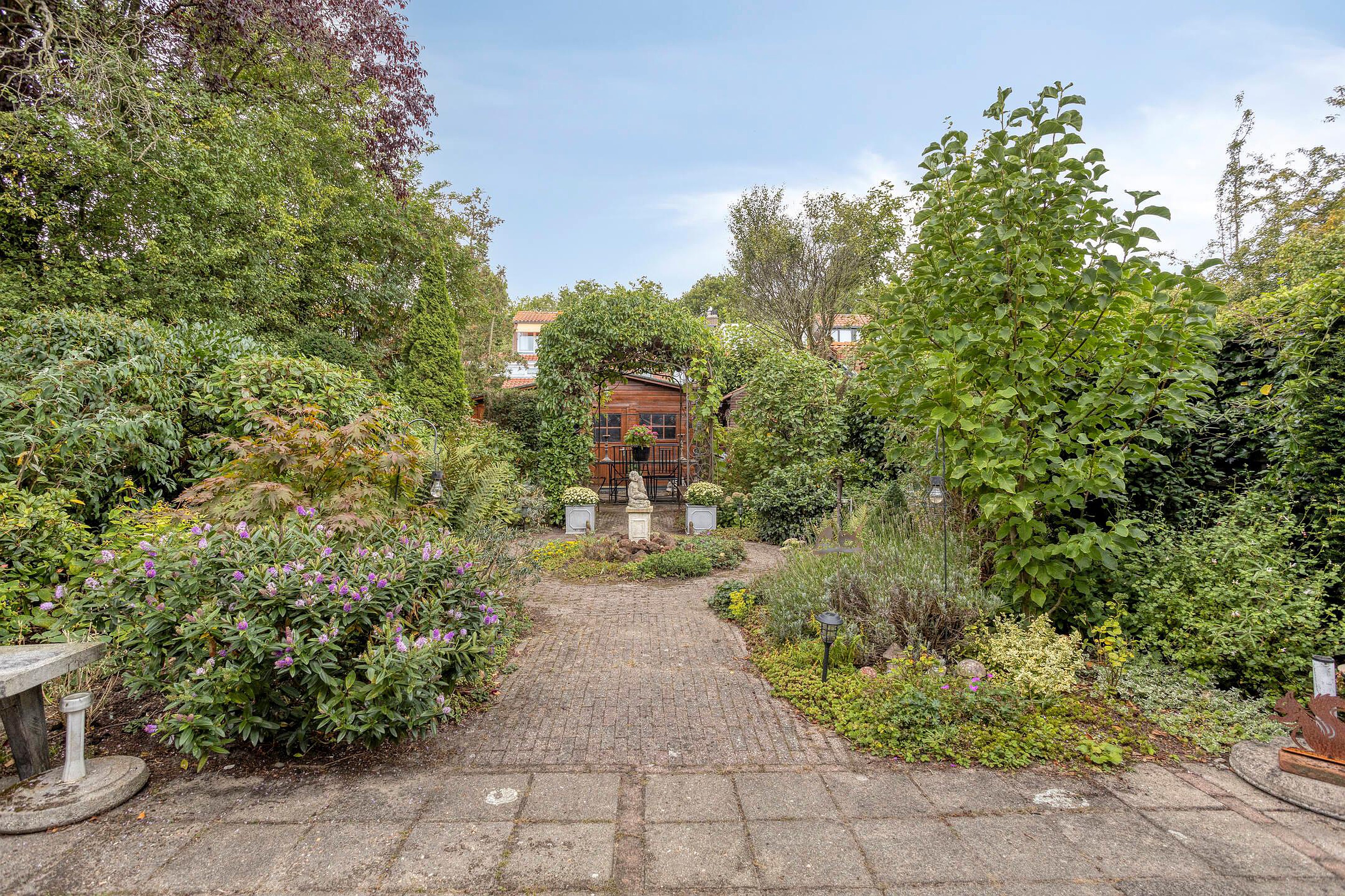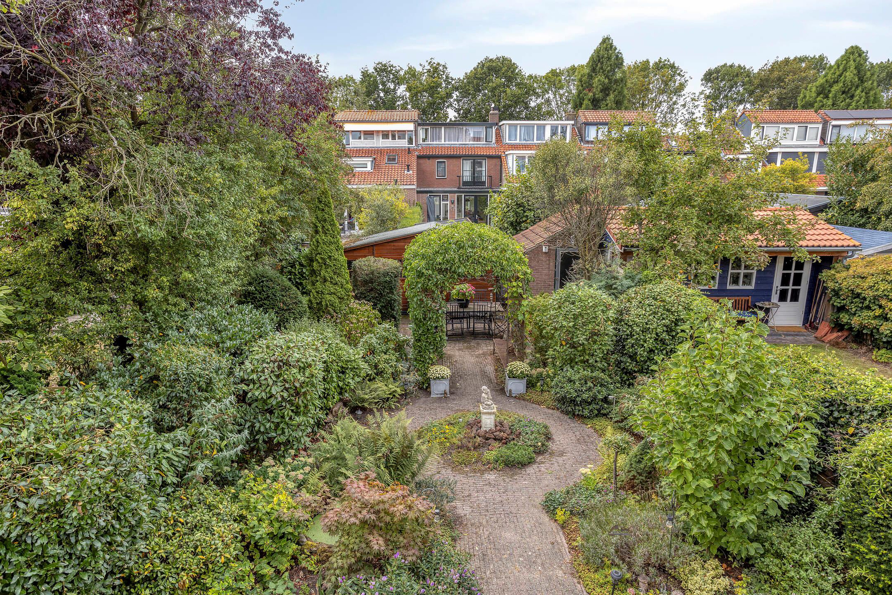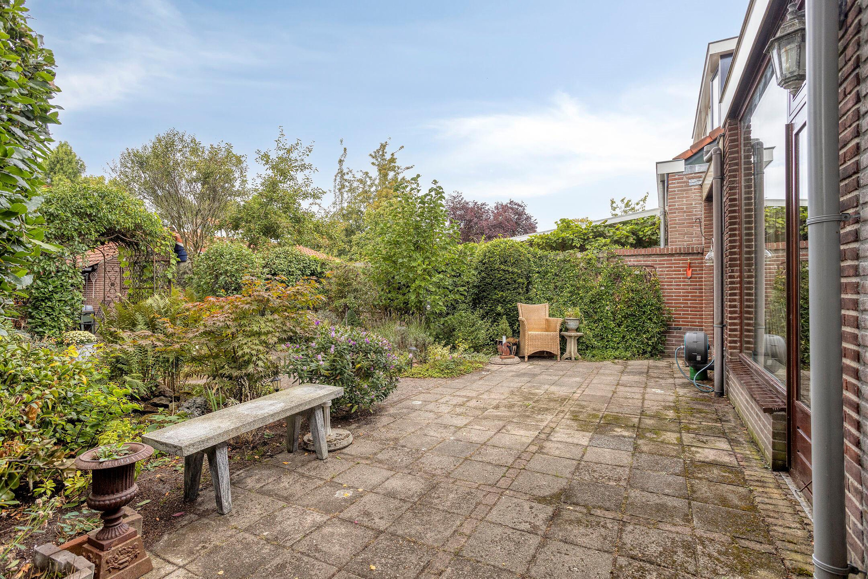 Tuin Brede en bestrate voortuin met parkeergelegenheid op eigen terrein. Fraai aangelegde diepe (ca 15 m), groene, beschutte en zonnige achtertuin op het westen voorzien van meerdere terrassen en 3 bergingen en handige achterom.
