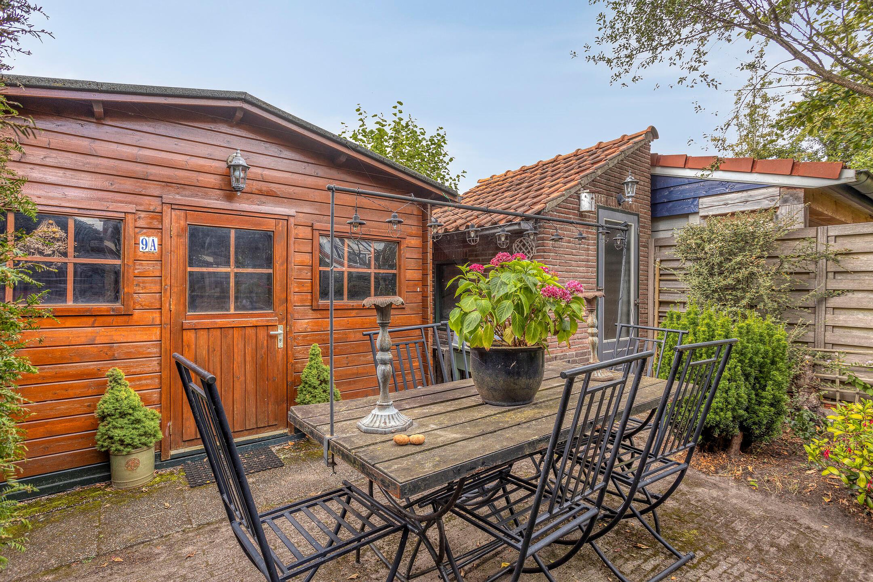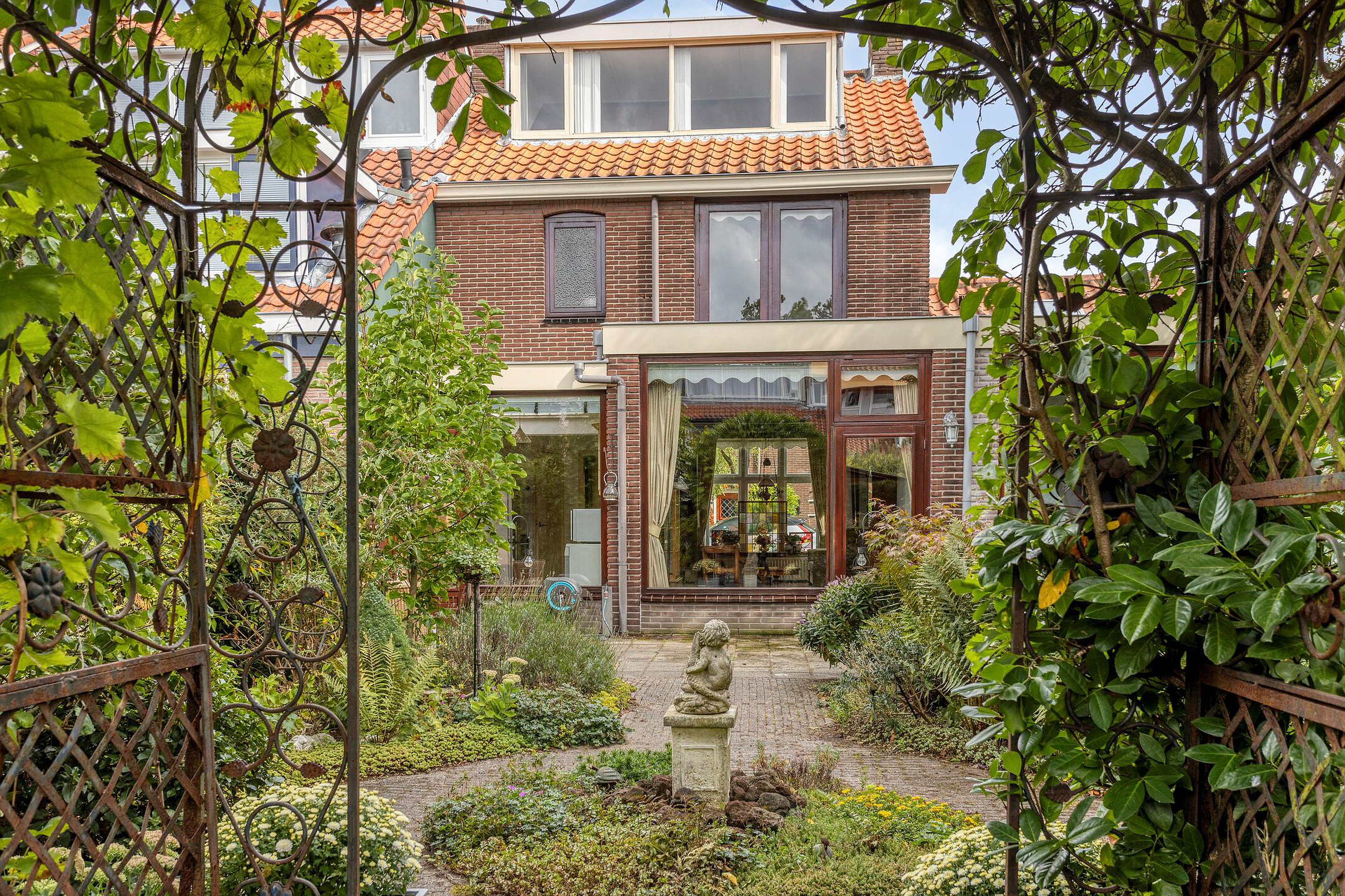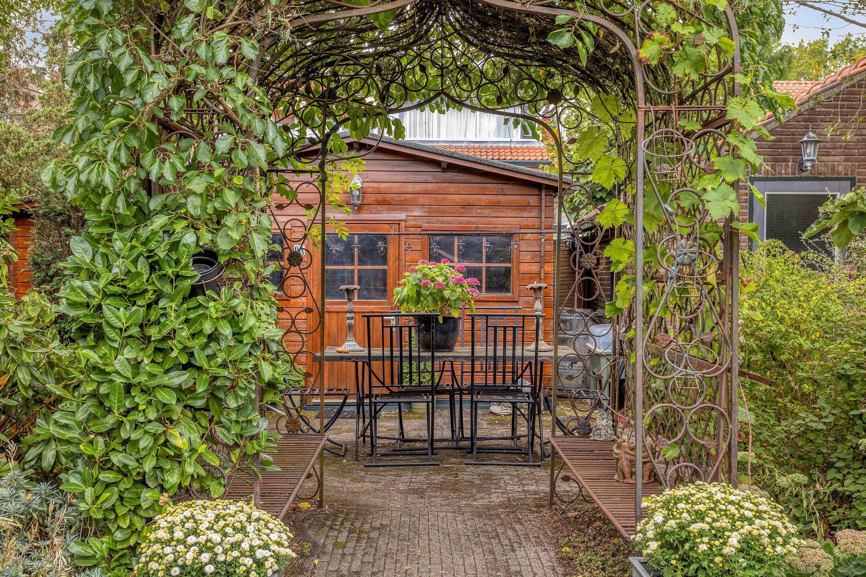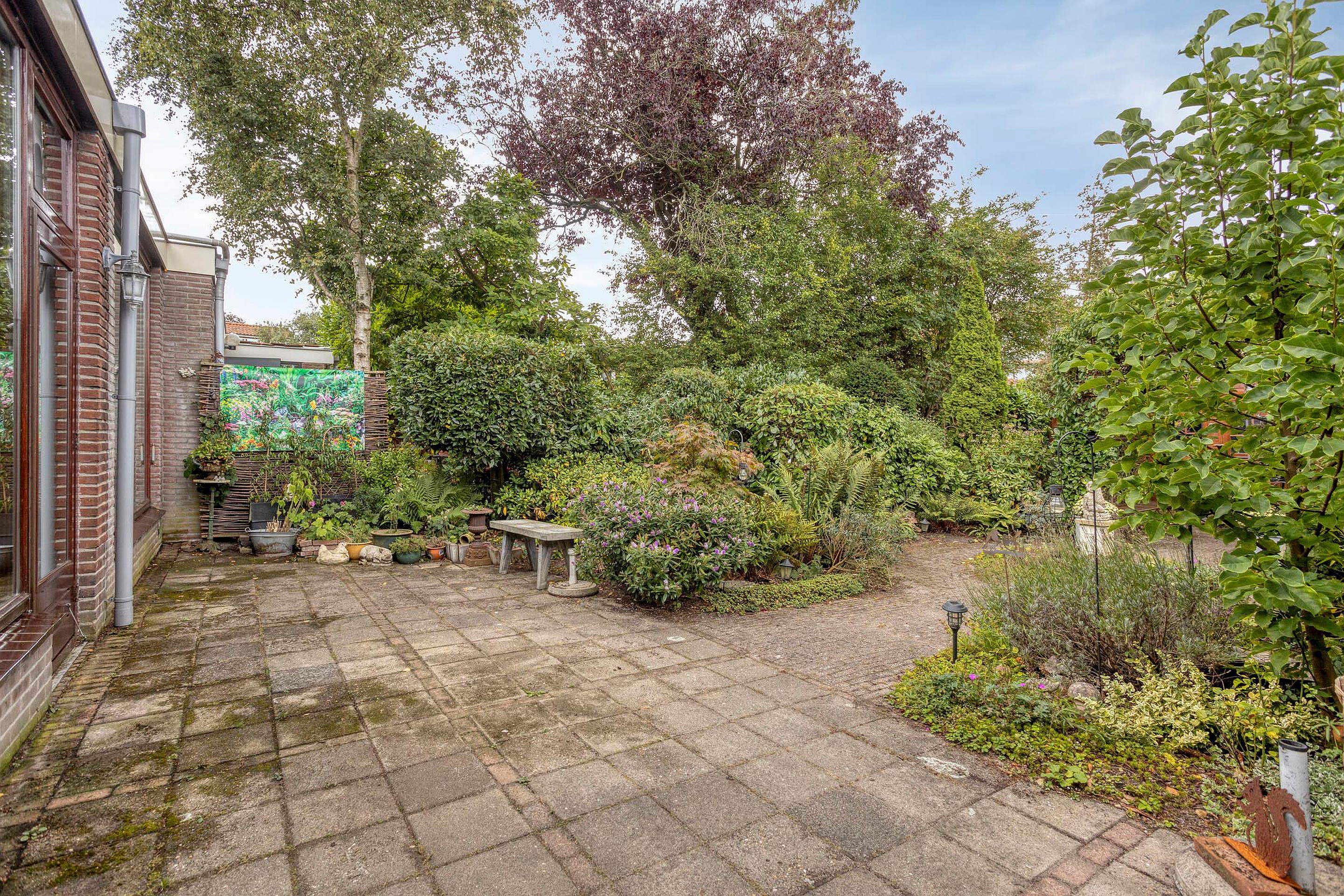 Tuin Brede en bestrate voortuin met parkeergelegenheid op eigen terrein. Fraai aangelegde diepe (ca 15 m), groene, beschutte en zonnige achtertuin op het westen voorzien van meerdere terrassen en 3 bergingen en handige achterom.