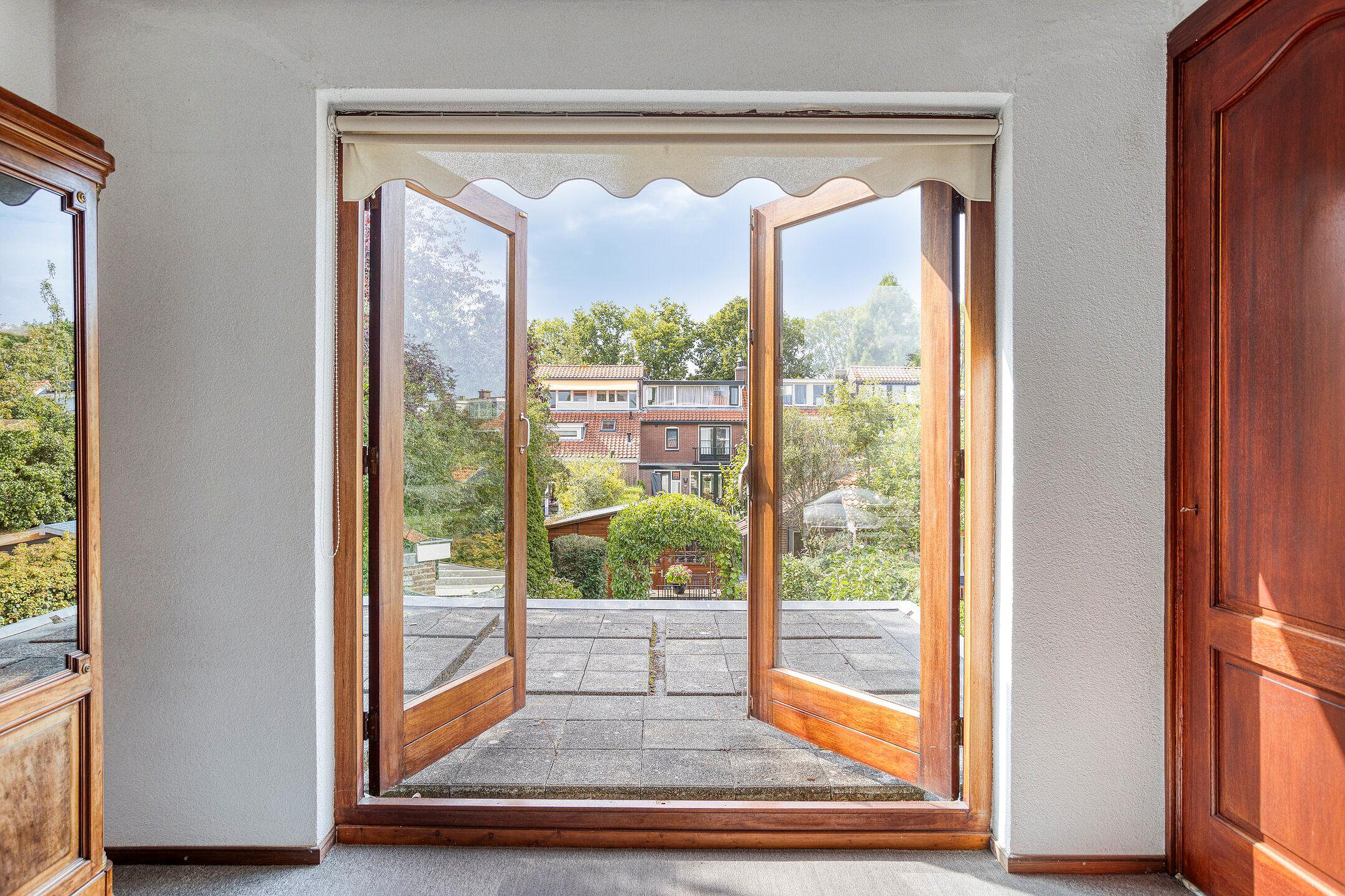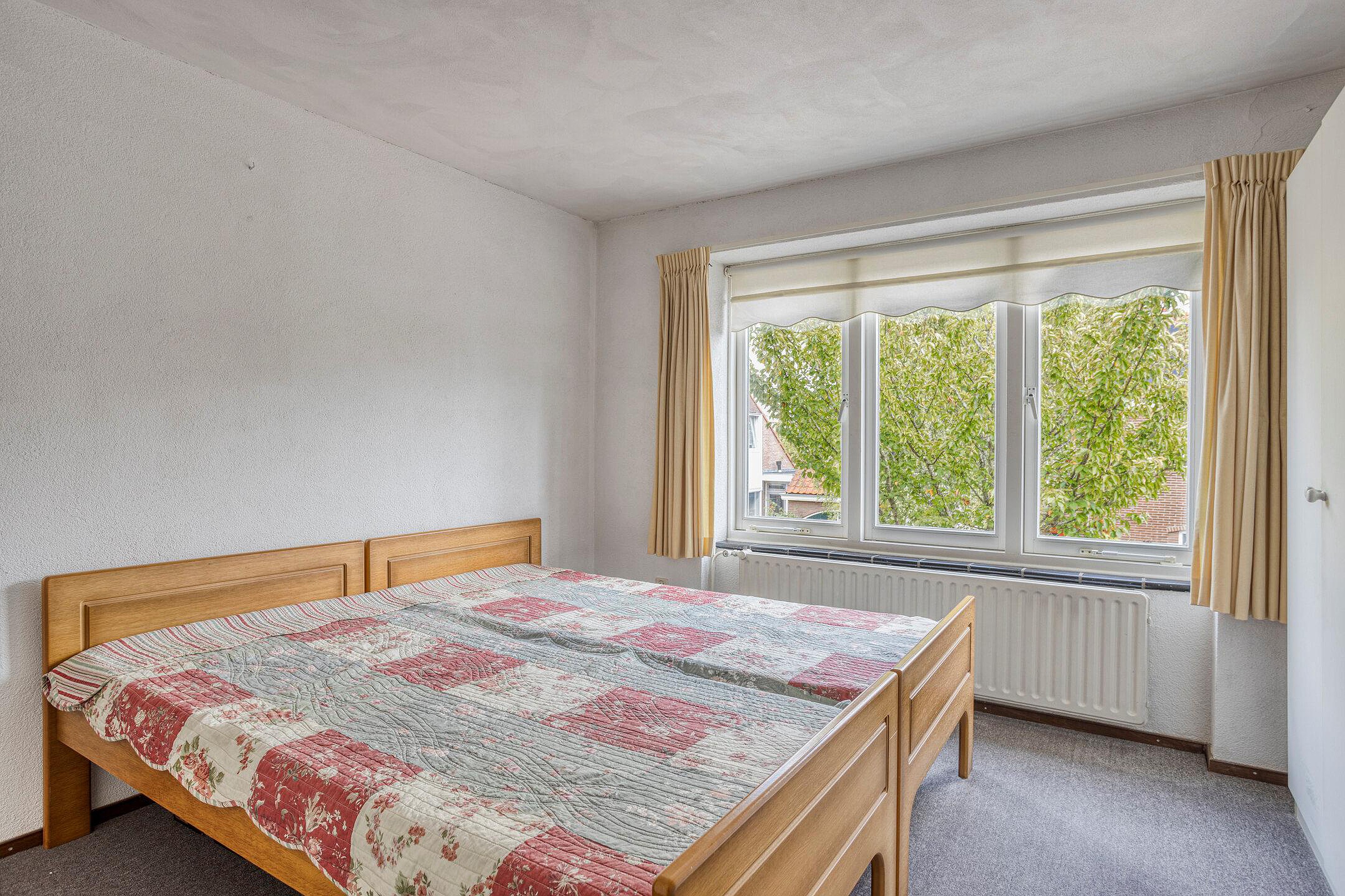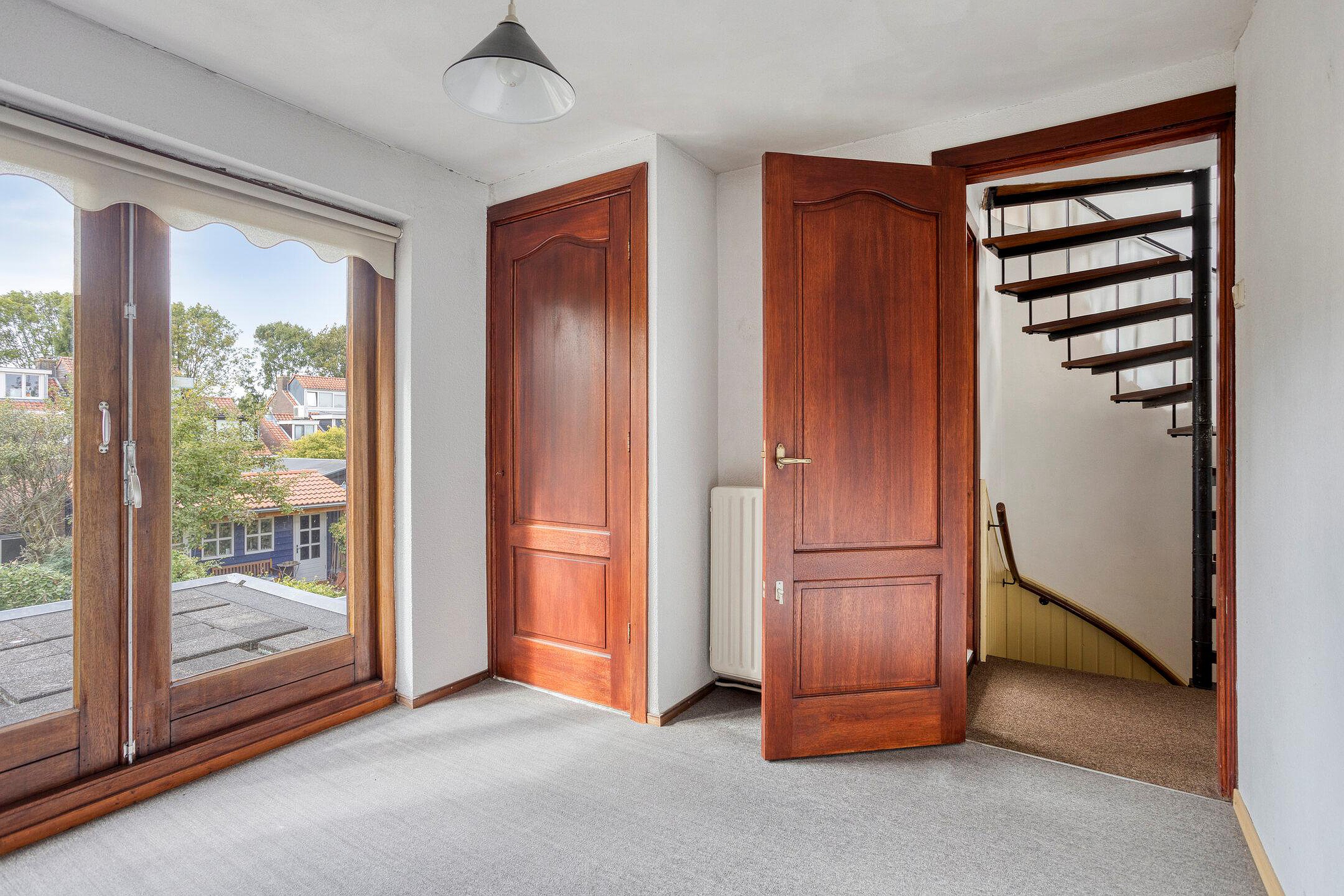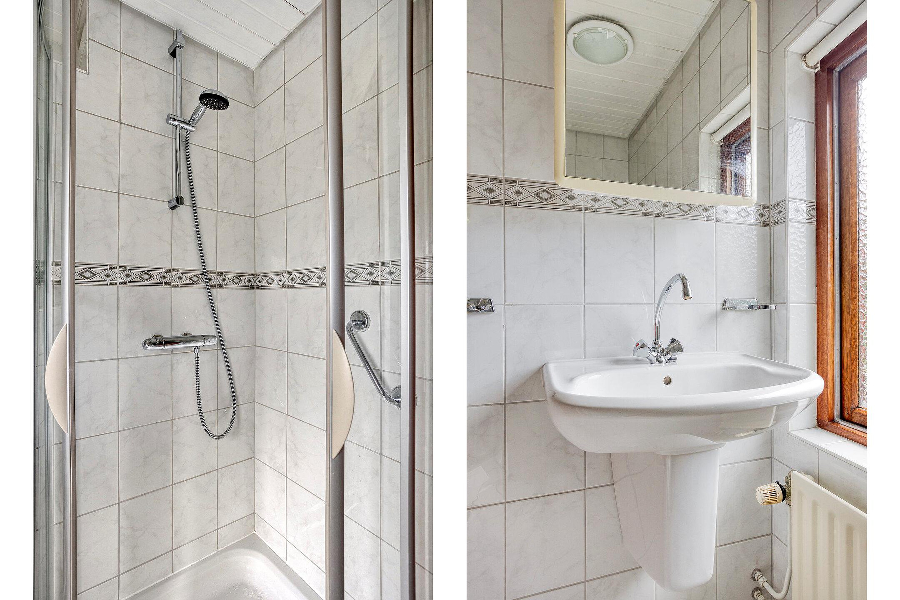 Eerste verdieping Overloop met toegang tot drie slaapkamers en badkamer voorzien van douchecabine, toilet en wastafel. De (slaap)kamer aan de achterzijde heeft openslaande deuren naar het platte dak.