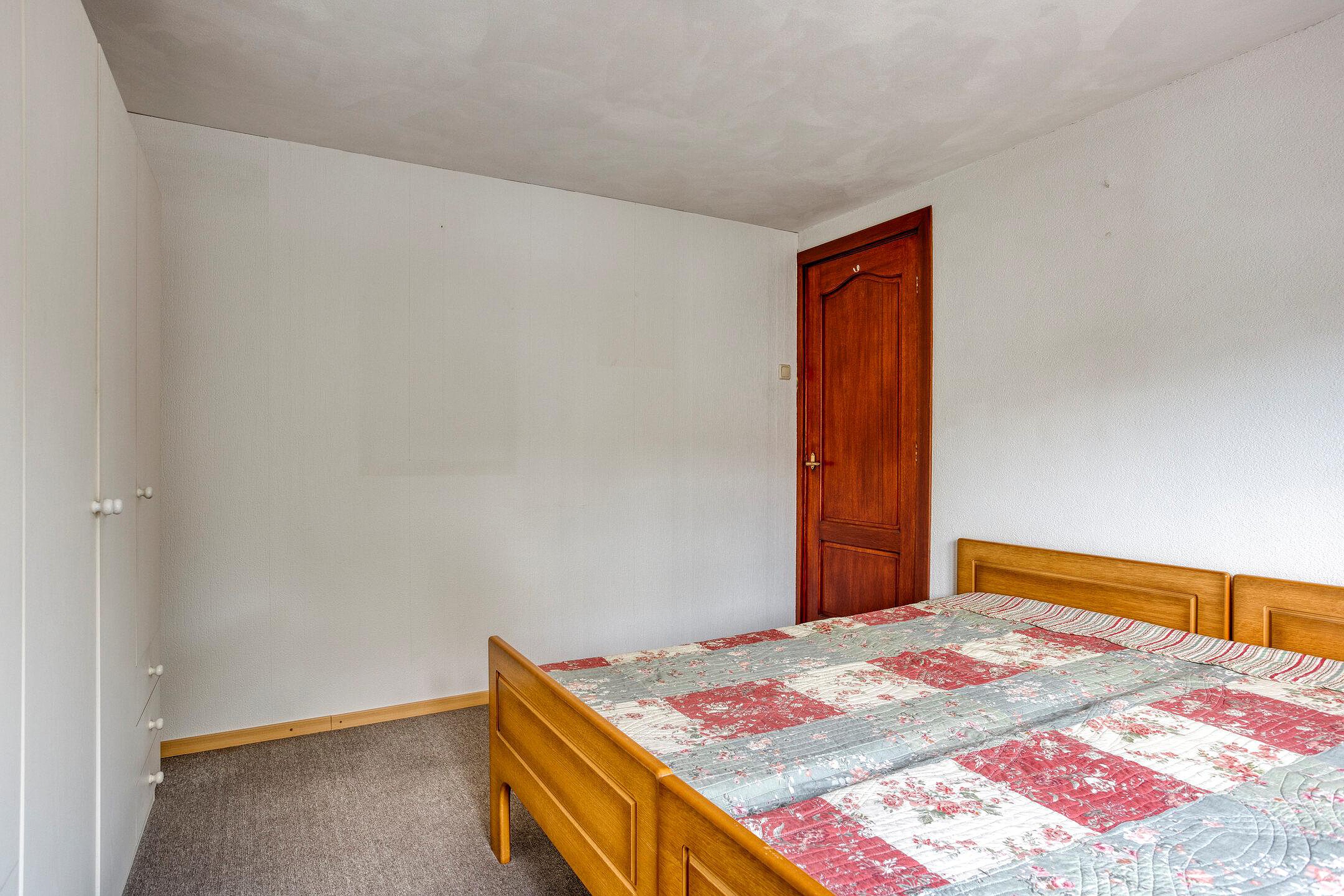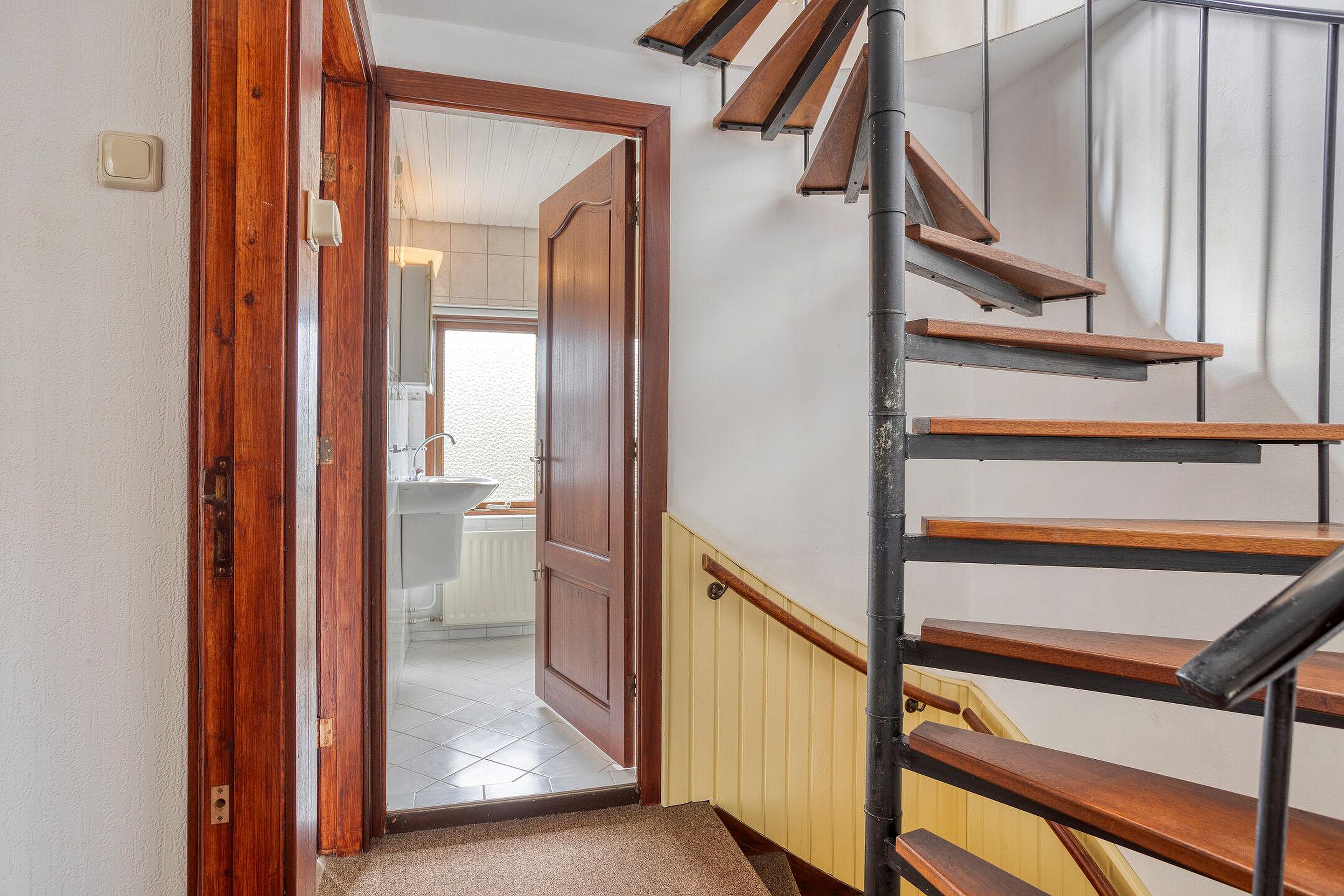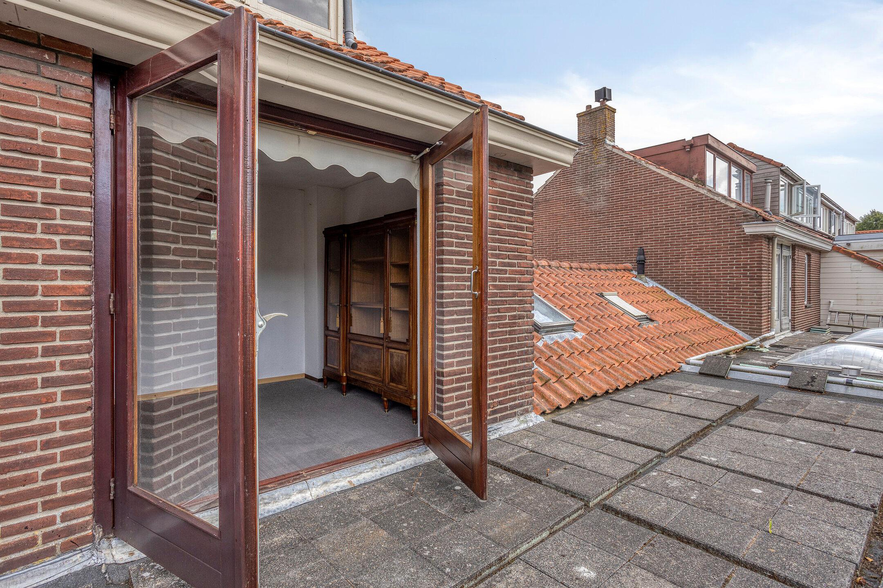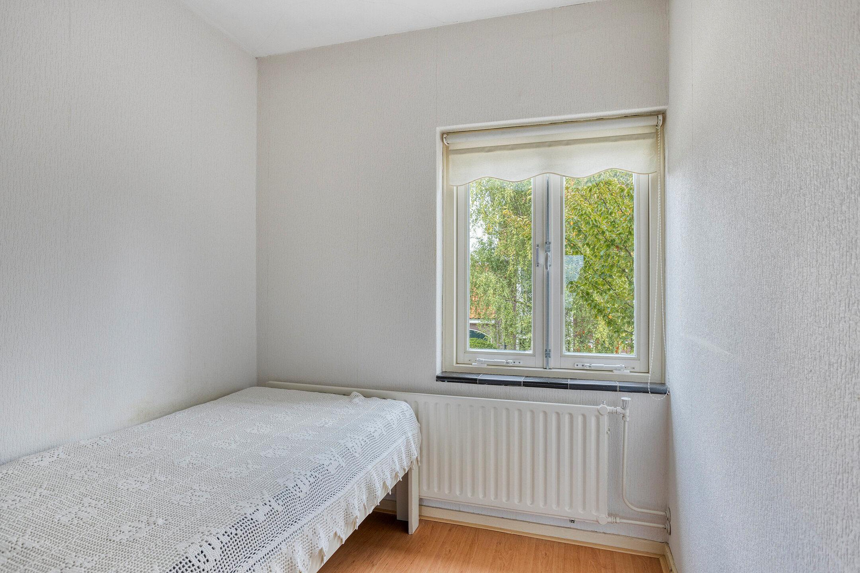 Eerste verdieping Overloop met toegang tot drie slaapkamers en badkamer voorzien van douchecabine, toilet en wastafel. De (slaap)kamer aan de achterzijde heeft openslaande deuren naar het platte dak.