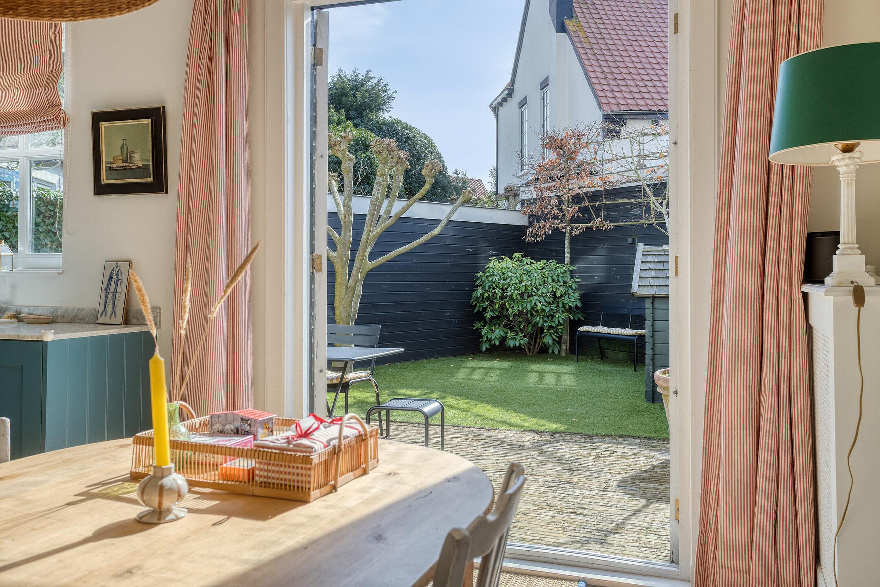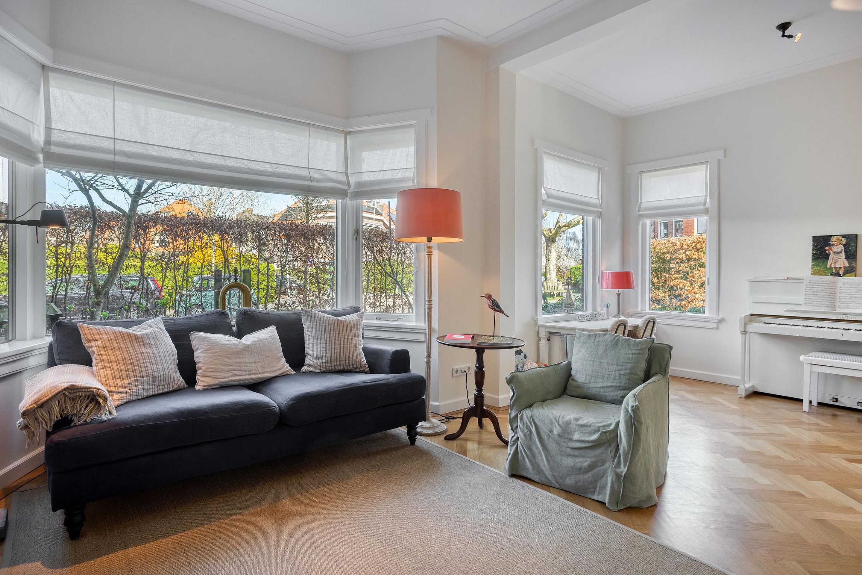 Begane grond Beschutte en groene voortuin met parkeergelegenheid op eigen terrein, zij-entree met luifel, ruime vestibule met meterkast, overlopend in de hal, met wc en kelderkast met marmerlook tegels. Aan de rechterzijde is de toegang naar de lichte woonkamer met erker, schouw, maatwerk boekenkast, visgraat parketvloer met bies en vele hoge raampartijen met een prachtig zicht op de Julianalaan en Koninginnenlaan. Aan de linkerzijde bevindt zich de U-vormige maatwerk (woon)keuken (2017) met ruim eetgedeelte, visgraat parketvloer met bies en met veel werk- en opbergruimte voorzien van alle denkbare inbouwapparatuur o.a. ijskast (2023), vaatwasser (2025), vriezer, oven, 5-pits gas kookplaat, afzuigkap en openslaande deuren naar de beschutte, groene en zonnige achtertuin op het zuiden.