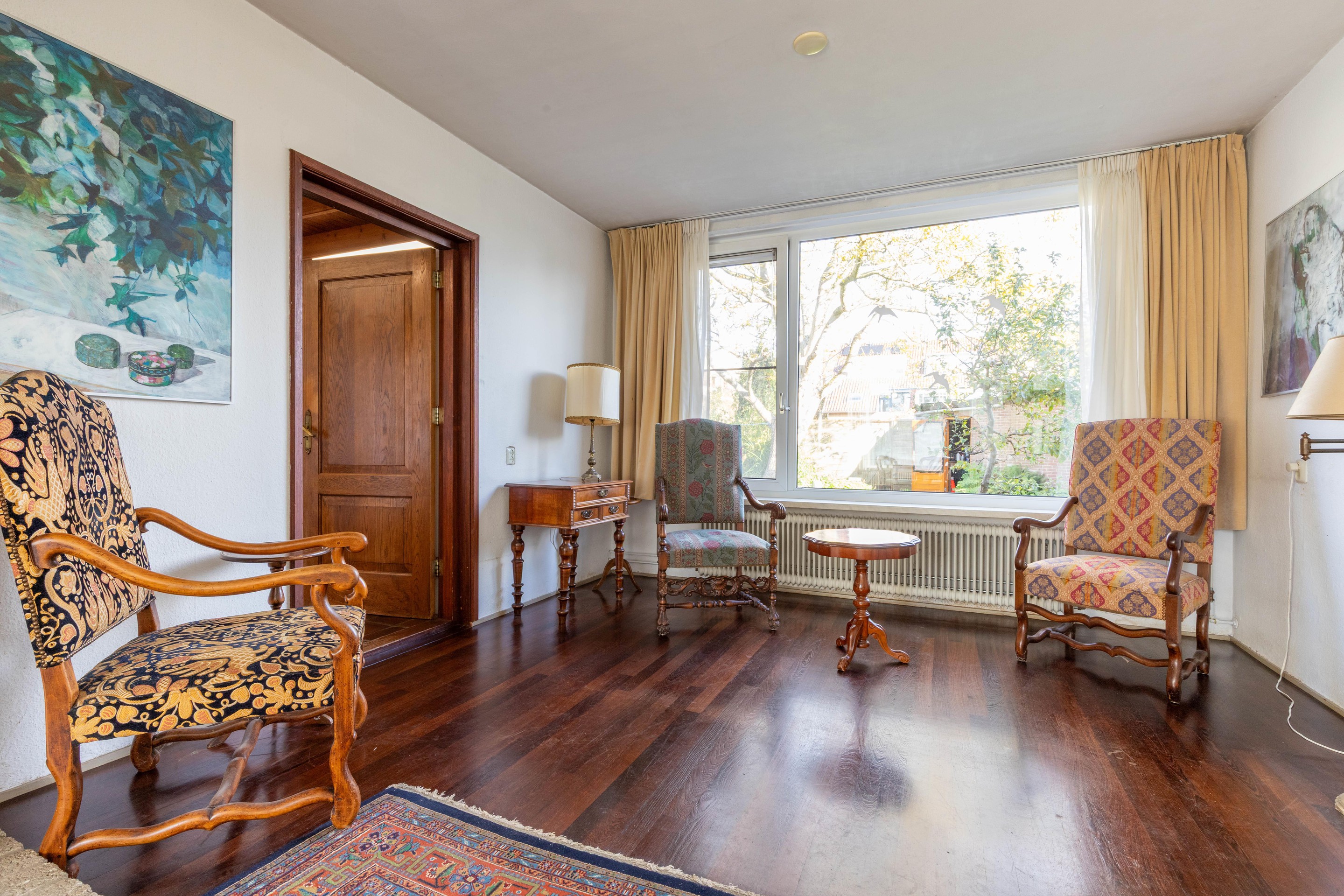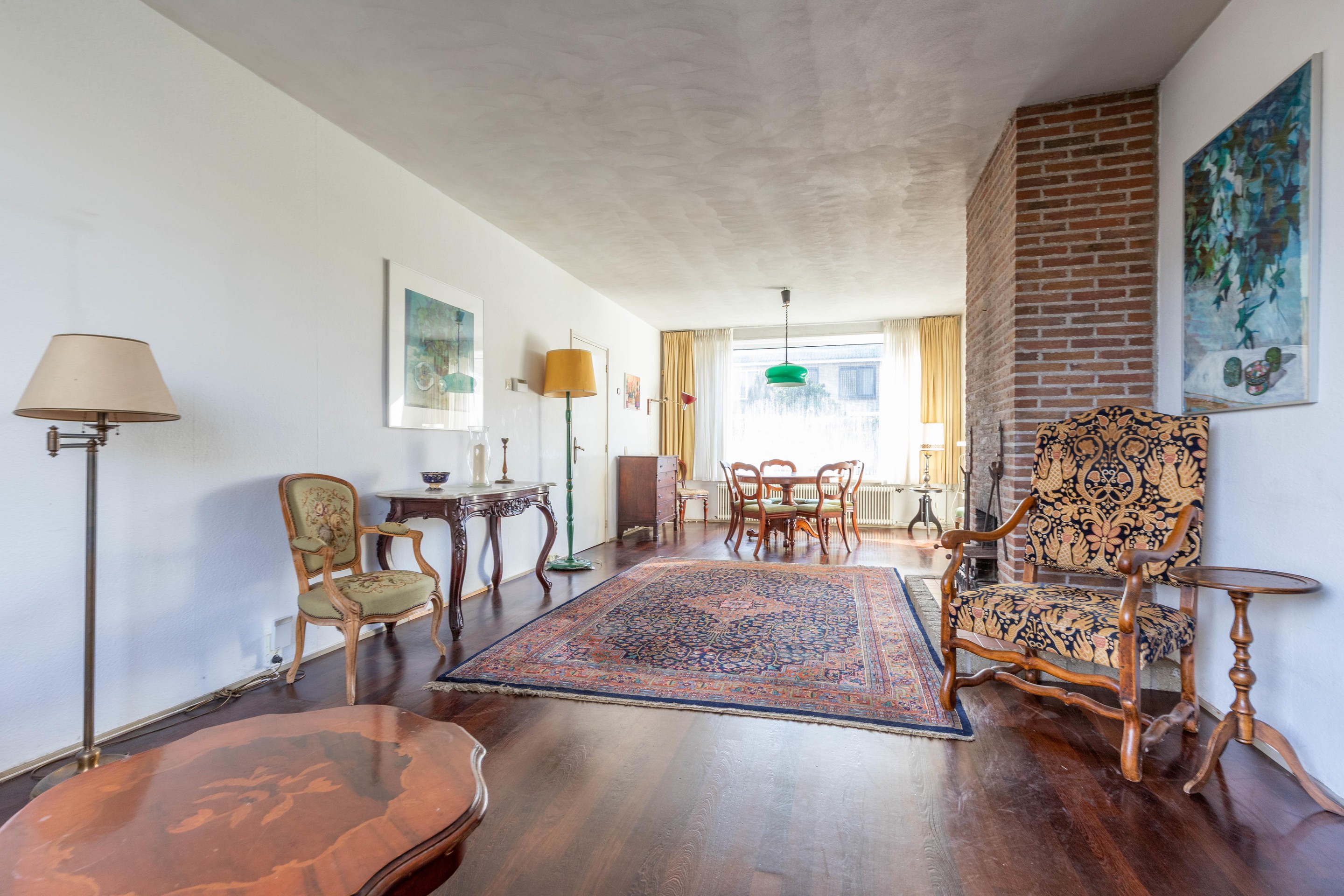 De lichte woonkamer met sfeervolle open haard strekt zich uit over de volle diepte van de woning. Grote ramen aan zowel de voor- als achterzijde zorgen voor veel daglicht en een vrij uitzicht op de groene tuin.