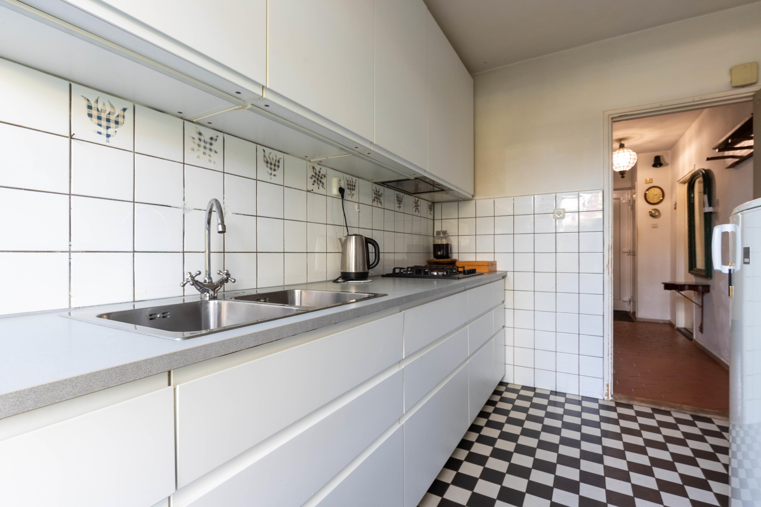 De gesloten keuken is voorzien van diverse inbouwapparatuur, een dubbele spoelbak en veel werkruimte. Dankzij de ligging aan de tuinzijde en de directe verbinding met buiten is dit een fijne plek om te koken en tegelijkertijd te genieten van het uitzicht over het groen.