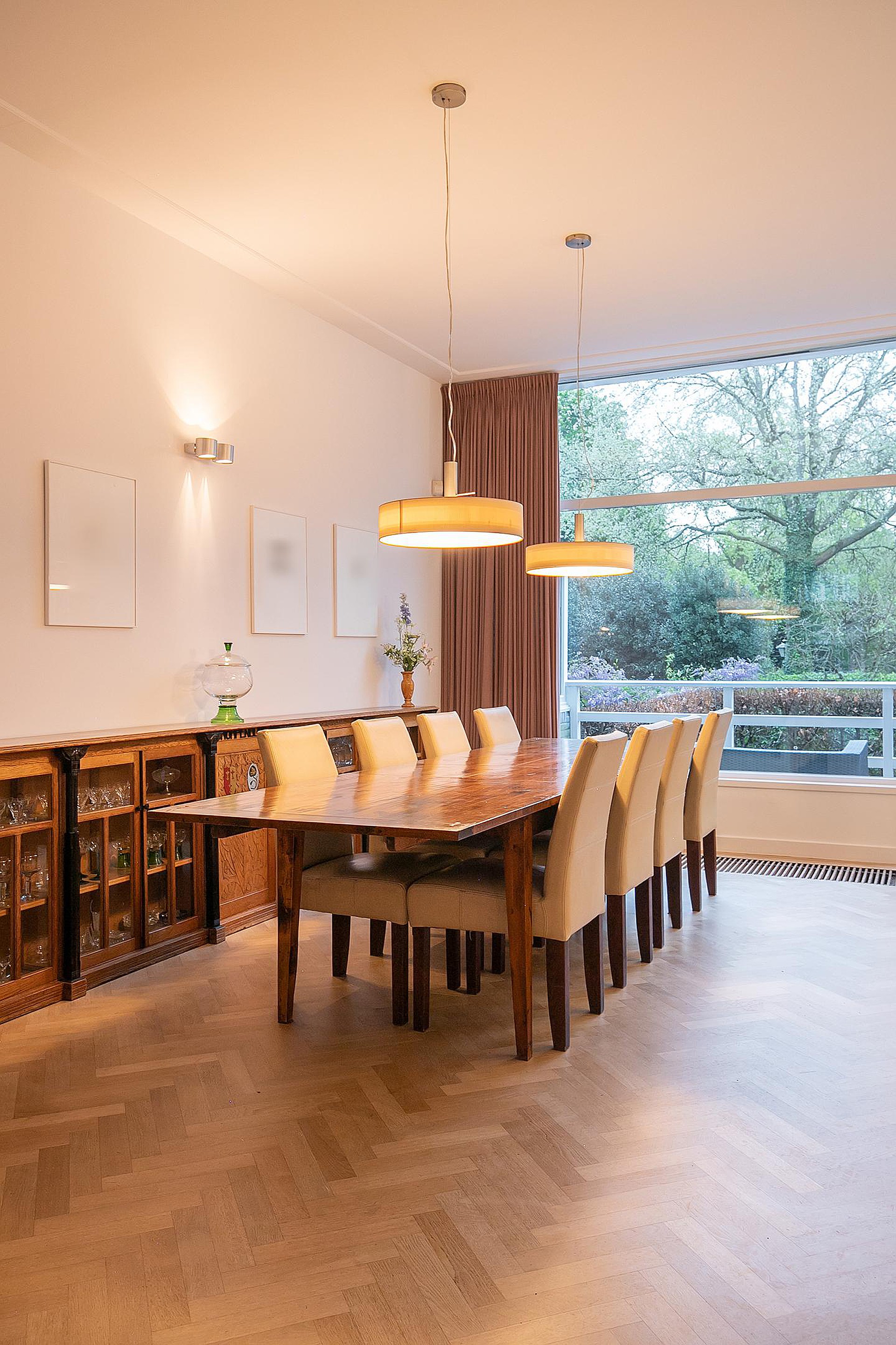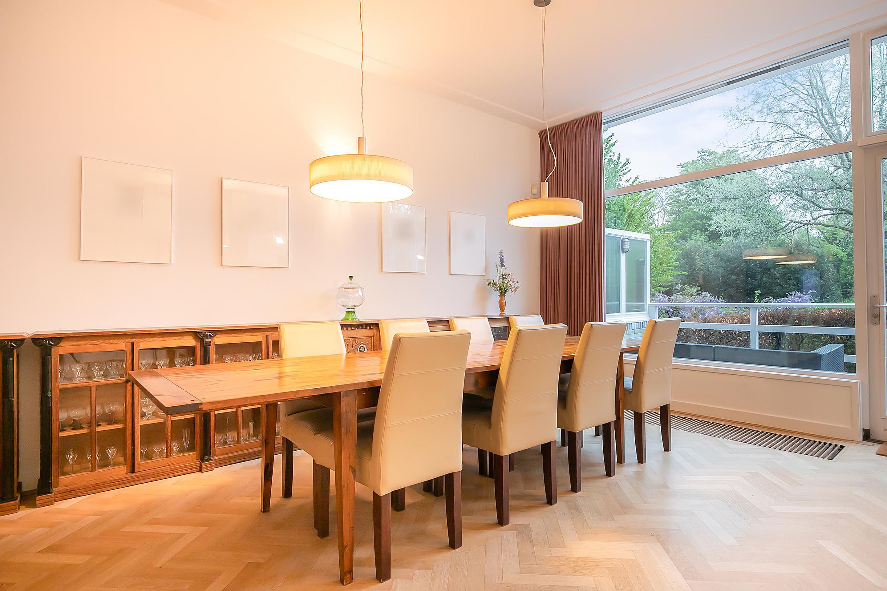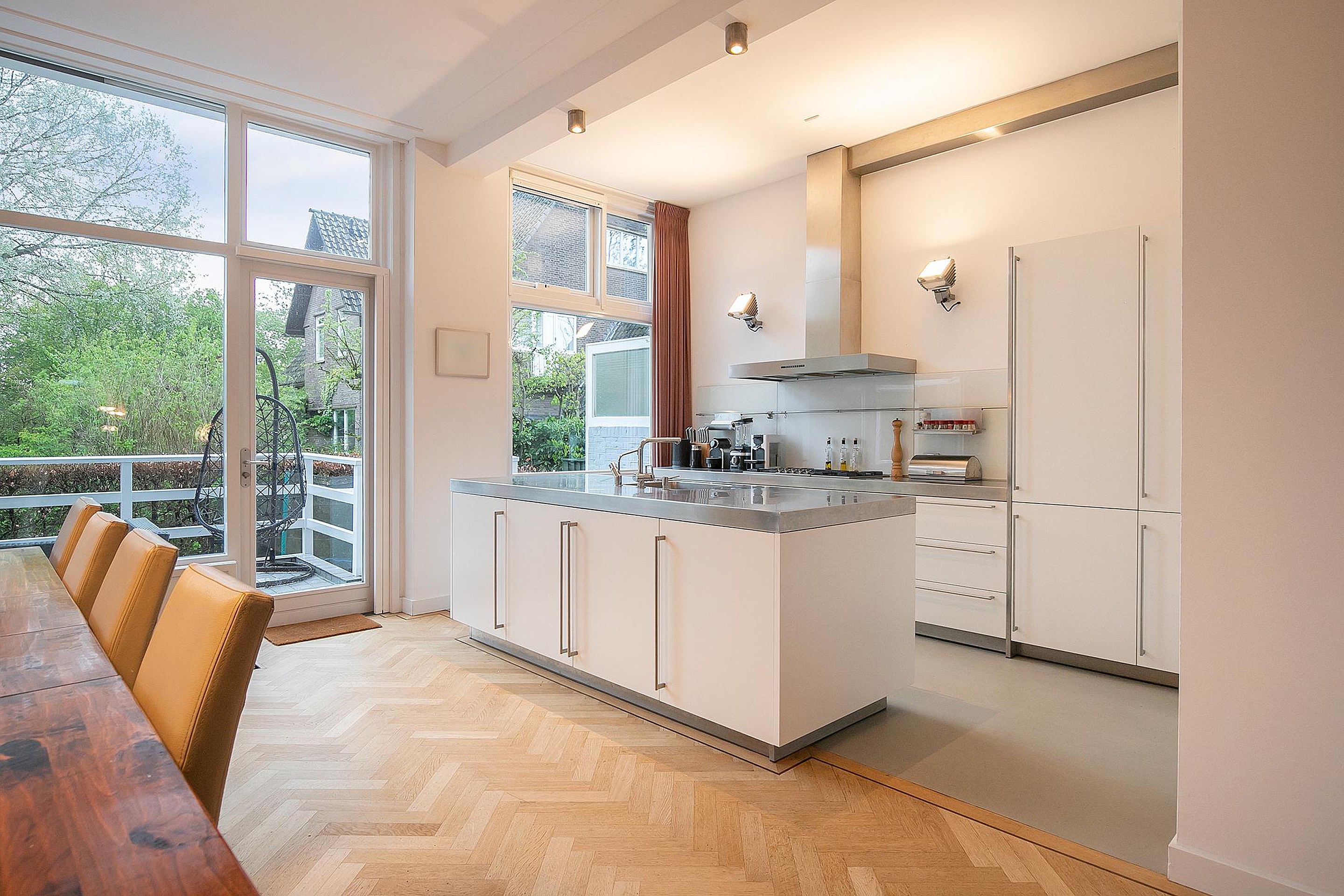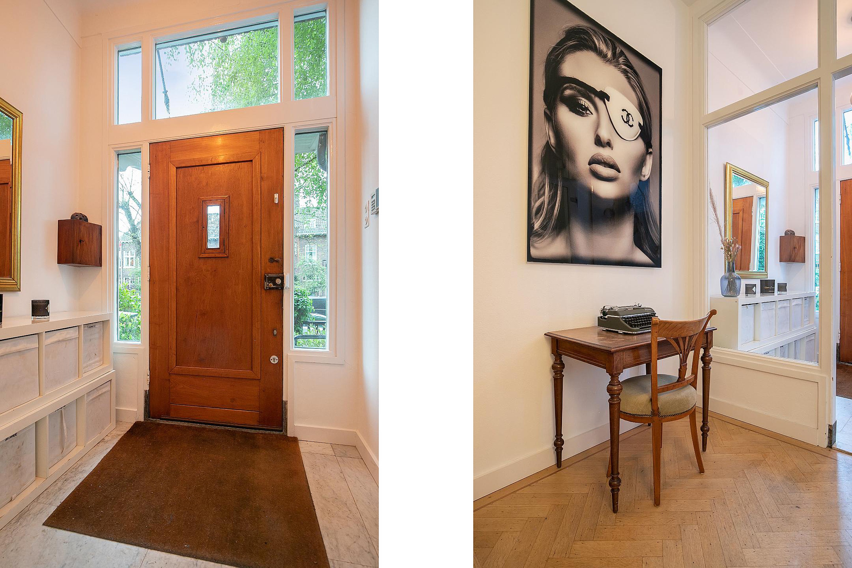 Betreed de woning via een stijlvolle vestibule die leidt naar een ruime hal met een brede trap, toegang tot een groot souterrain, een garderobe en een elegant toilet. De woonkamer heeft een imposante plafondhoogte van 3.31m en beschikt over een 360-graden draaibare houtkachel, openslaande deur naar de veranda en de tuin. De open Bulthaup keuken is voorzien van inbouwapparatuur voor al uw culinaire avonturen.
