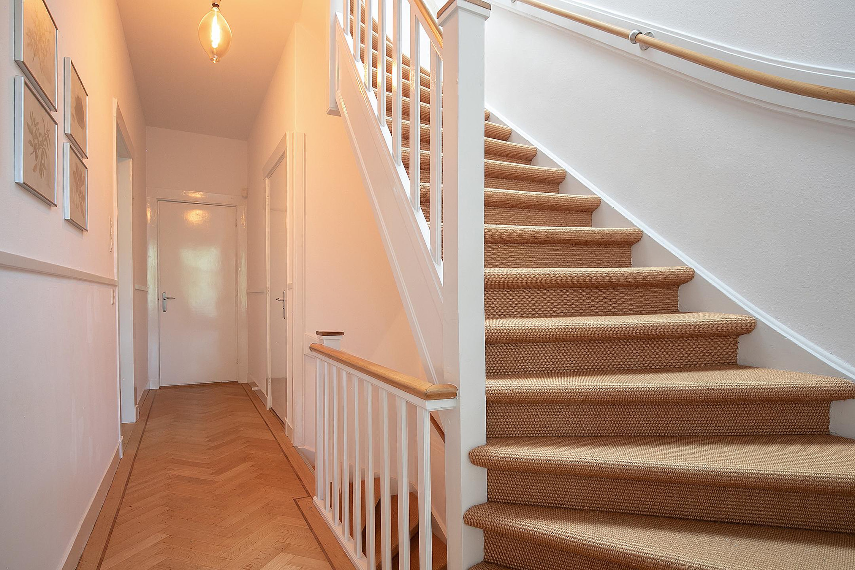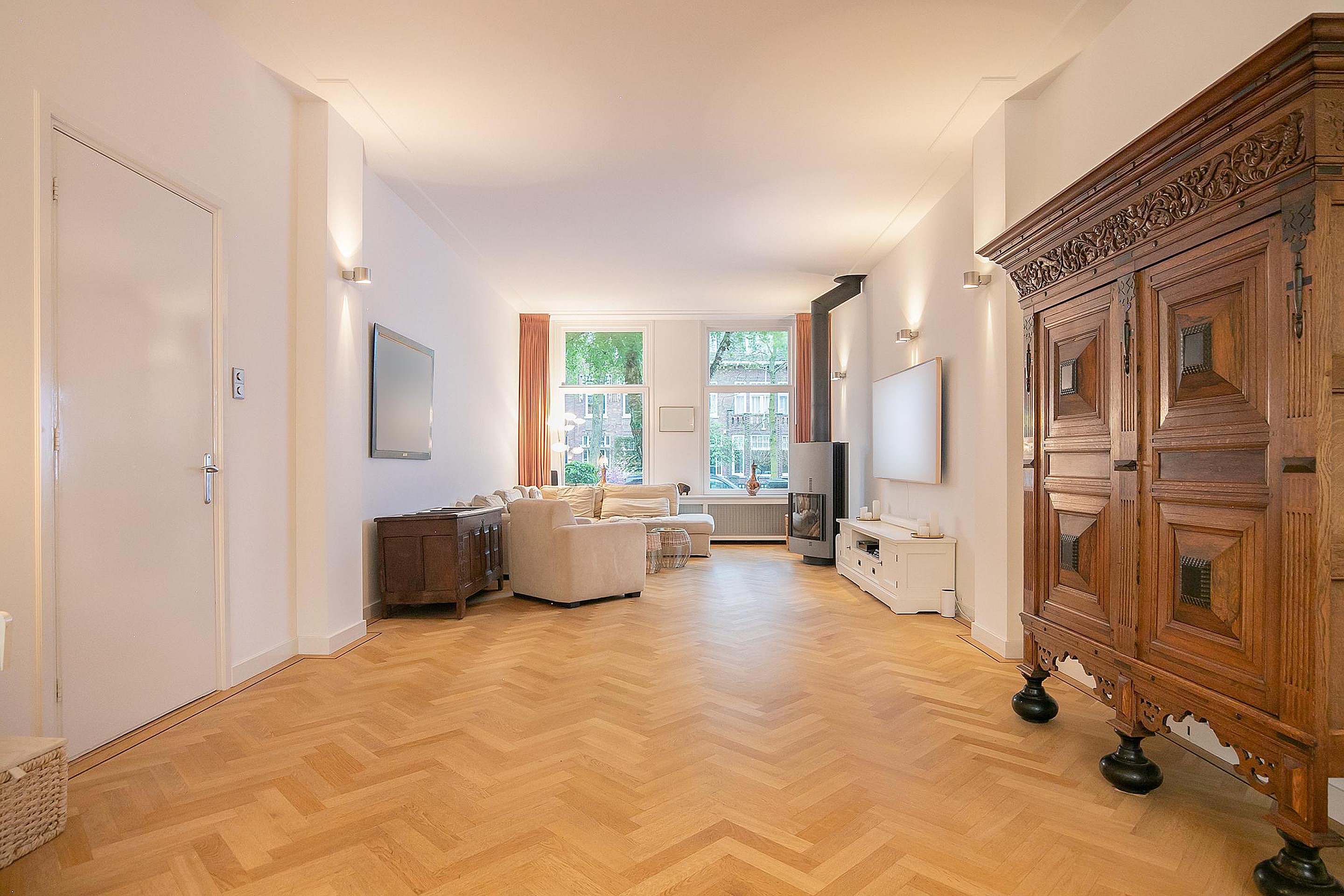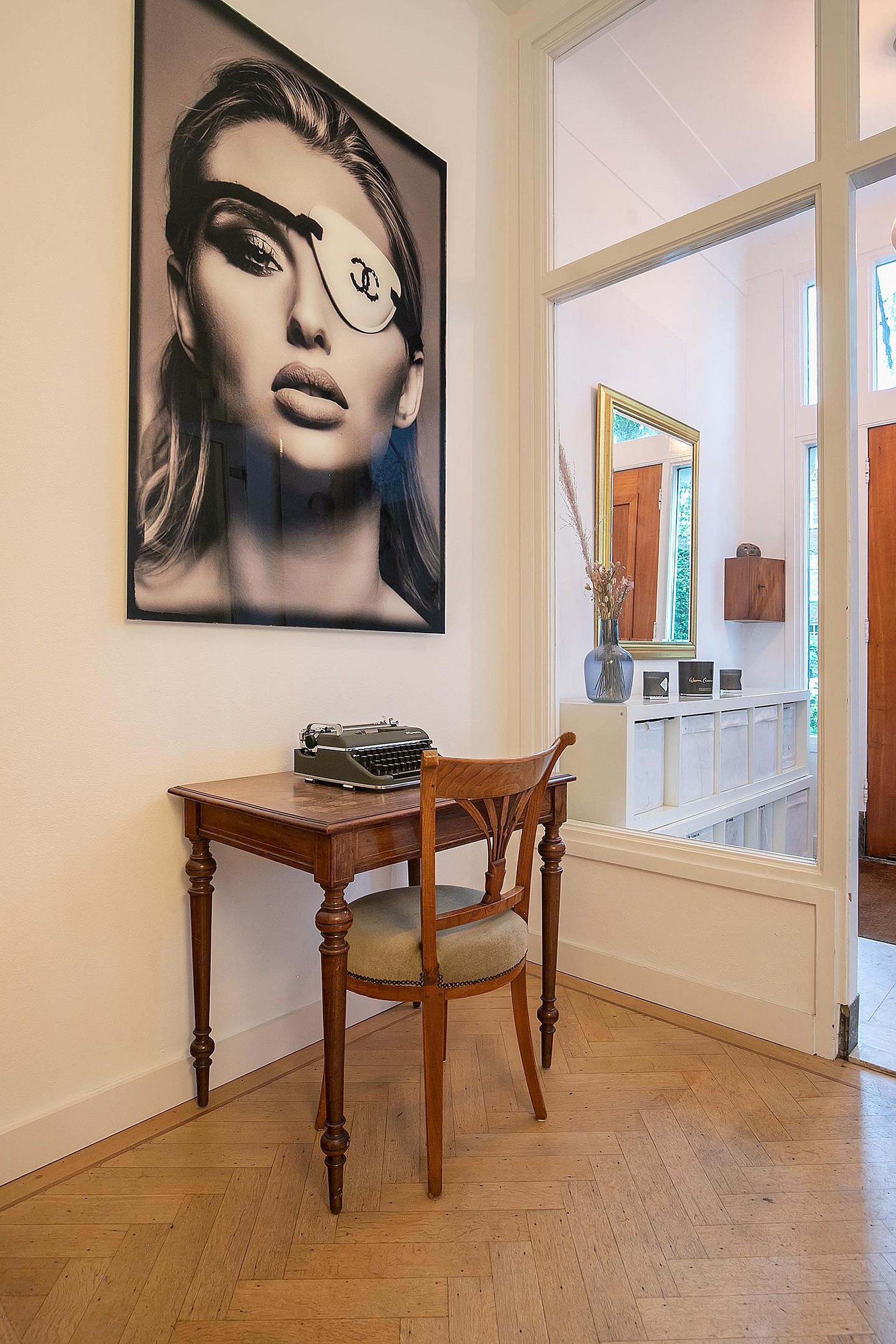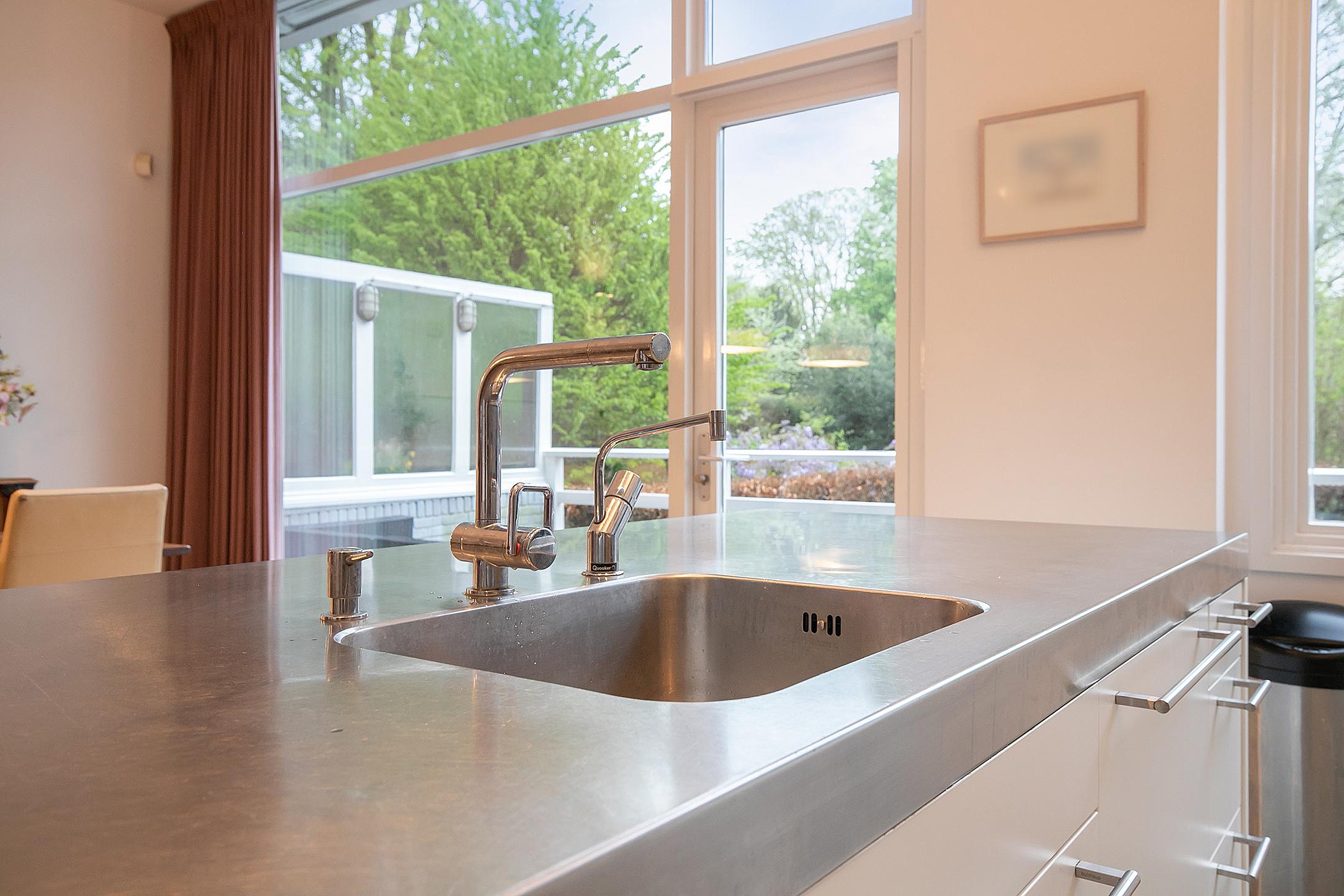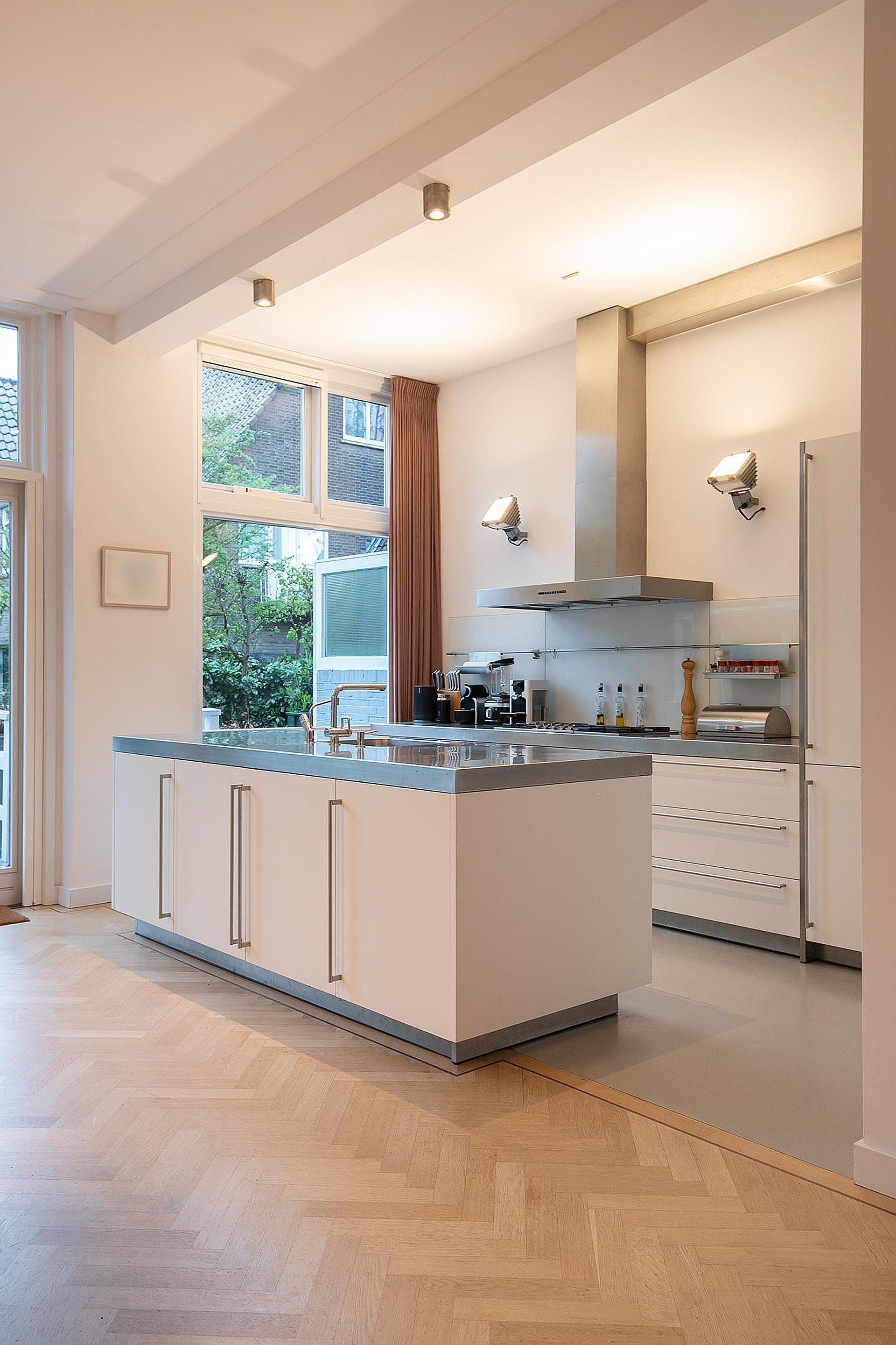Betreed de woning via een stijlvolle vestibule die leidt naar een ruime hal met een brede trap, toegang tot een groot souterrain, een garderobe en een elegant toilet. De woonkamer heeft een imposante plafondhoogte van 3.31m en beschikt over een 360-graden draaibare houtkachel, openslaande deur naar de veranda en de tuin. De open Bulthaup keuken is voorzien van inbouwapparatuur voor al uw culinaire avonturen.