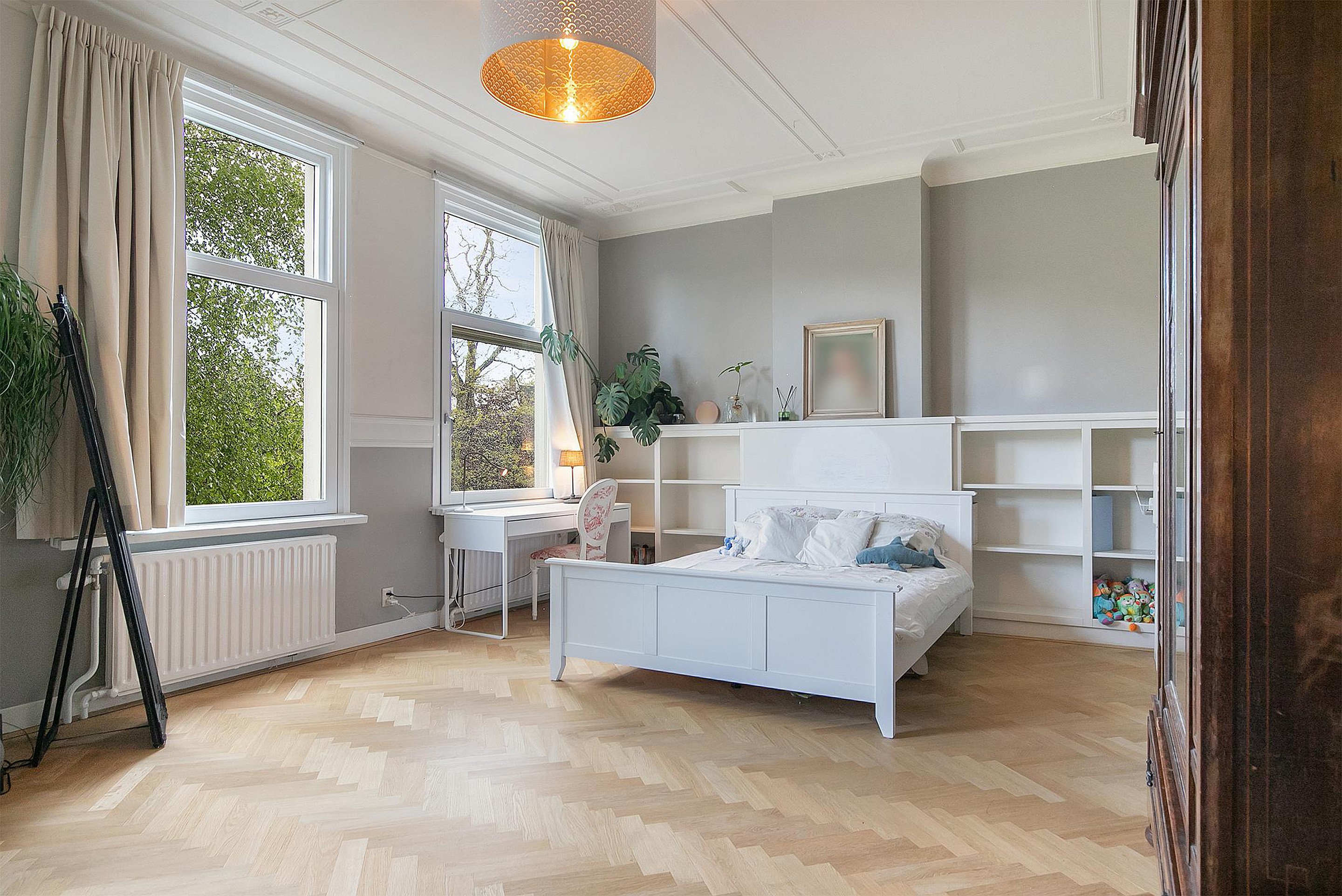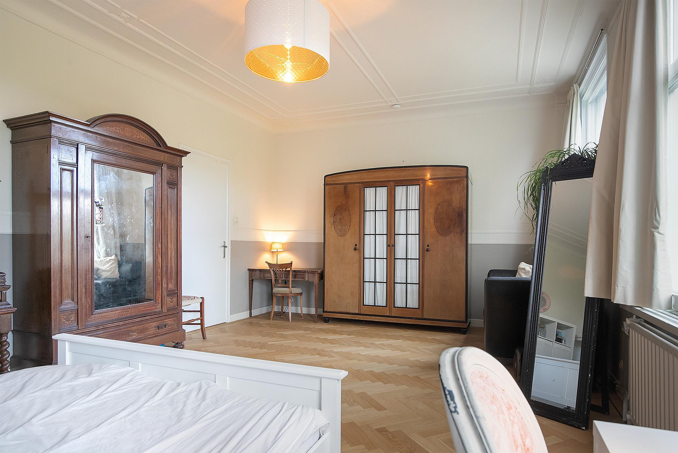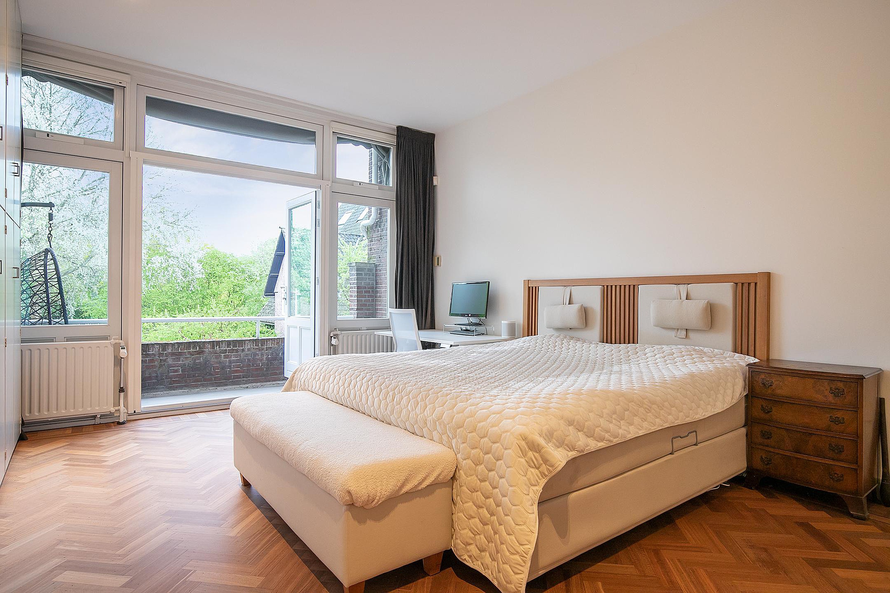 Een ruime overloop brengt u naar de hoofdslaapkamer aan de achterzijde, compleet met balkon, lange kastenwand en een en-suite badkamer die luxe uitstraalt. De kamer aan de voorzijde strekt zich uit over de volle breedte van het huis en is voorzien van een charmante parketvloer en authentiek plafond. De achter-zijkamer heeft een vaste boekenkast. Tweede toilet op de gang.