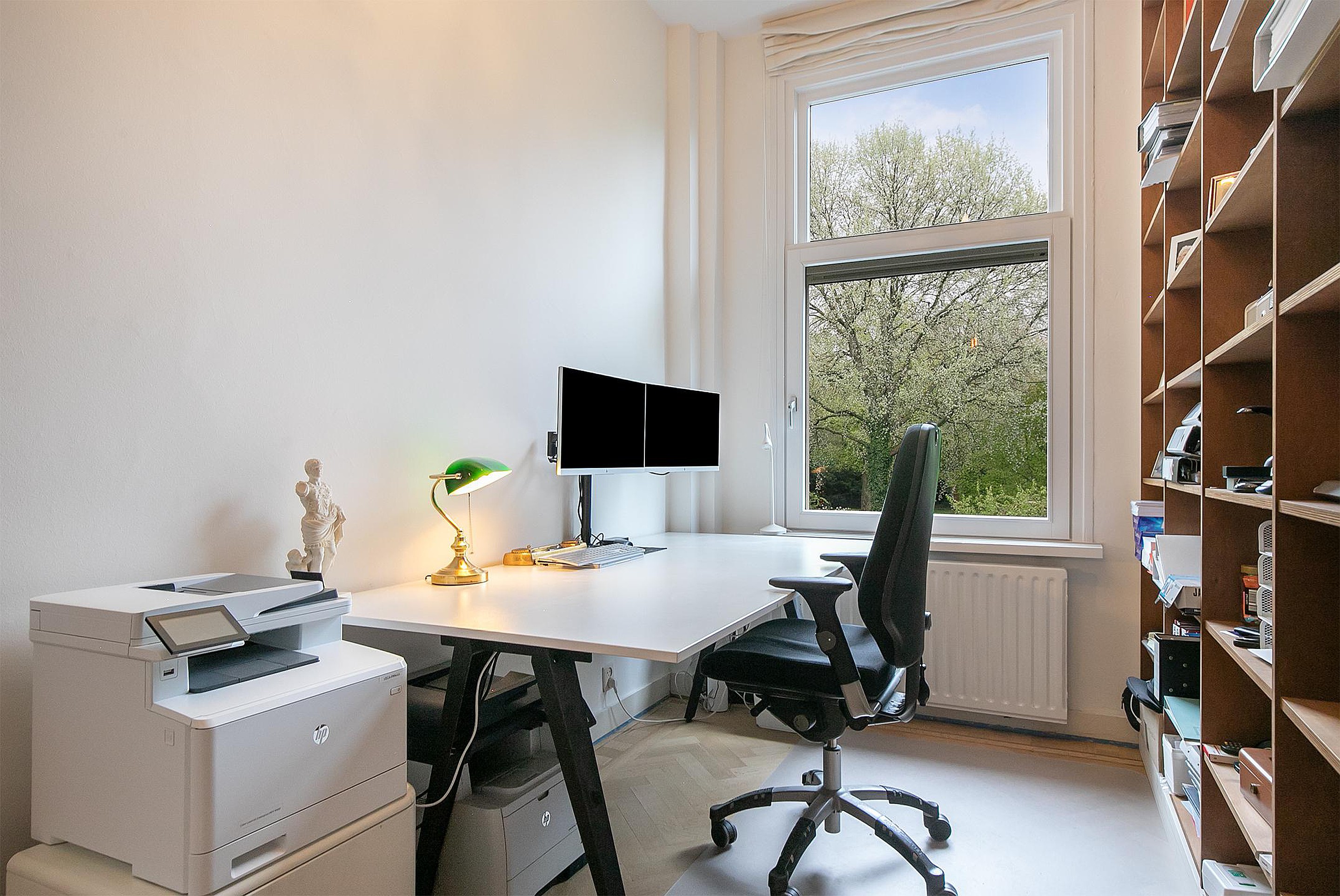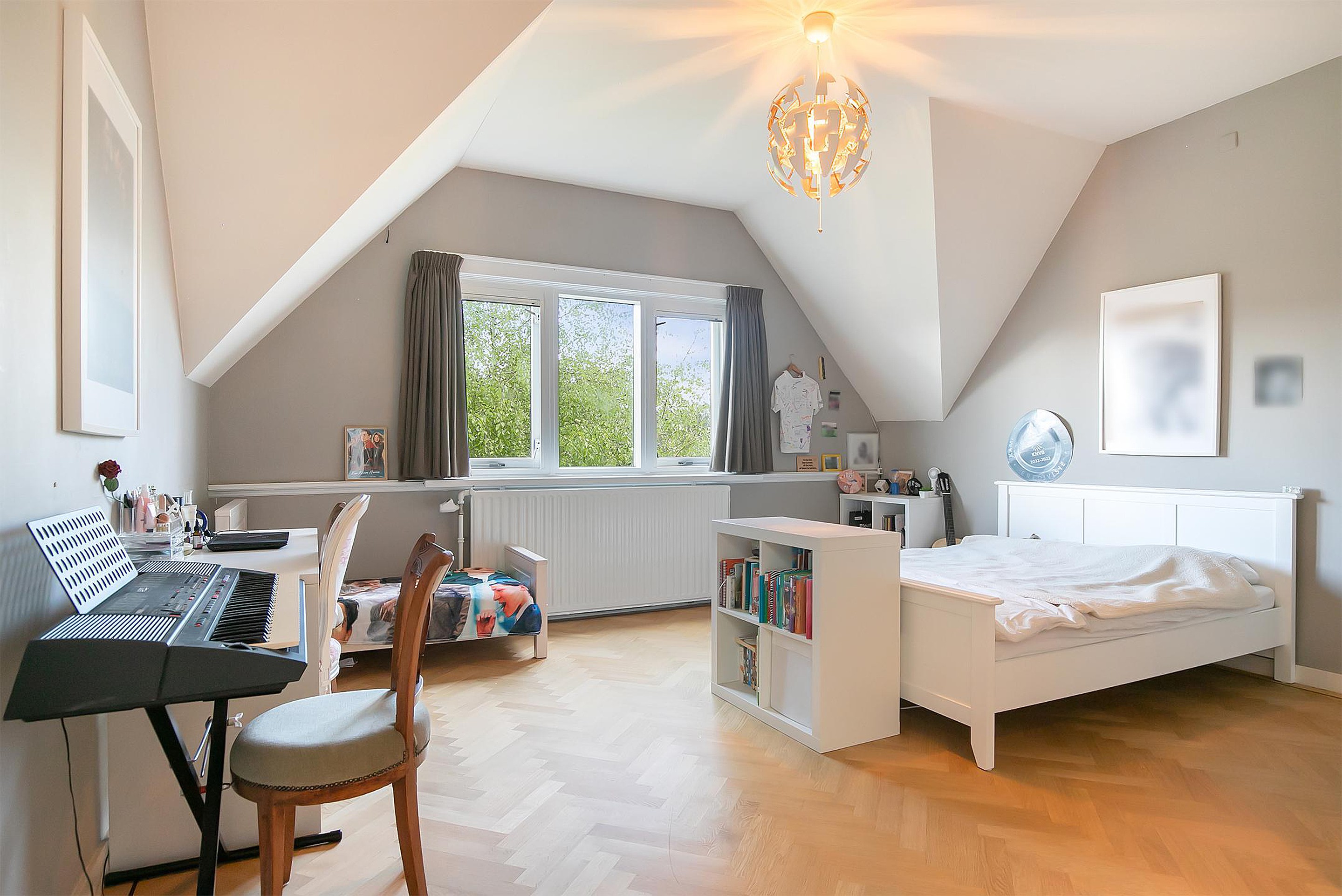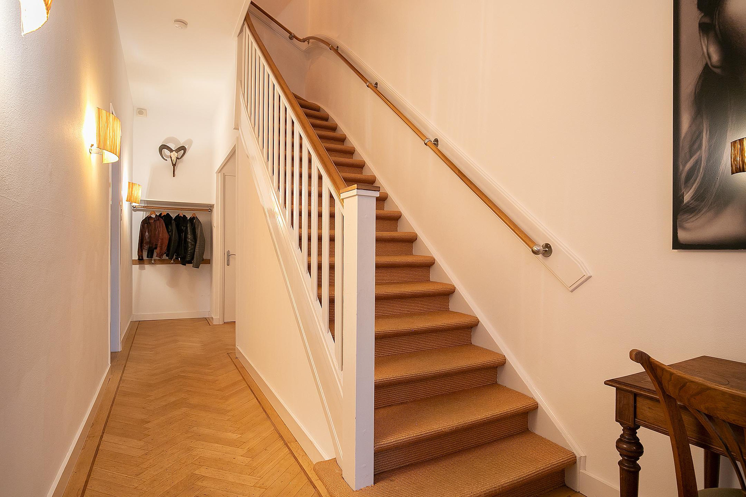 Een ruime overloop brengt u naar de hoofdslaapkamer aan de achterzijde, compleet met balkon, lange kastenwand en een en-suite badkamer die luxe uitstraalt. De kamer aan de voorzijde strekt zich uit over de volle breedte van het huis en is voorzien van een charmante parketvloer en authentiek plafond. De achter-zijkamer heeft een vaste boekenkast. Tweede toilet op de gang.