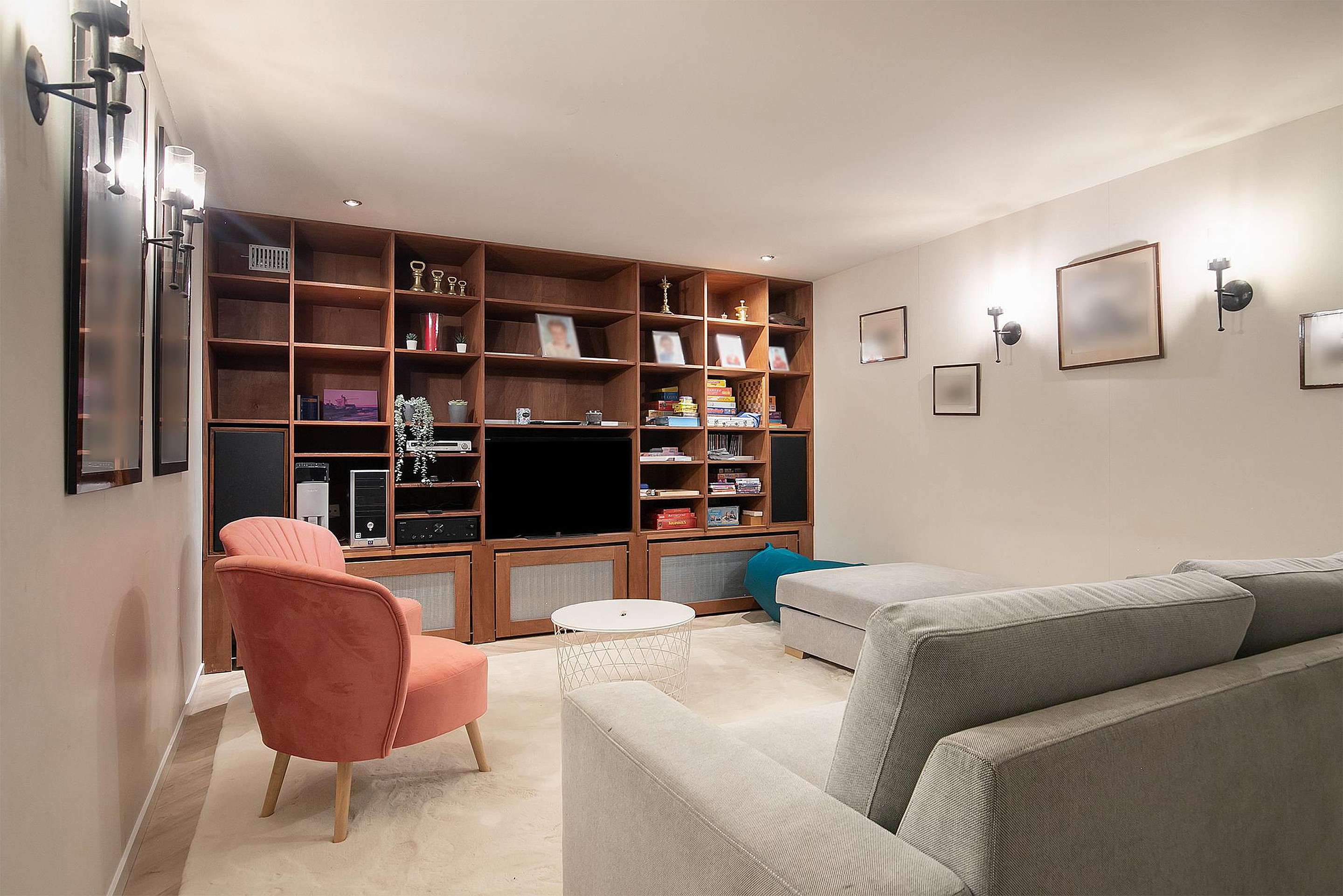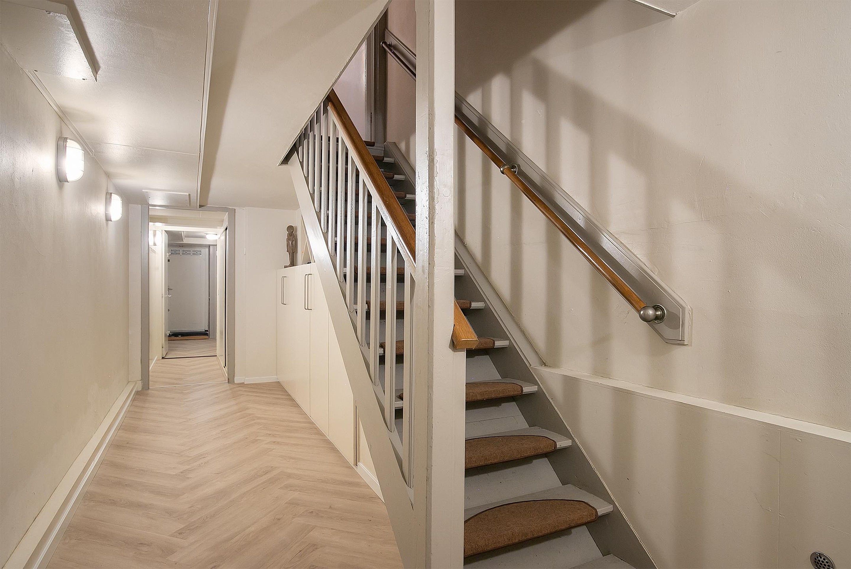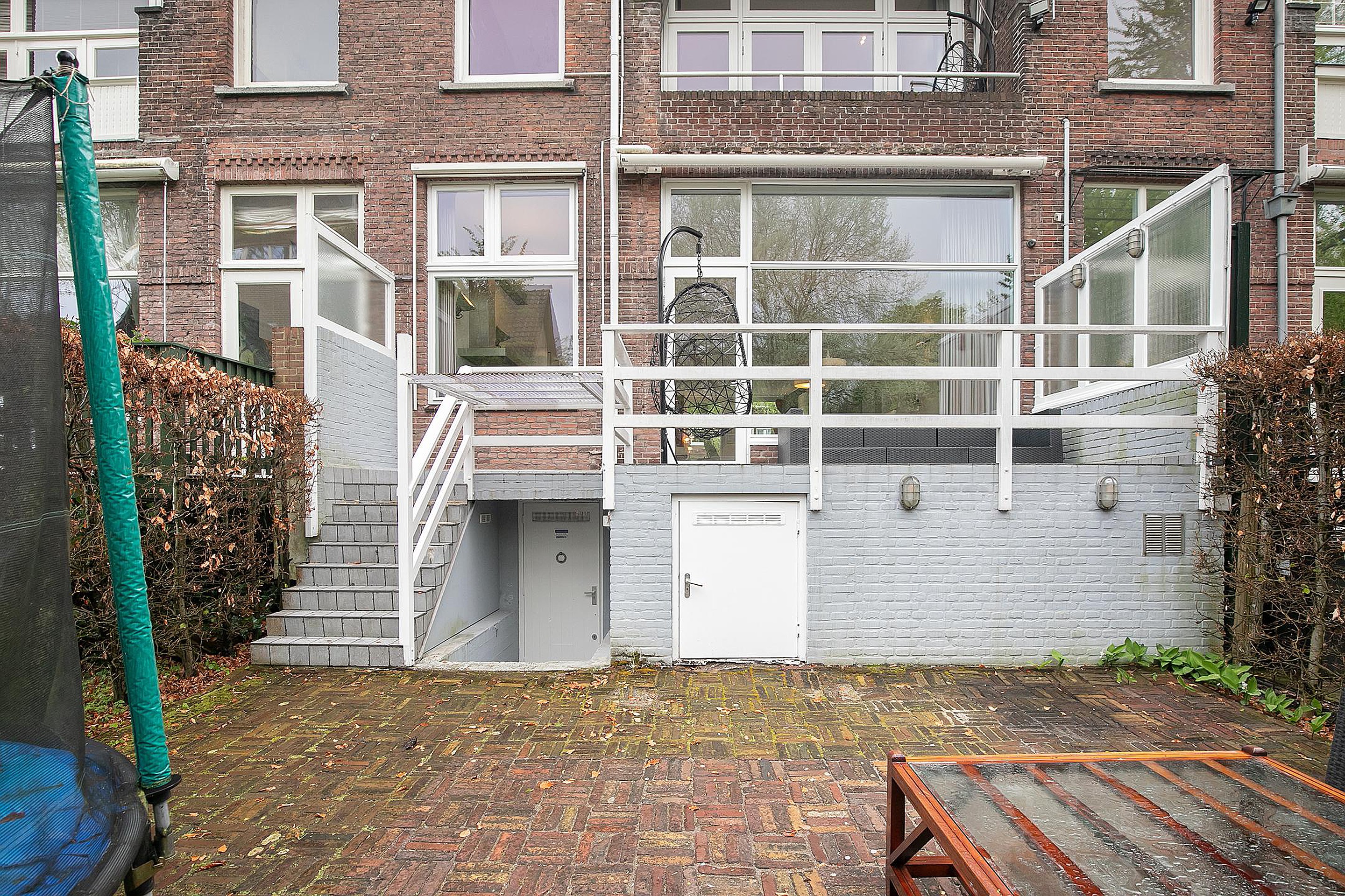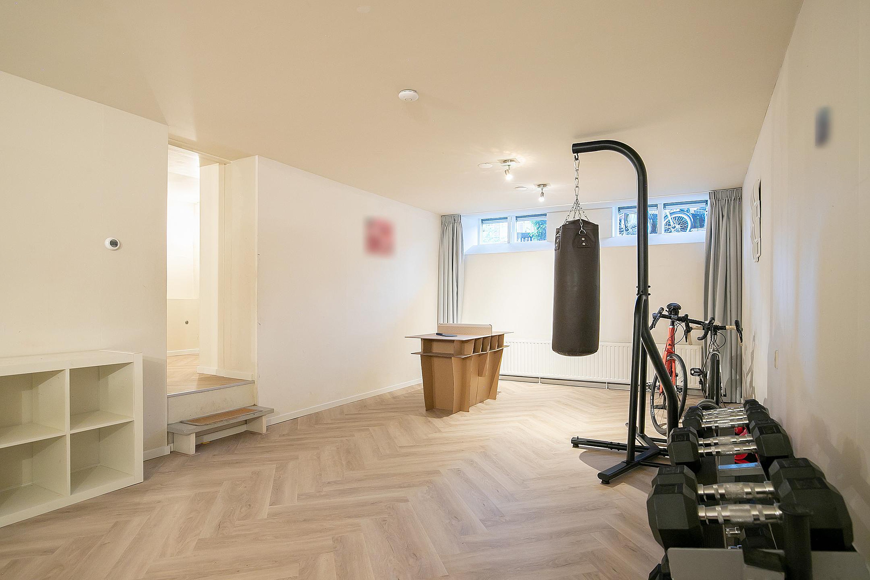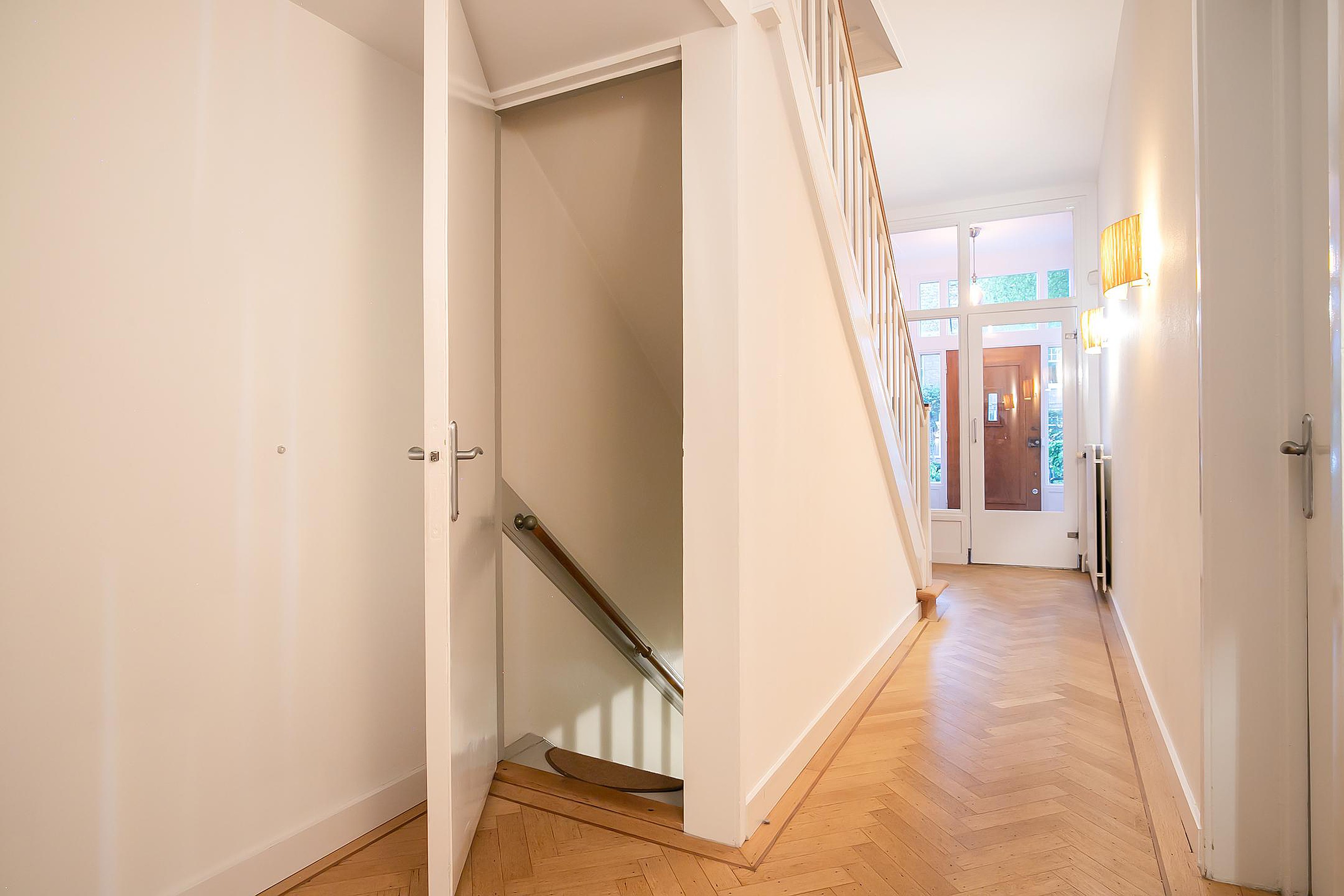 Hal met veel vaste kasten en een wasruimte met wasmachine, droger en tweede vaatwasser. De functionele ruimte (geschikt als thuiskantoor of -bioscoop of een speelruimte voor kinderen) heeft vaste kasten en een stahoogte van 2.35 meter(!) en een grote inpandige berging met ruimte voor fietsen, waar ook extra koel / vrieskasten staan. Dit niveau heeft ook directe toegang tot de achtertuin.