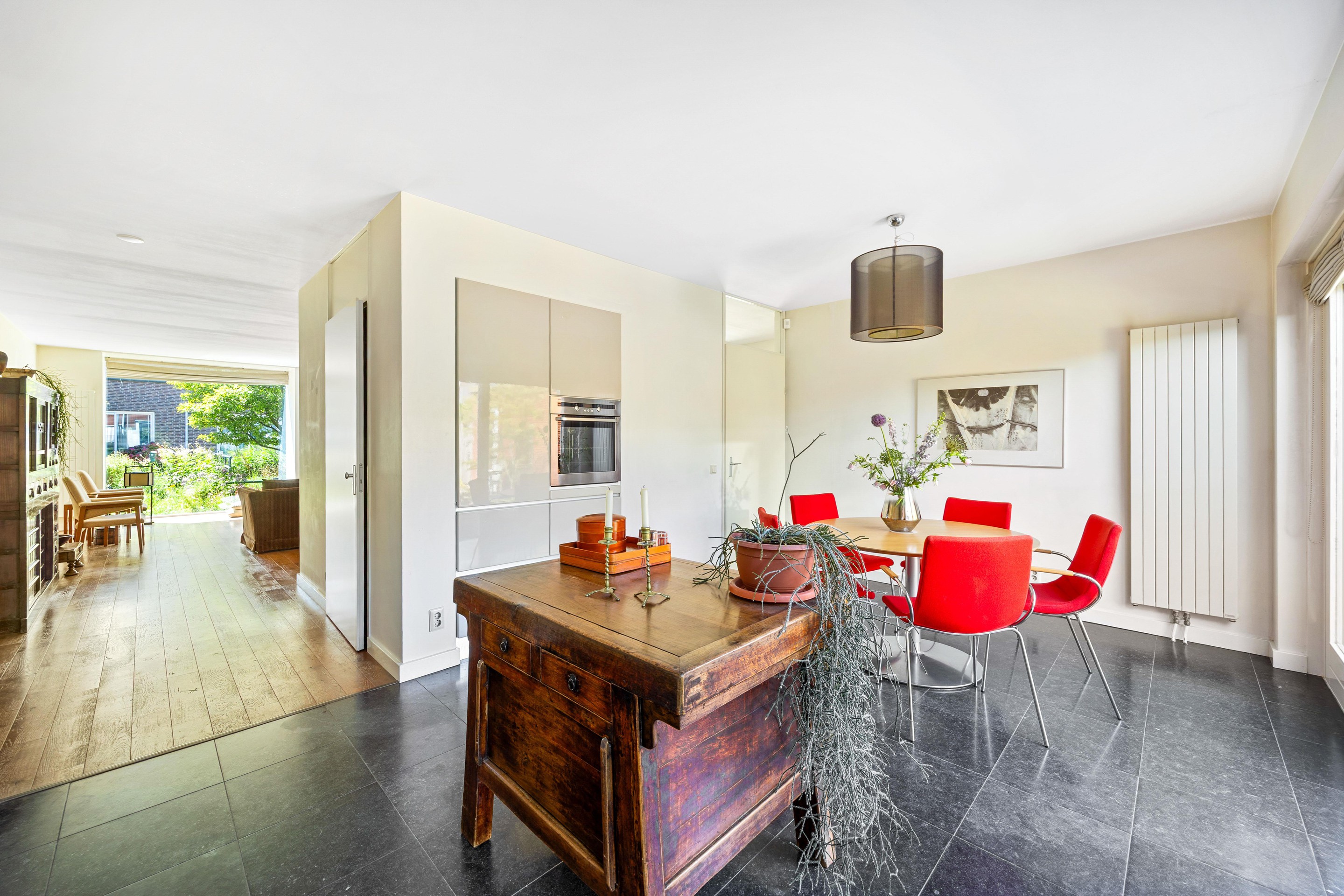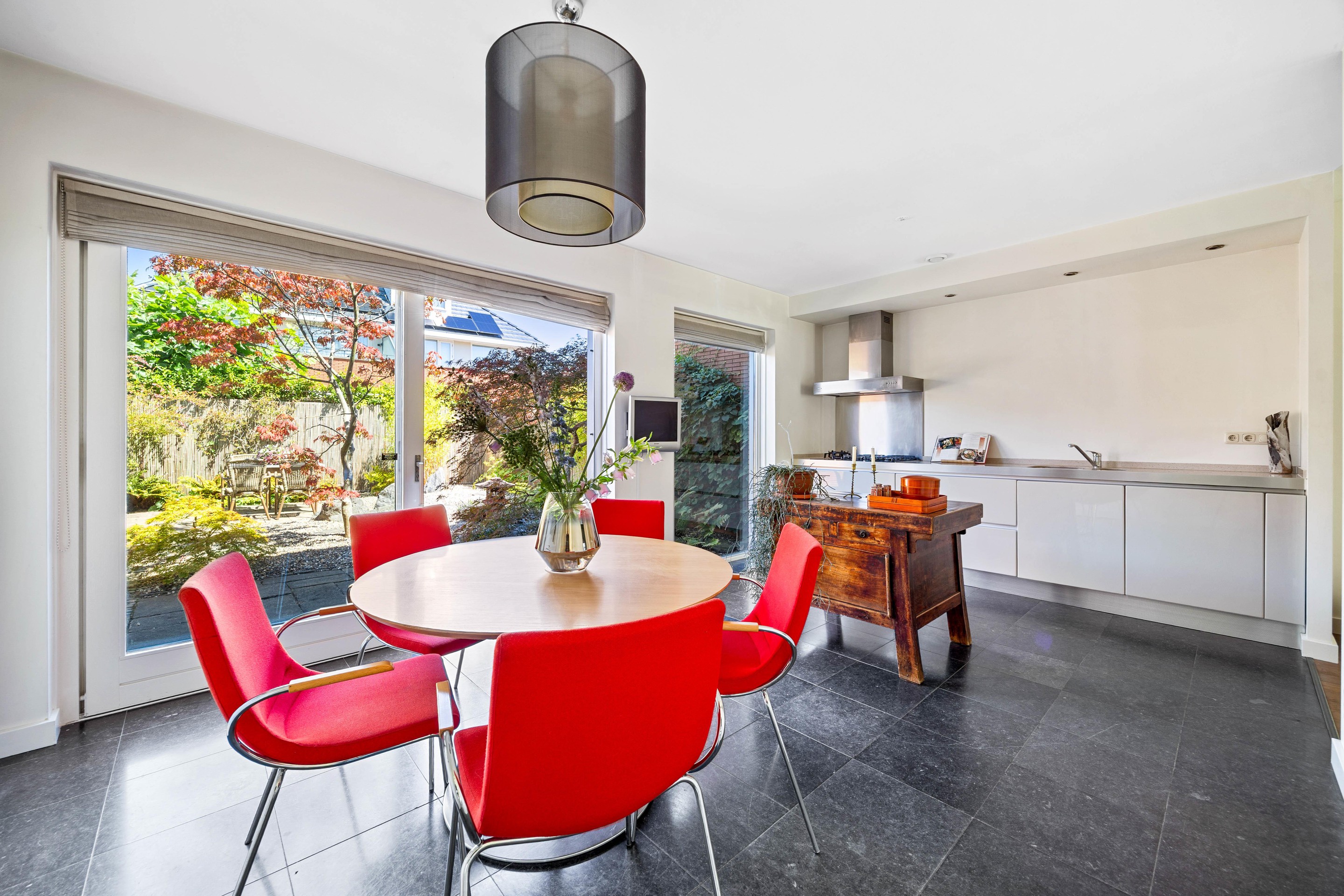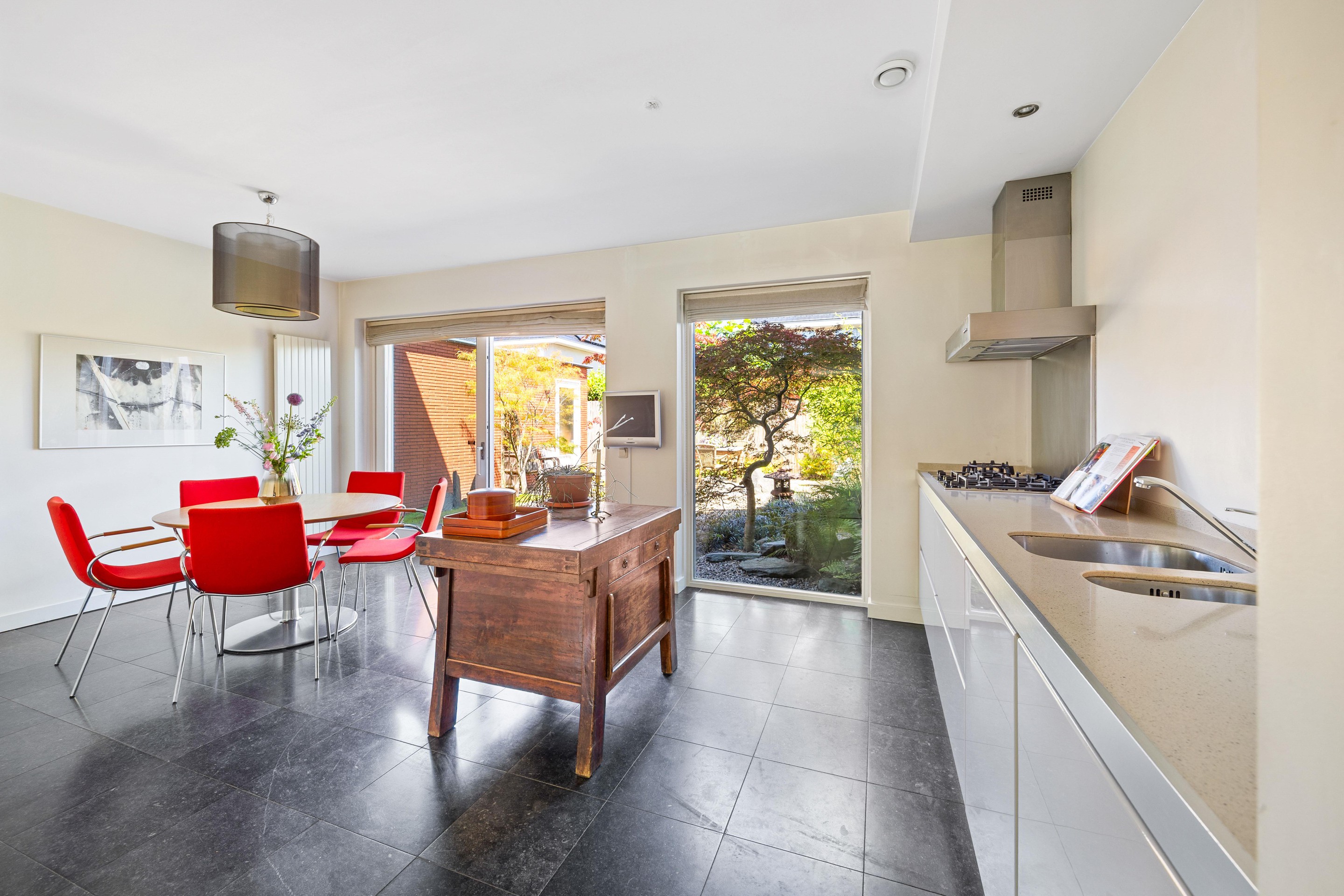 Aan de achterzijde is en grote glazen schuifpui naar de tuin en een extra raam dat hier speciaal is geplaatst om ook vanuit de woonkamer te kunnen genieten van de Japanse tuin. Tussen de keuken en de woonkamer vindt u nog een grote inbouwkast onder de trap.