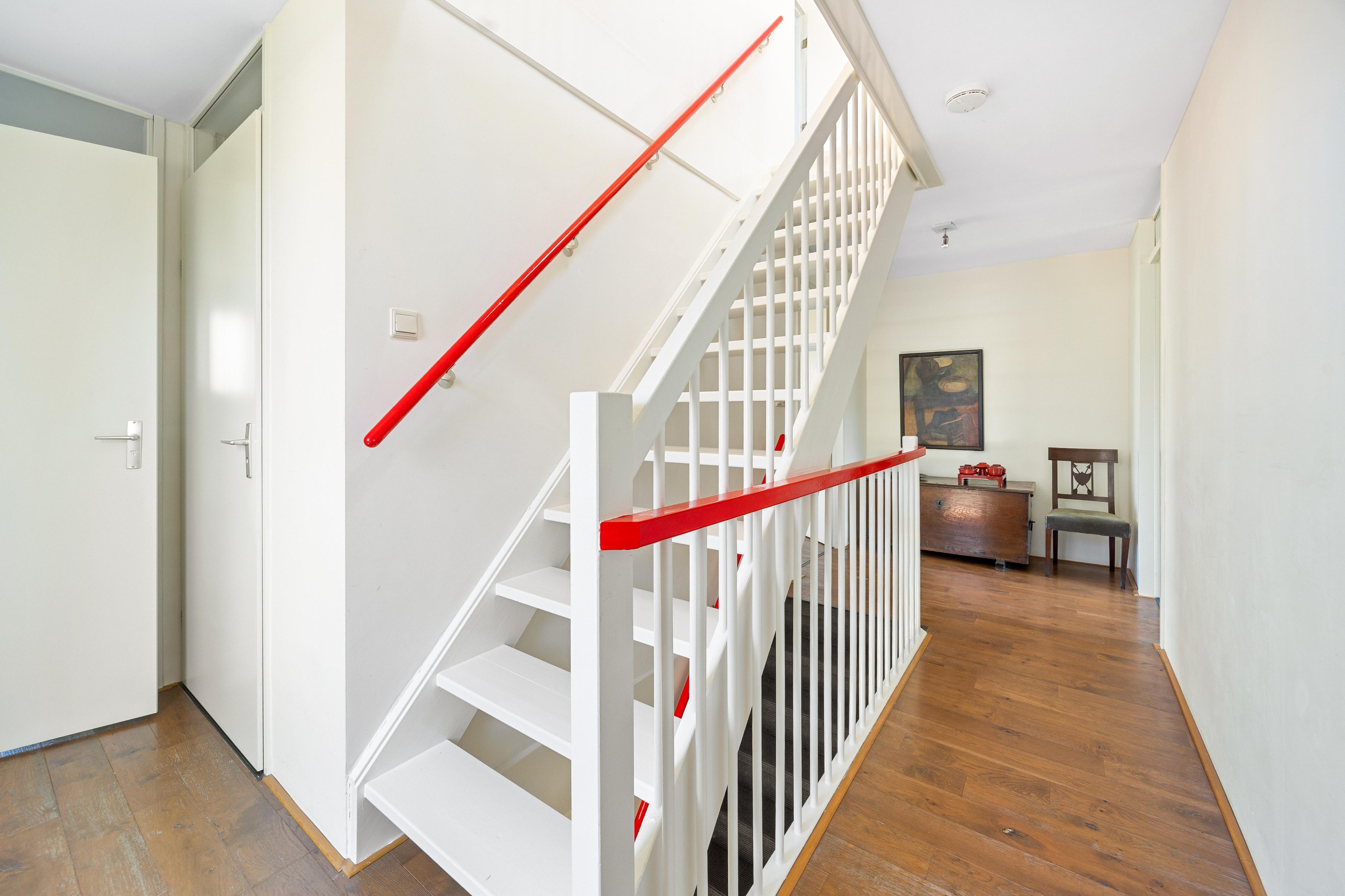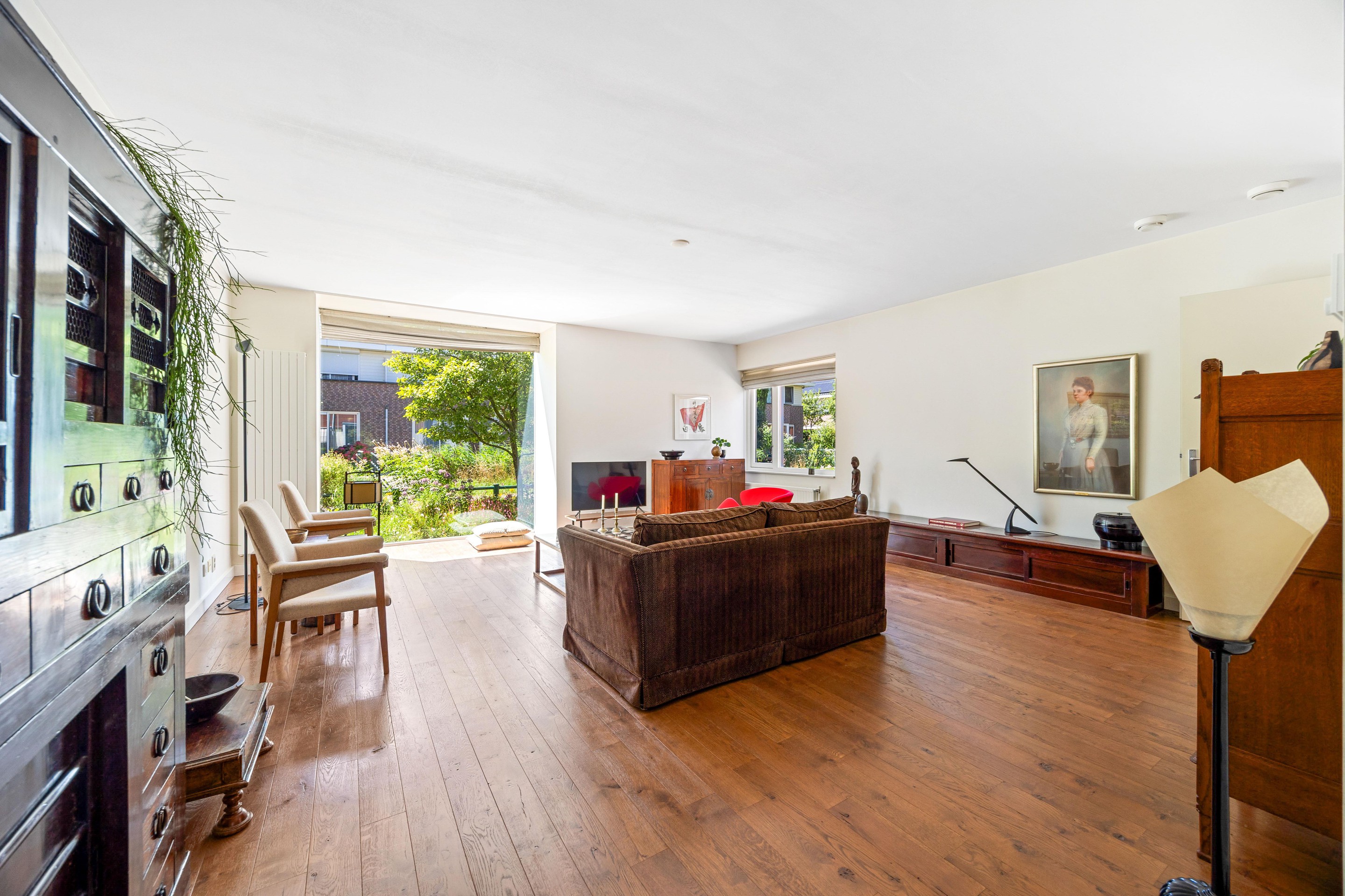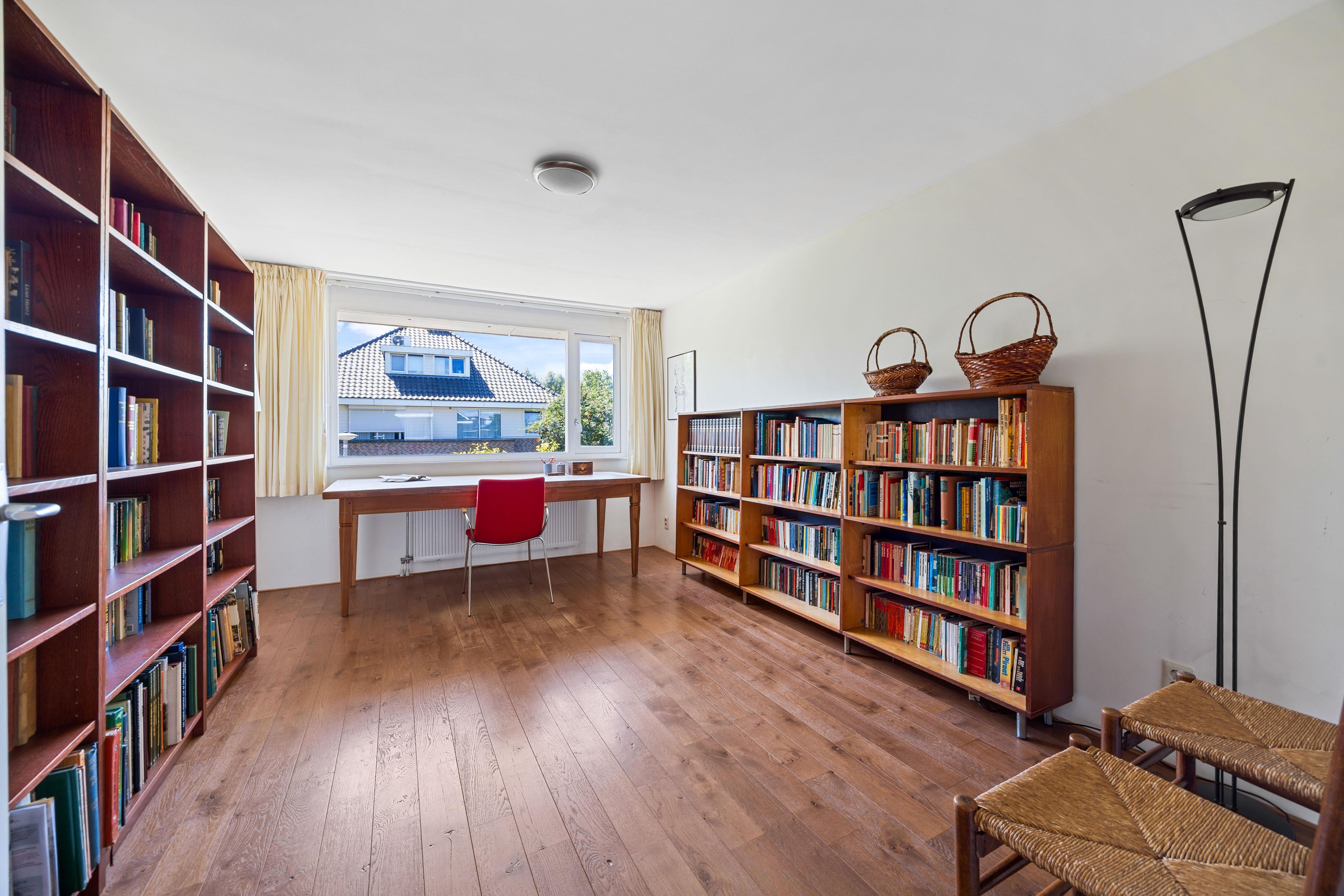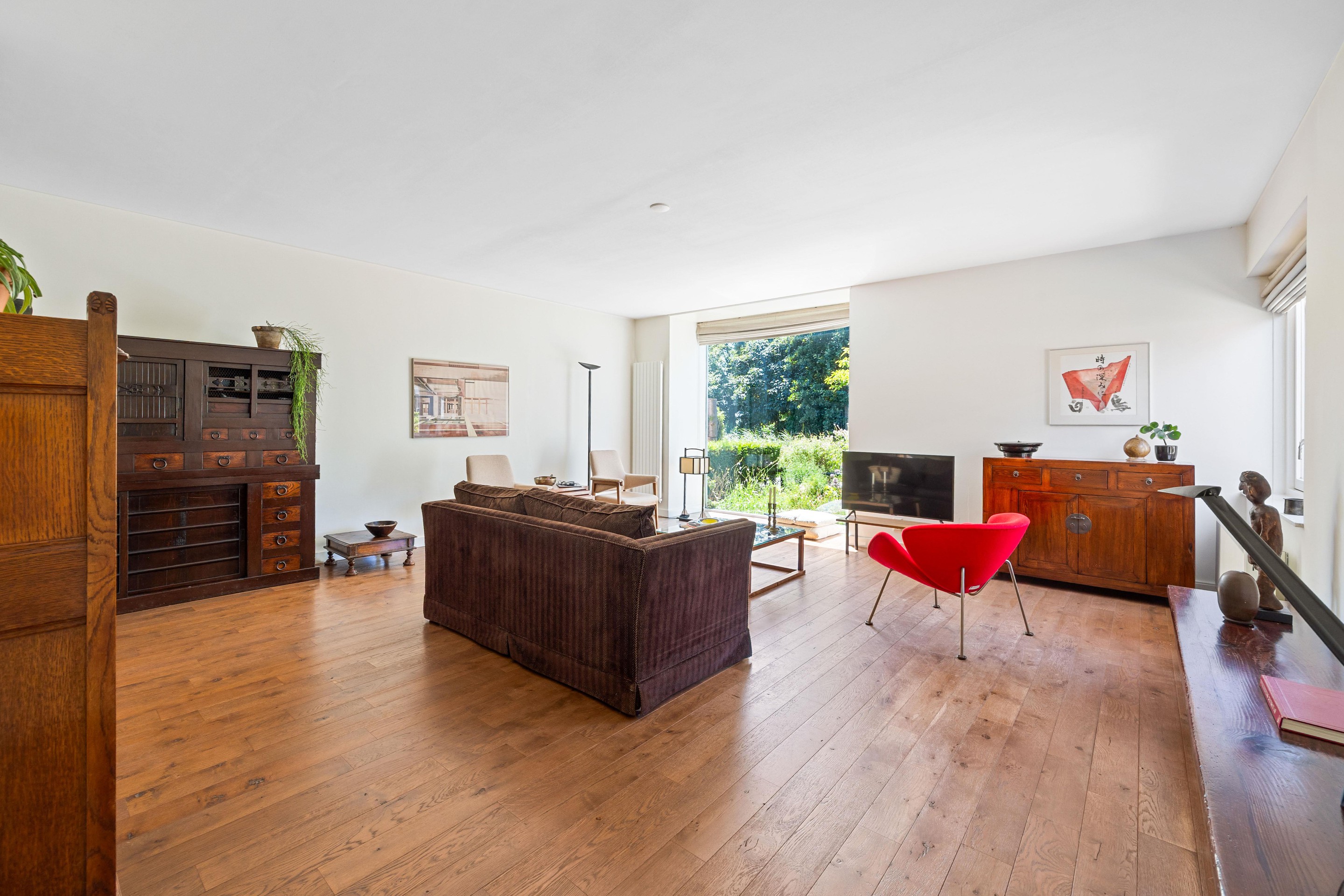Aan de achterzijde is en grote glazen schuifpui naar de tuin en een extra raam dat hier speciaal is geplaatst om ook vanuit de woonkamer te kunnen genieten van de Japanse tuin. Tussen de keuken en de woonkamer vindt u nog een grote inbouwkast onder de trap.
