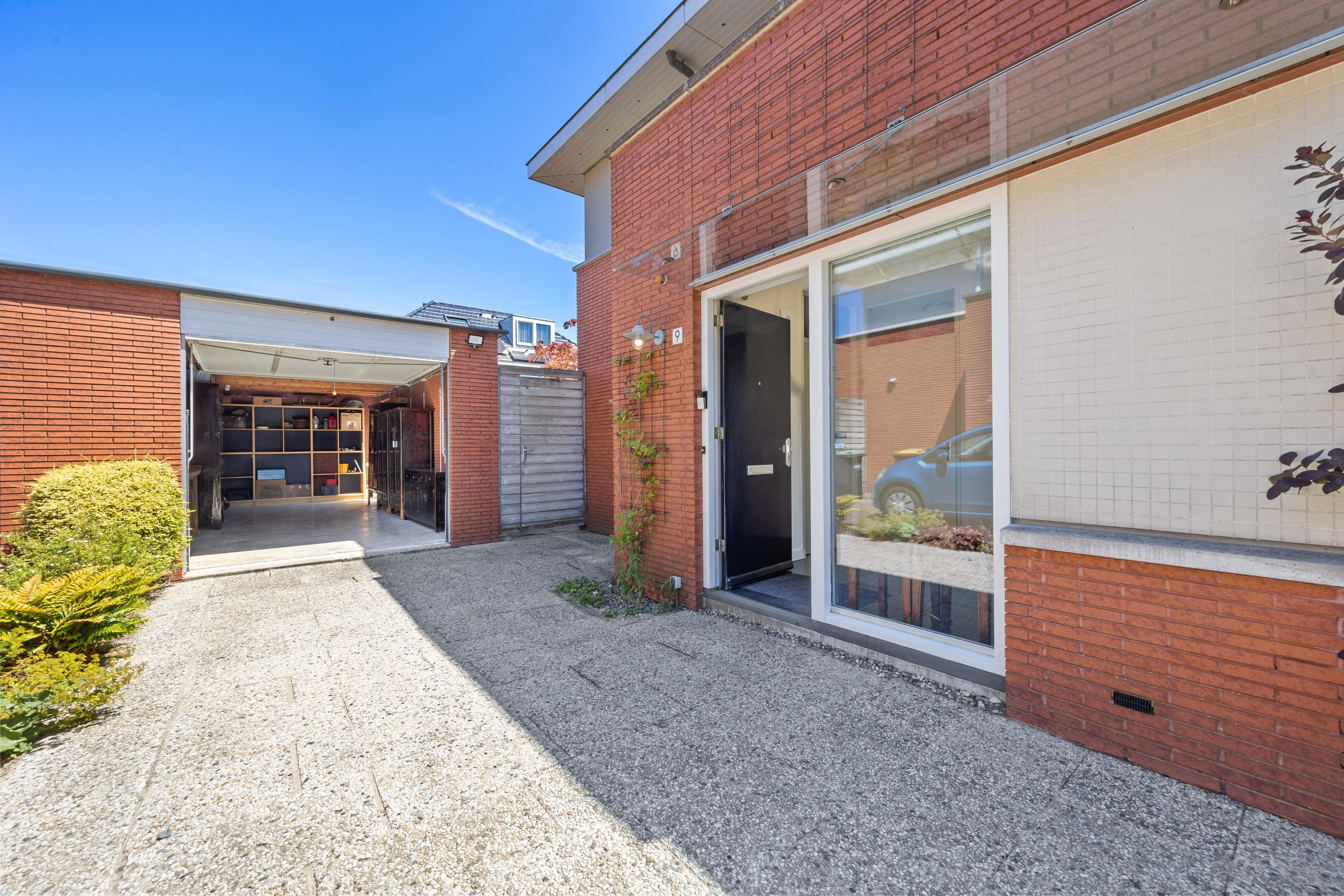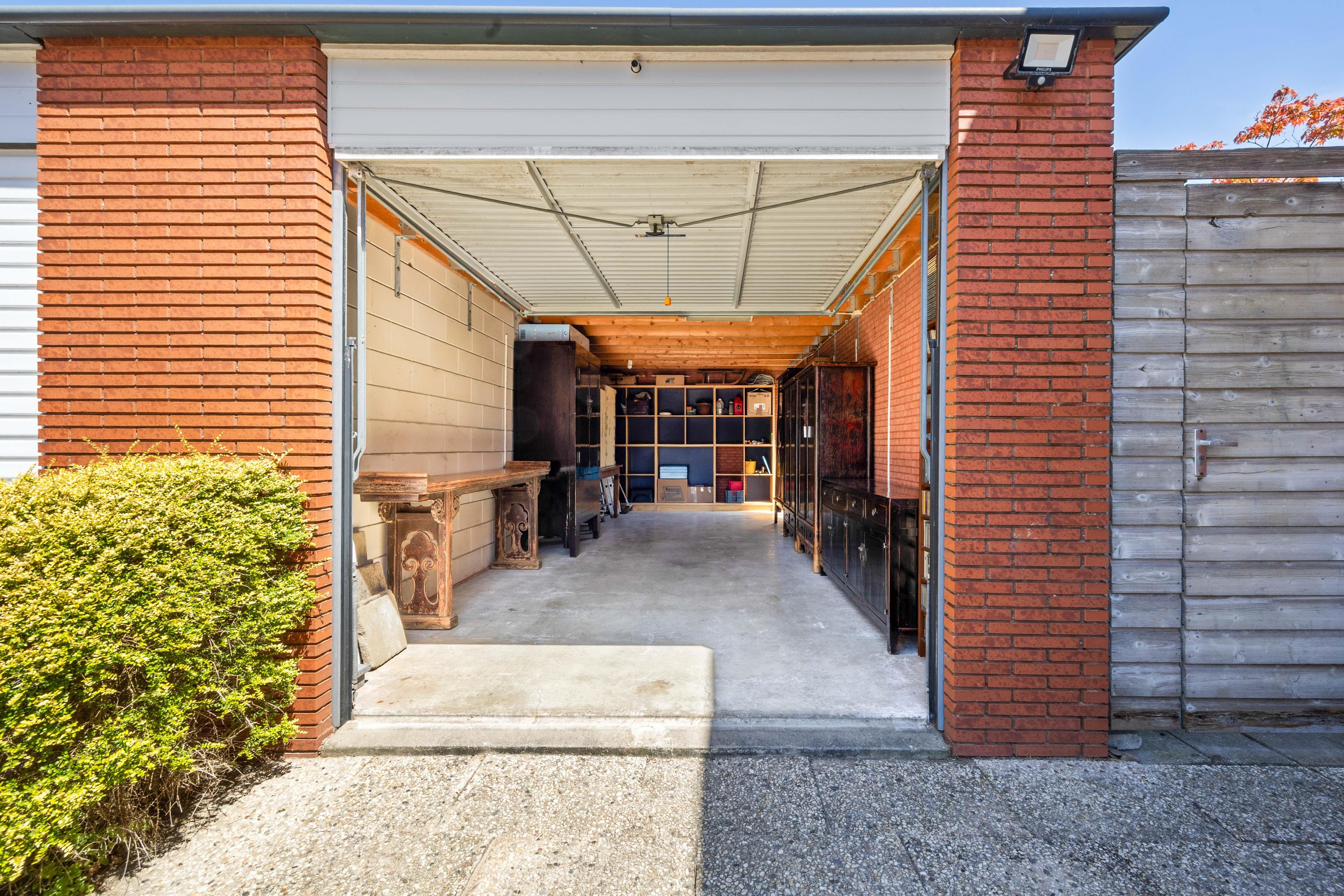 Naast het huis staat een grote stenen garage. De oprit is 16 meter lang en biedt gemakkelijk plek voor drie auto’s.