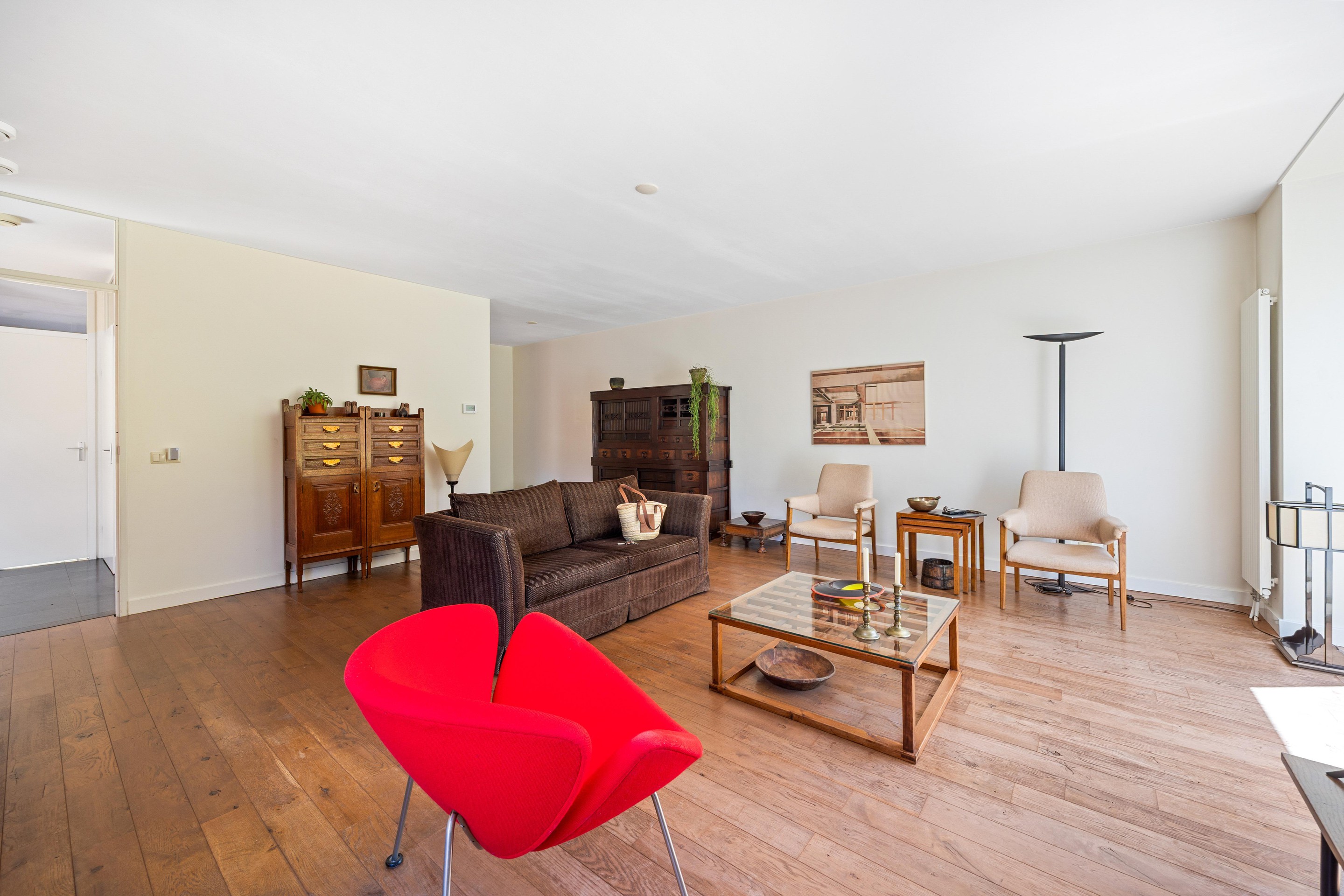 De rechterdeur leidt naar de woonkamer, een grote ruimte met daglicht van verschillende kanten en aan de voorzijde een grote erker. Op de vloer ligt parket wat een natuurlijke uitstraling geeft.