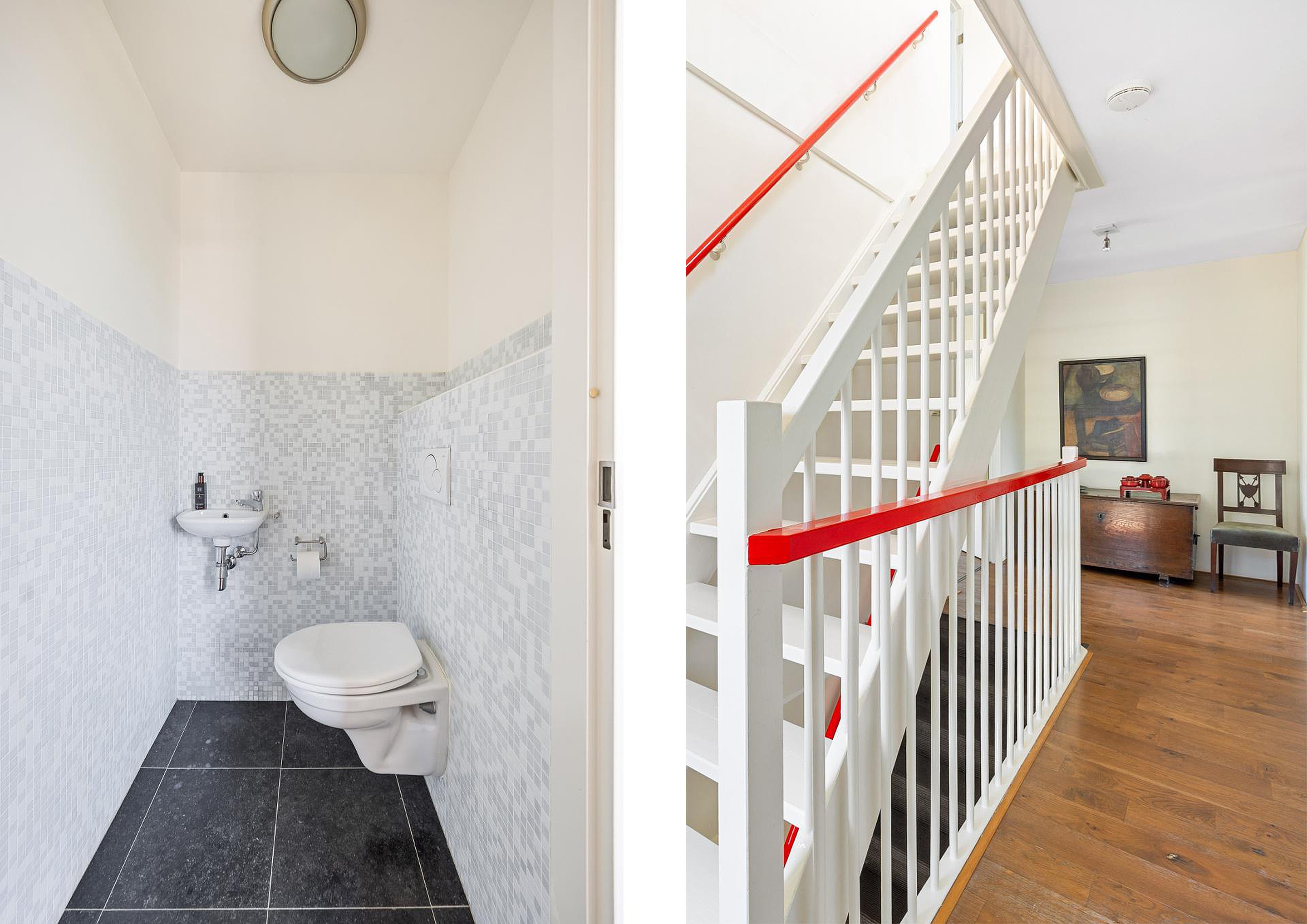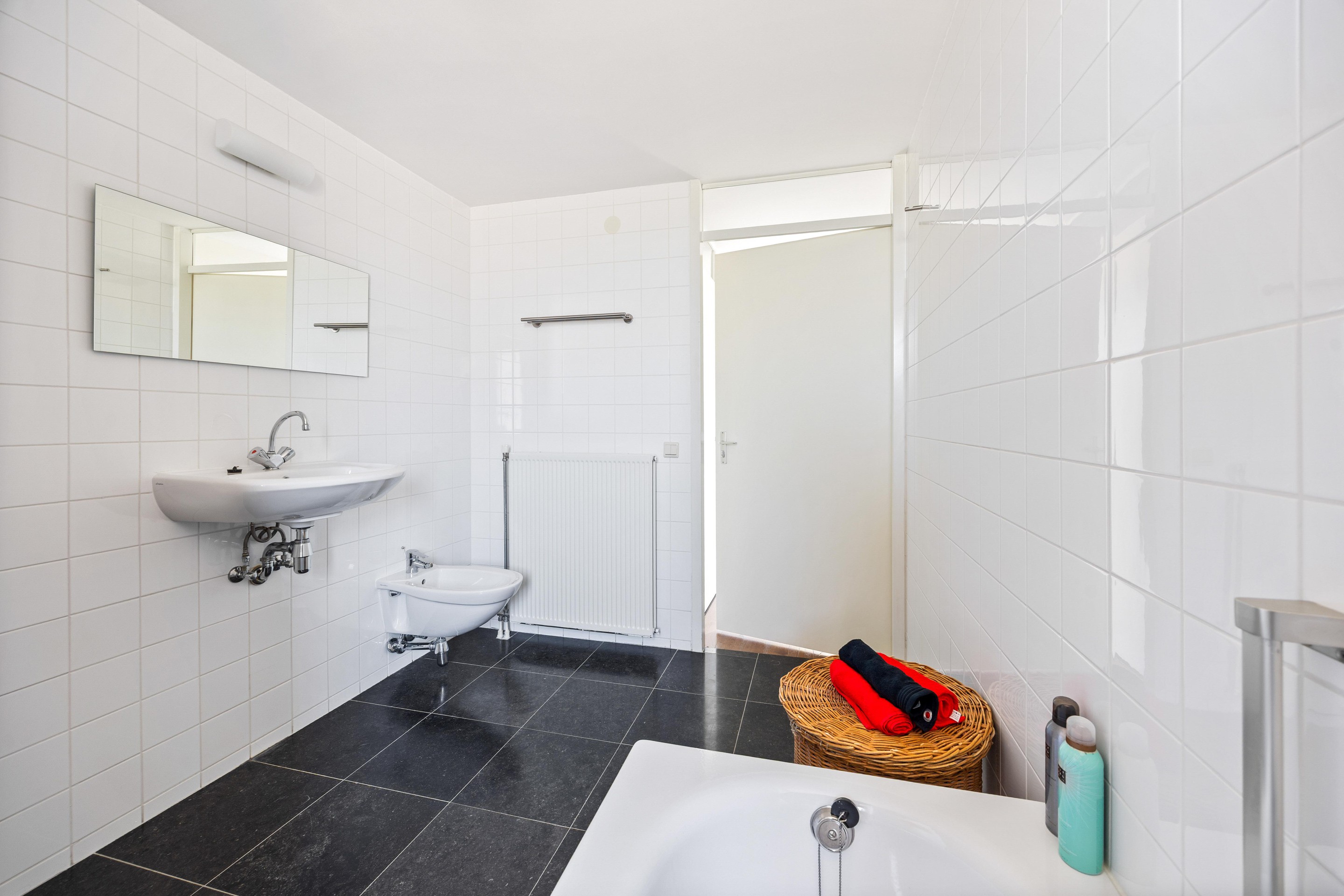 Naast slaapkamer drie is de badkamer, uitgevoerd in grote antraciet vloertegels van Belgisch hardsteen, kleine witte tegels aan de wand en mozaïekpatronen rondom het ligbad en de wand van de inloopdouche. Daarnaast beschikt u over een wastafel met brede spiegel en een bidet. Het tweede toilet bevindt zich in een separate ruimte, bereikbaar via de overloop.