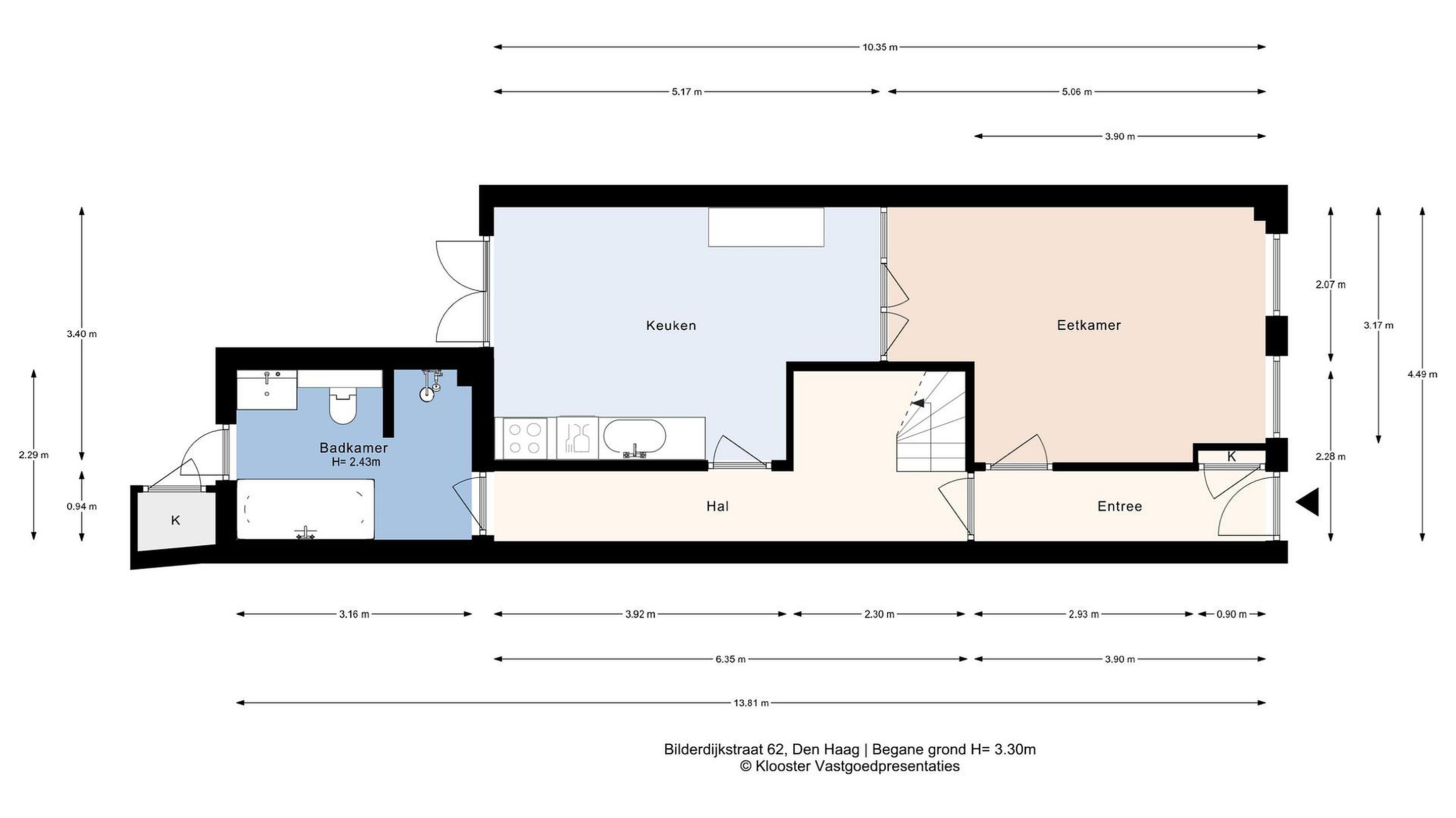 Entree, hal en voorkamer/eetkamer, die middels een tochtdeur is afgescheiden van de garderobe, het trappenhuis en de achtergang. Verder bevinden zich hier de woonkeuken en een badkamer. De voorkamer is momenteel ingericht als eetkamer, maar kan ook dienen als kantoorruimte of extra slaapkamer.