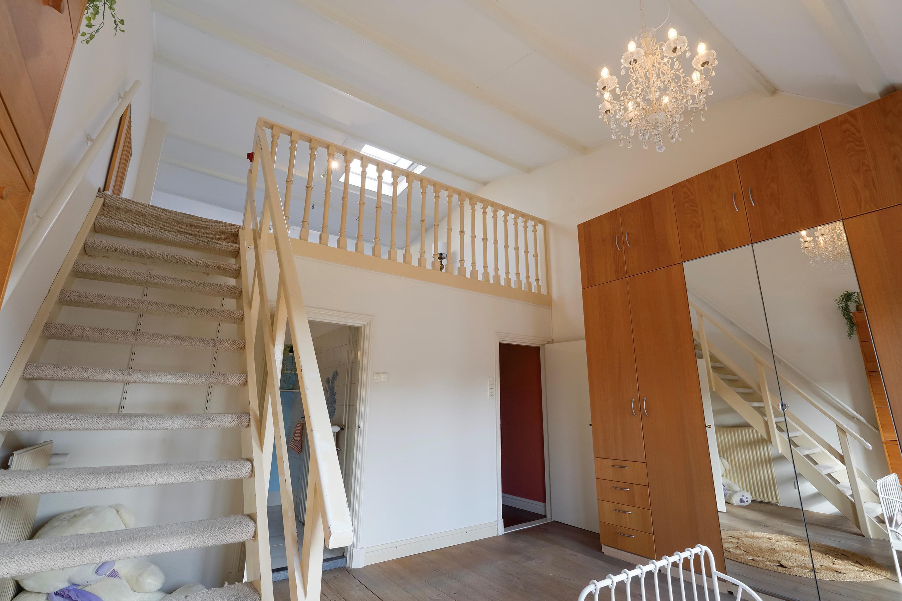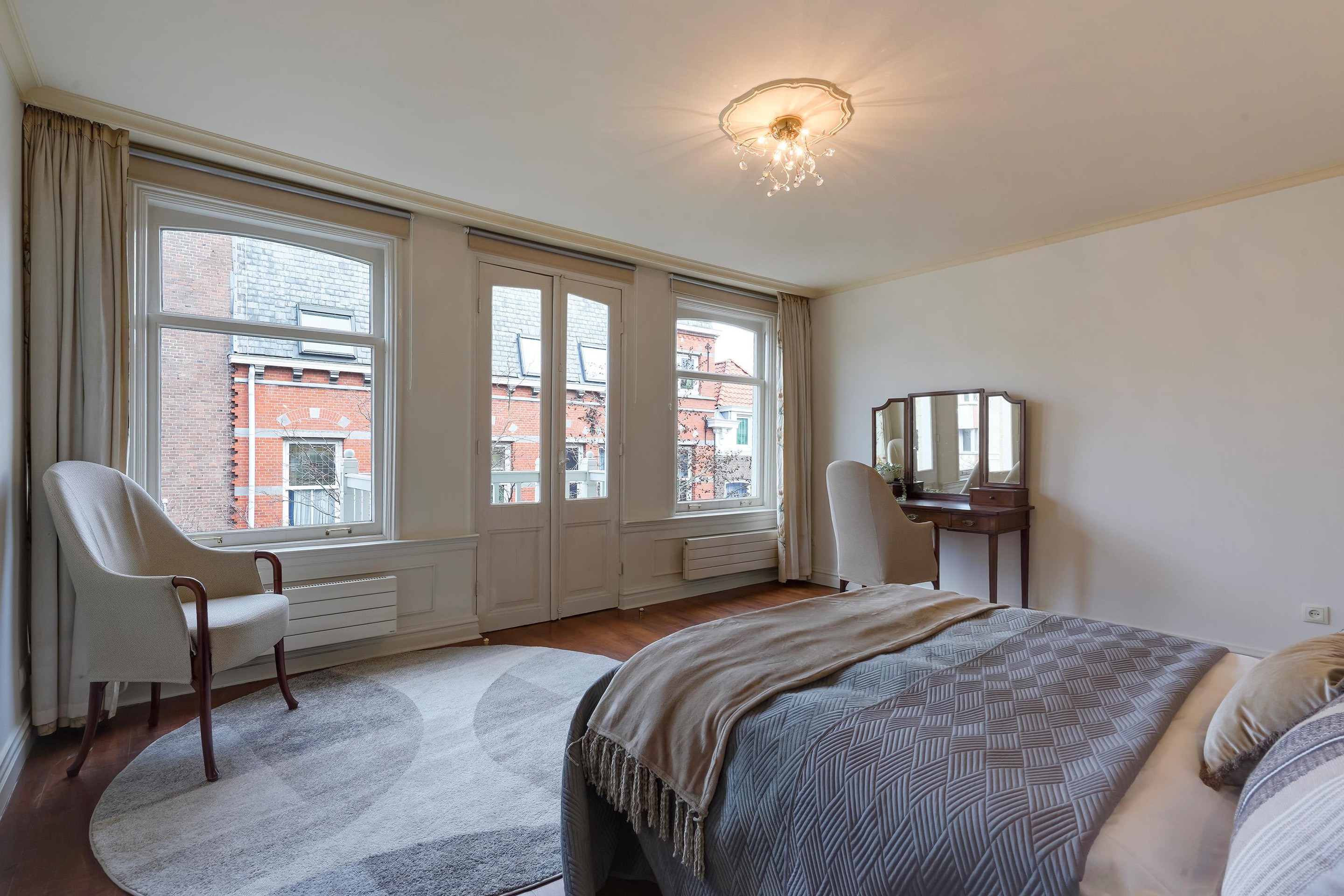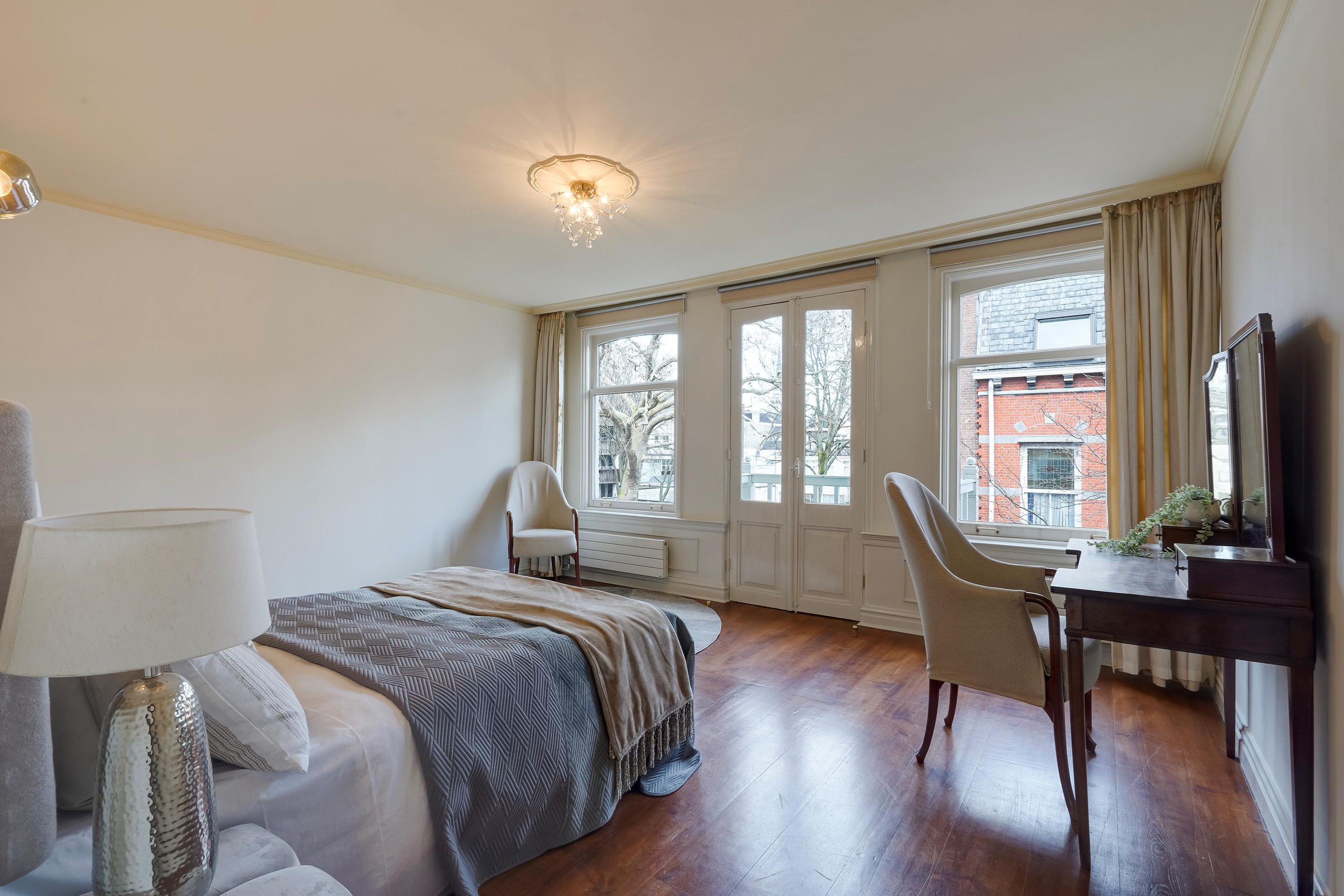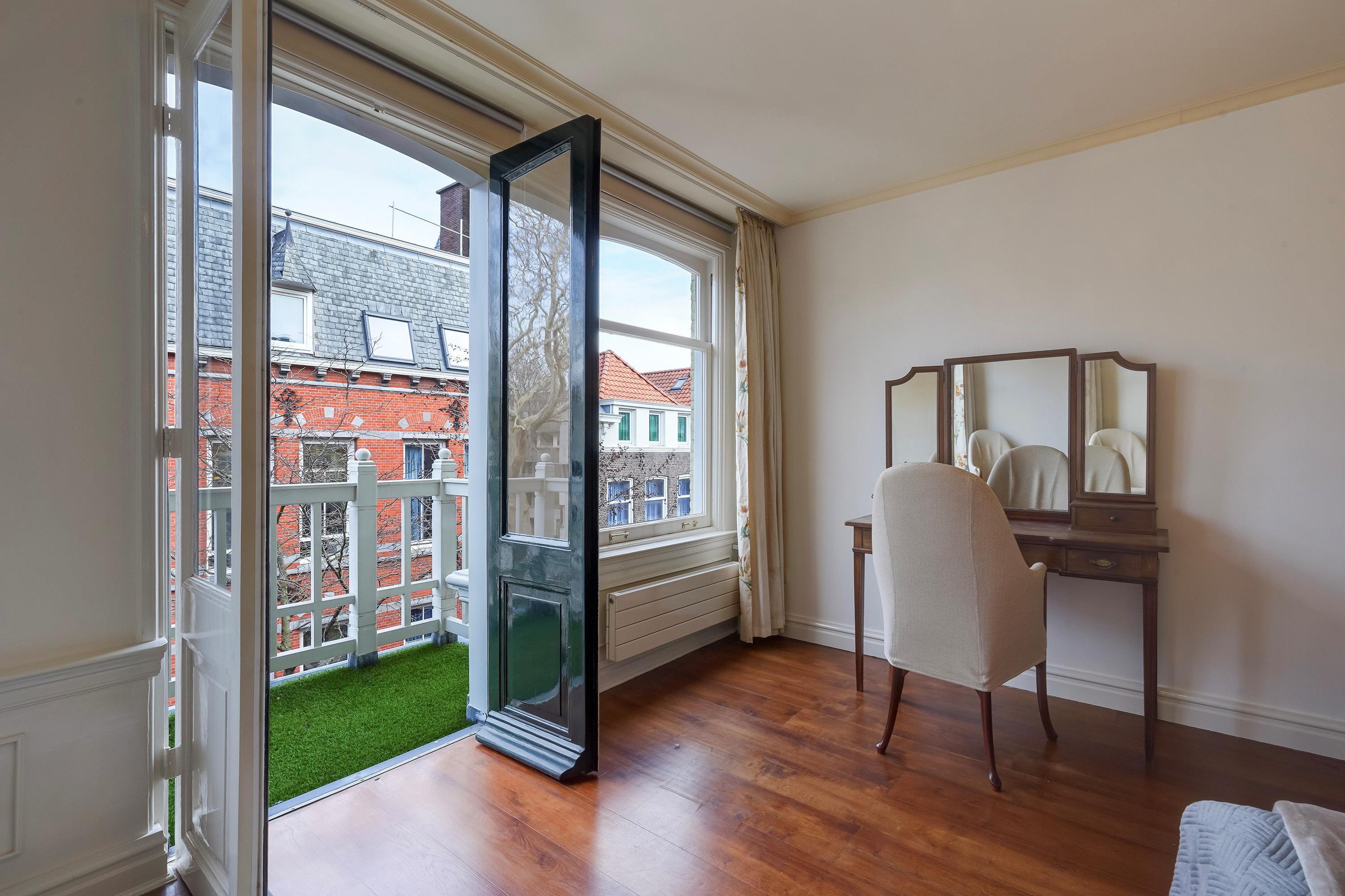 Overloop met toegang via de trap. De voorkamer is ingericht als master bedroom en beschikt over openslaande paneeldeuren naar het balkon boven de erker, gelegen op het noordoosten. De vloer is uitgevoerd in eiken vloerdelen.