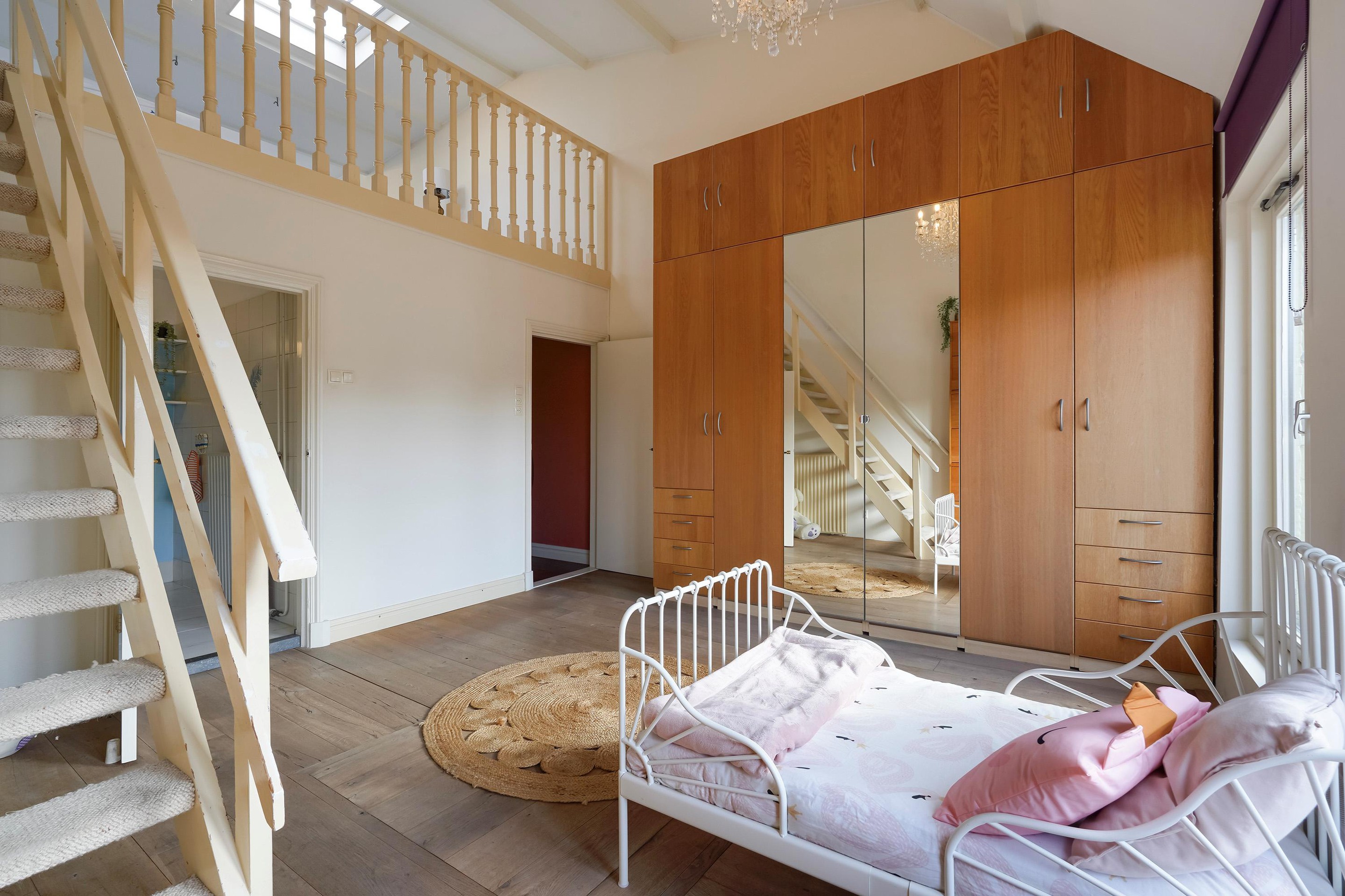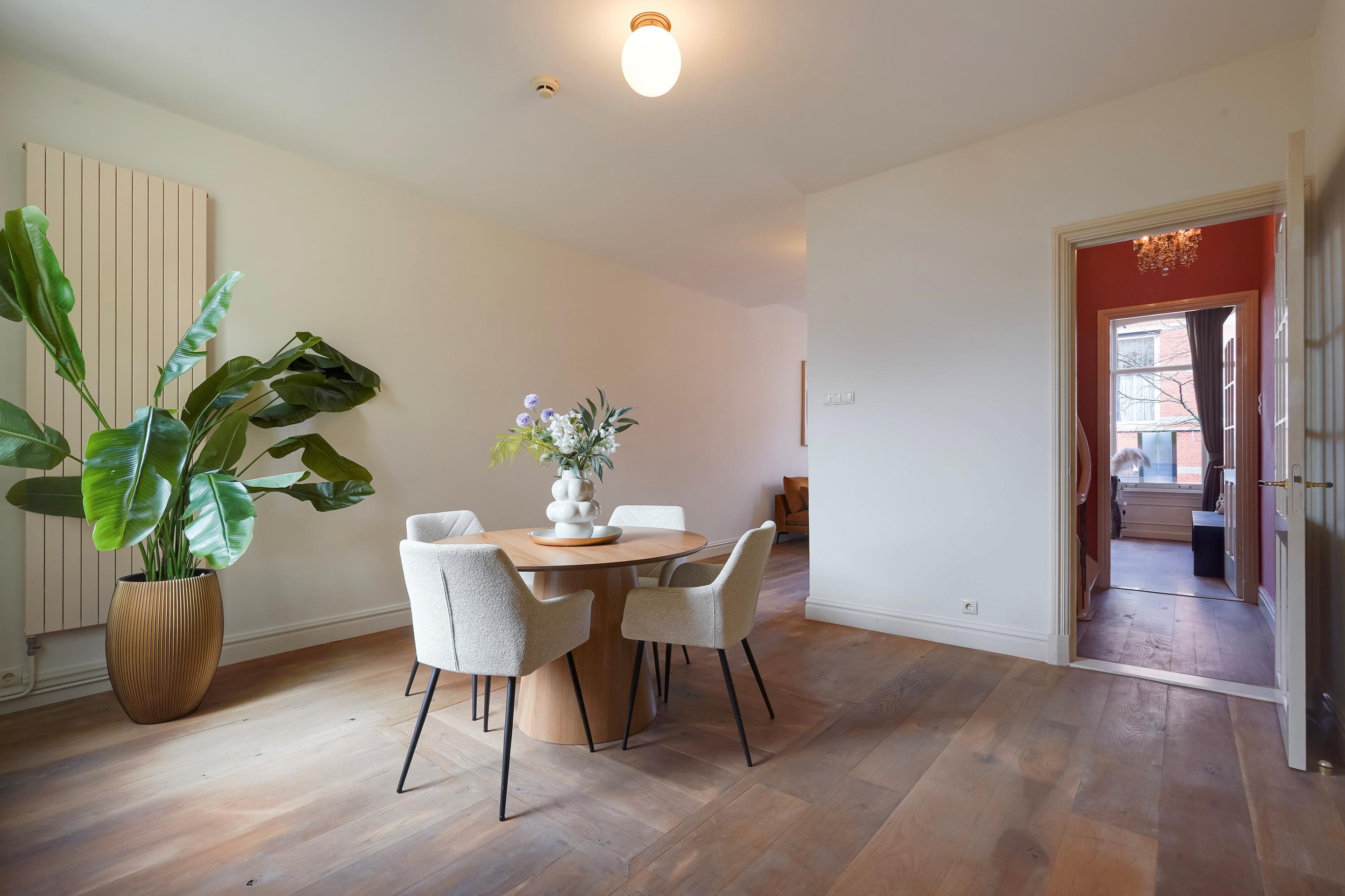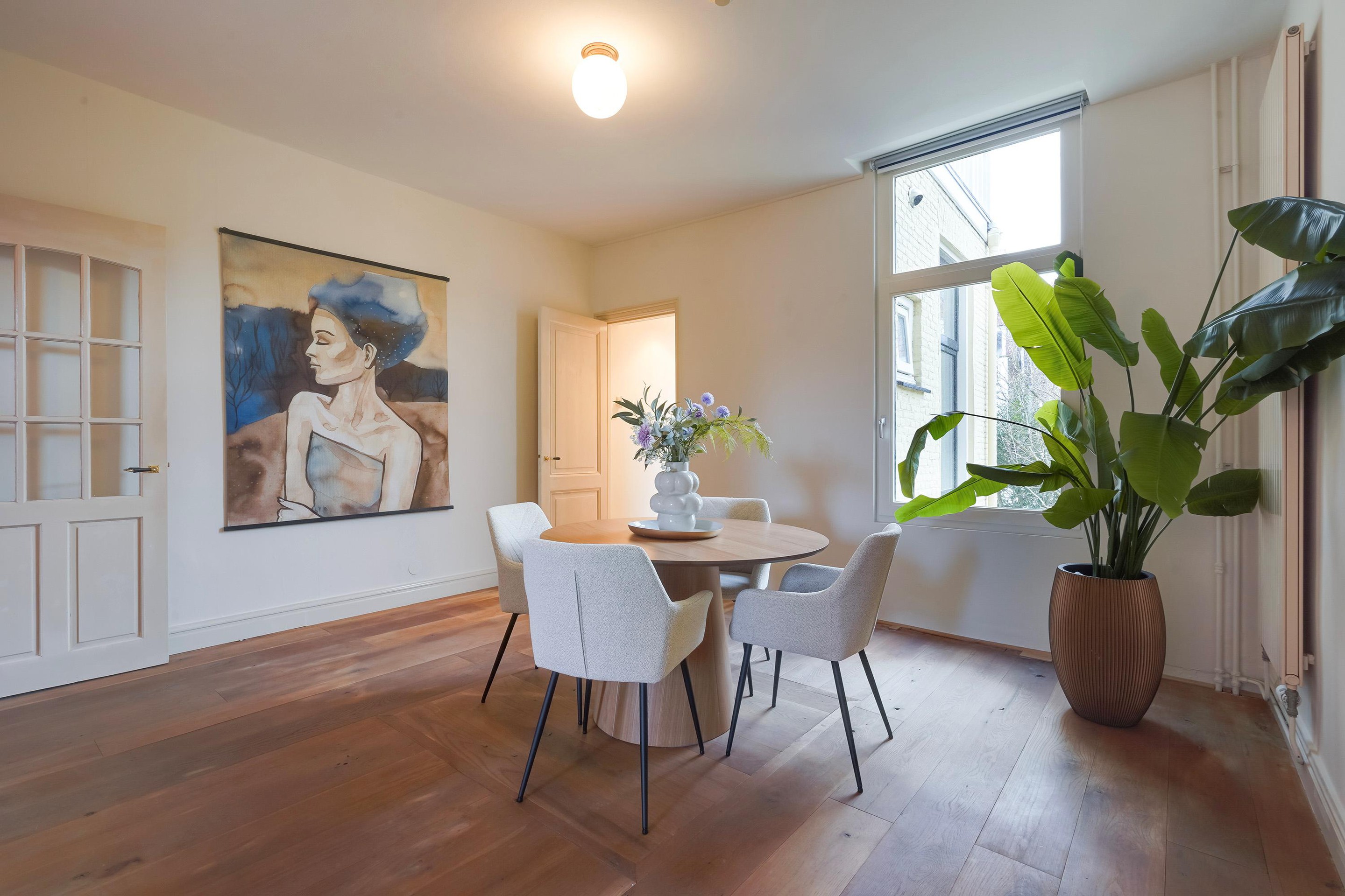Overloop met toegang via de trap. De voorkamer is ingericht als master bedroom en beschikt over openslaande paneeldeuren naar het balkon boven de erker, gelegen op het noordoosten. De vloer is uitgevoerd in eiken vloerdelen.