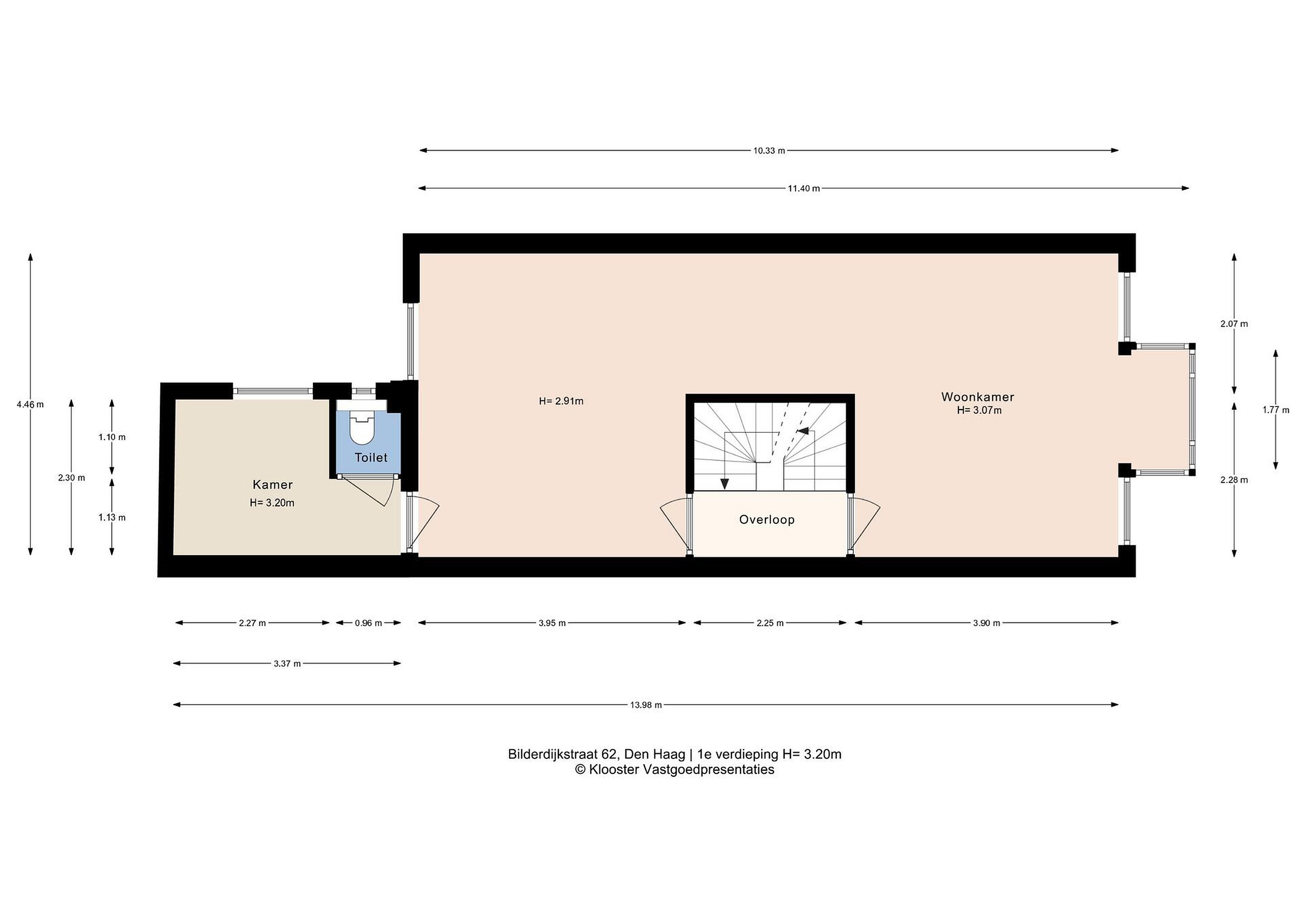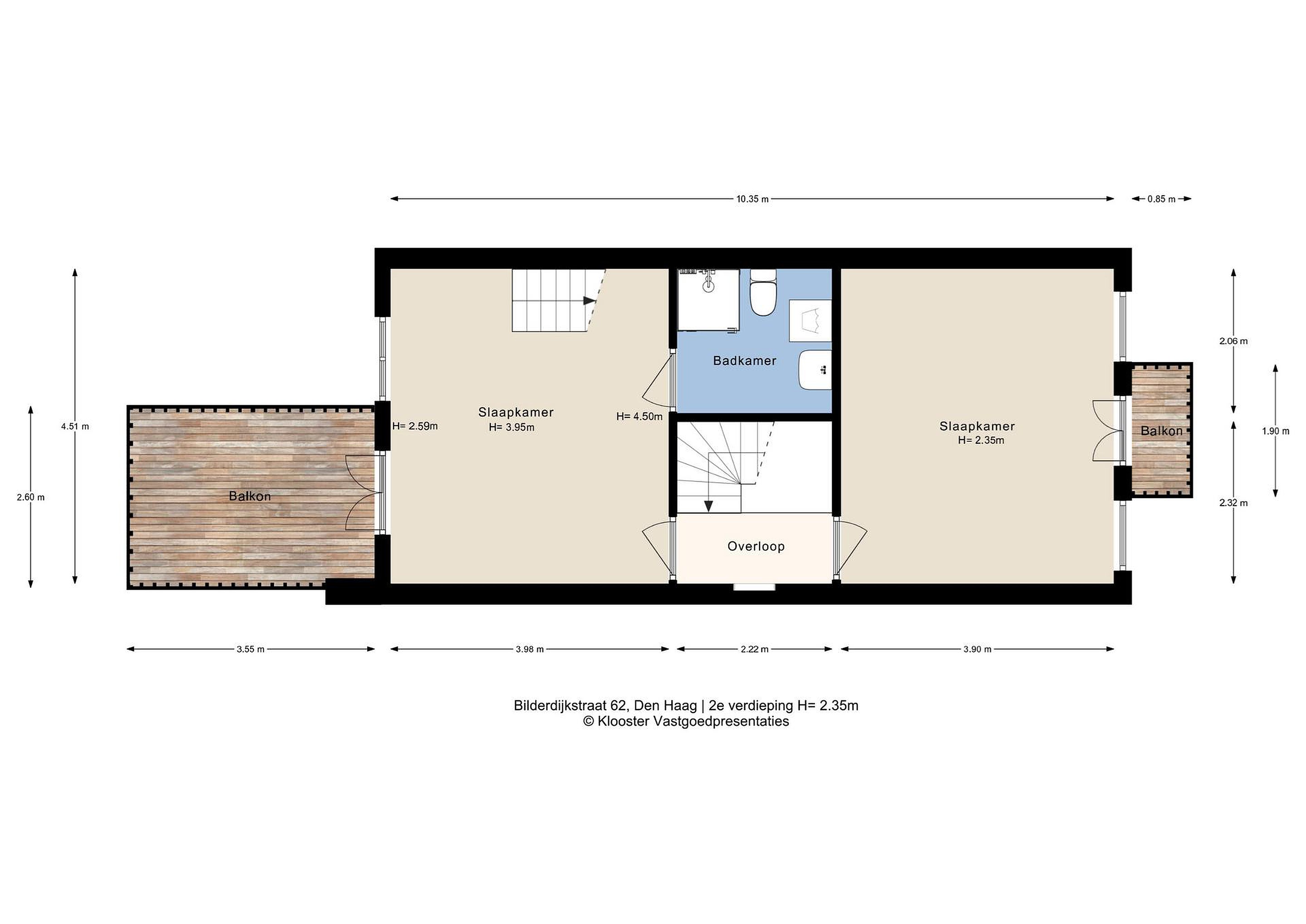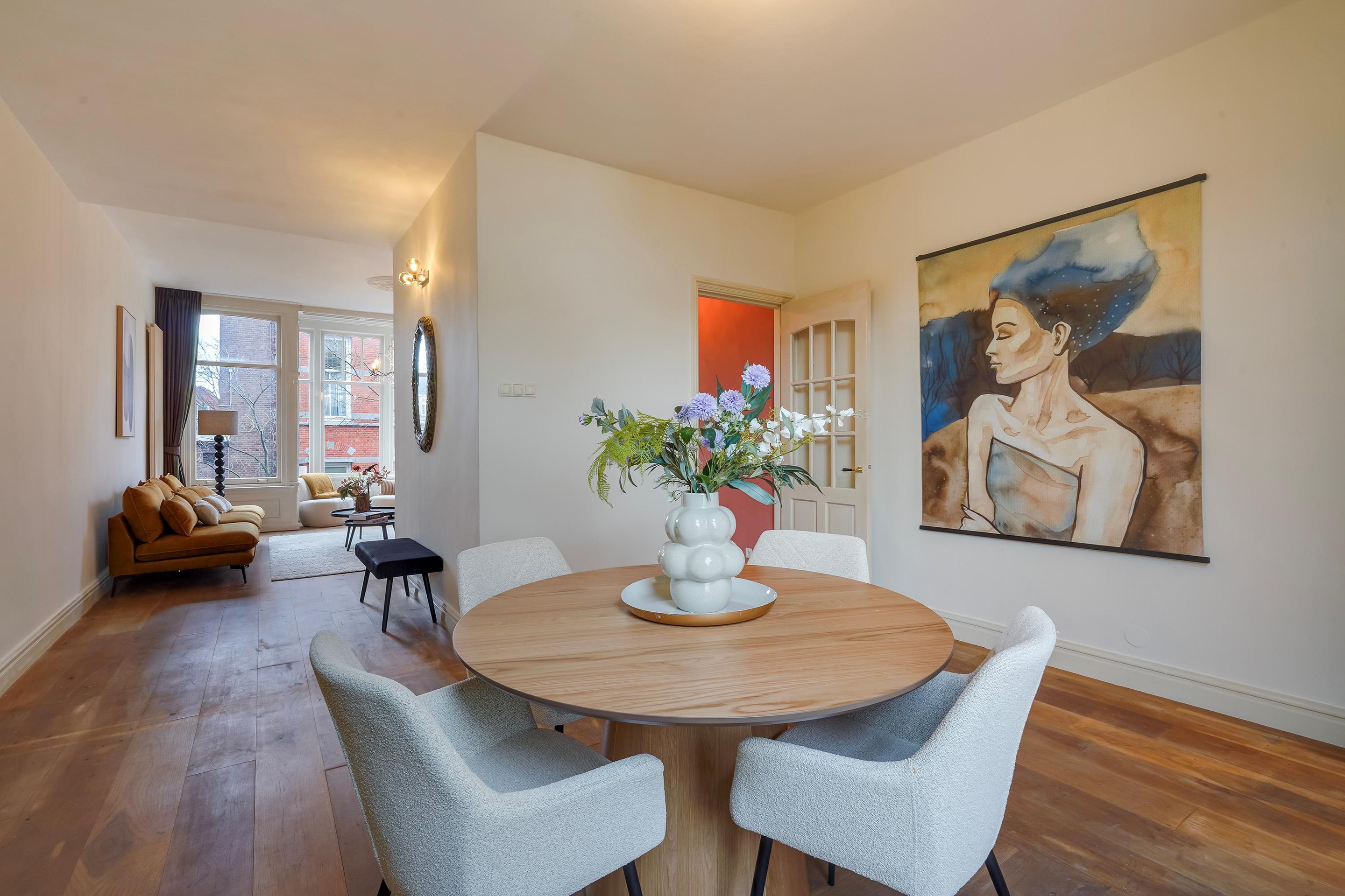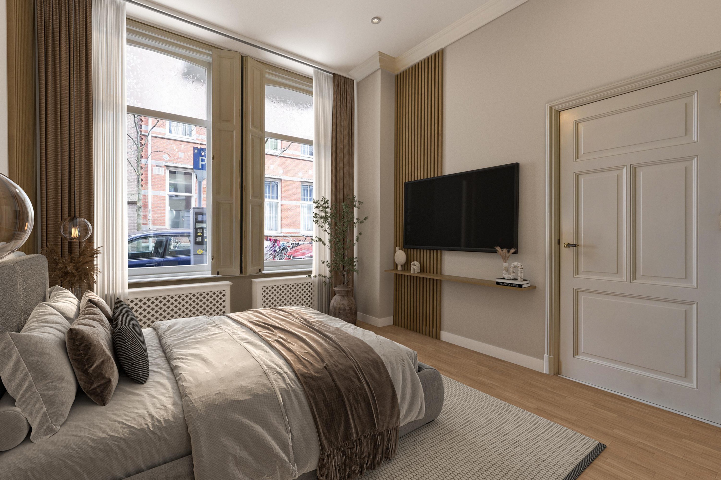 Overloop met toegang via de trap. De voorkamer is ingericht als master bedroom en beschikt over openslaande paneeldeuren naar het balkon boven de erker, gelegen op het noordoosten. De vloer is uitgevoerd in eiken vloerdelen.