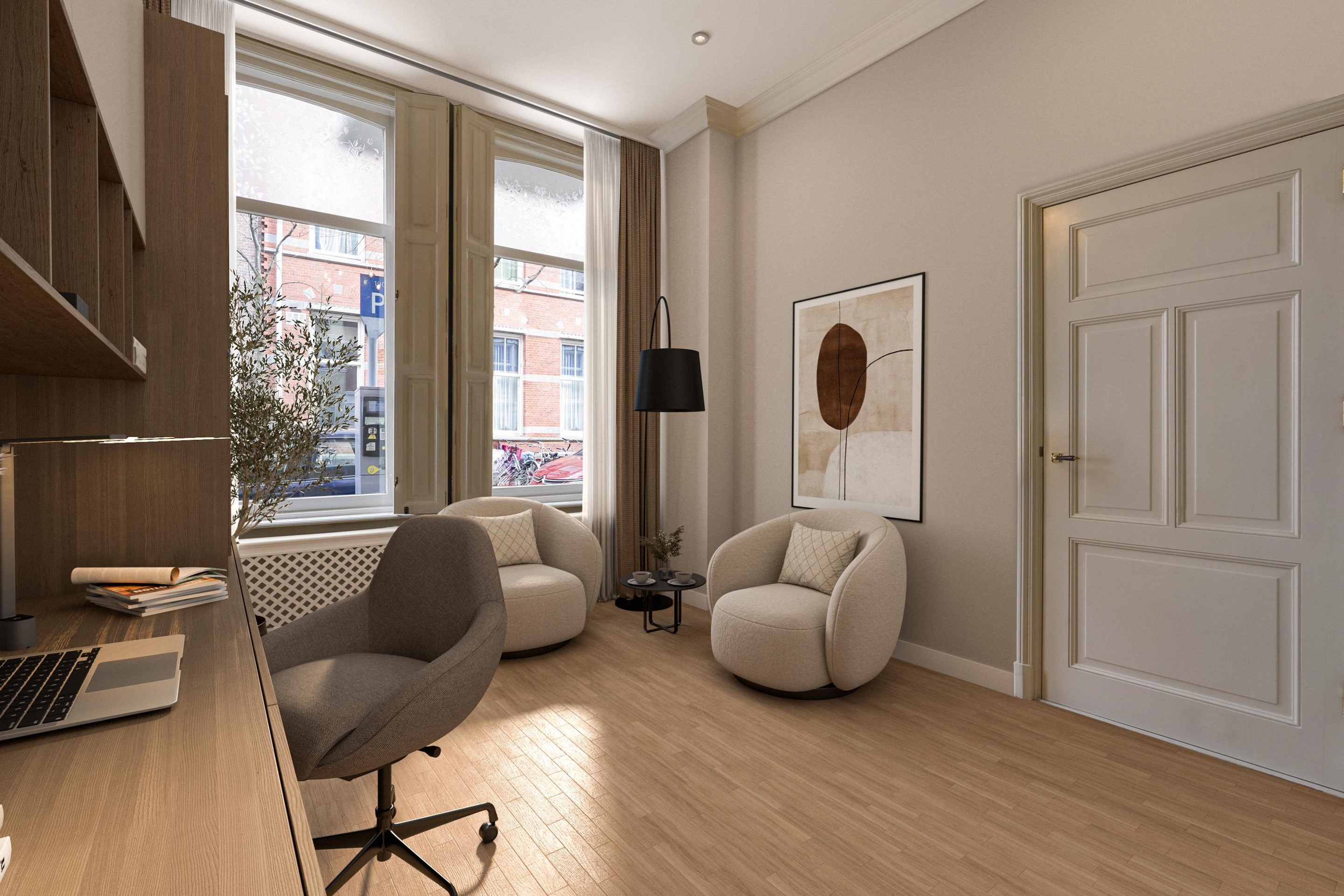 Een aantal impressie zijn bijgevoegd voor de kamer voorzijde begane grond (slaapkamer en kantoor) en kamer achterzijde (badkamer)