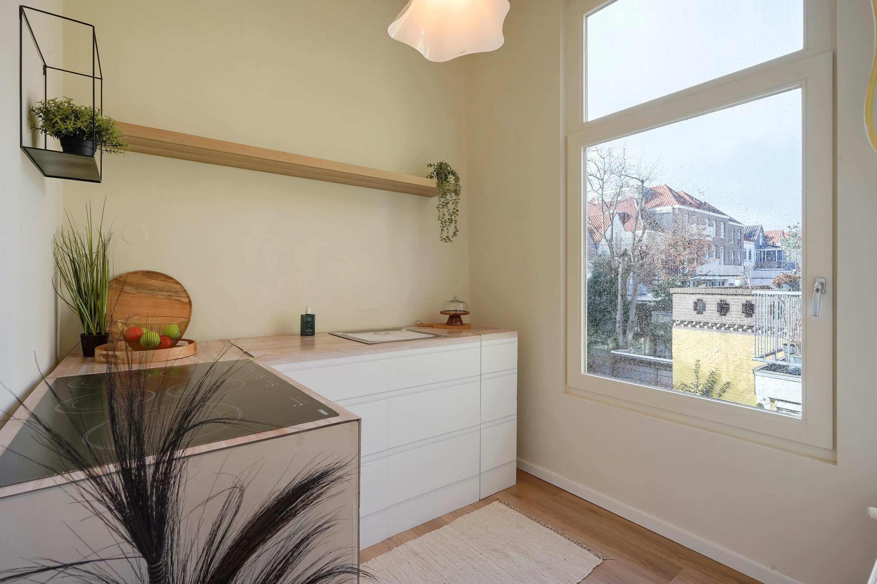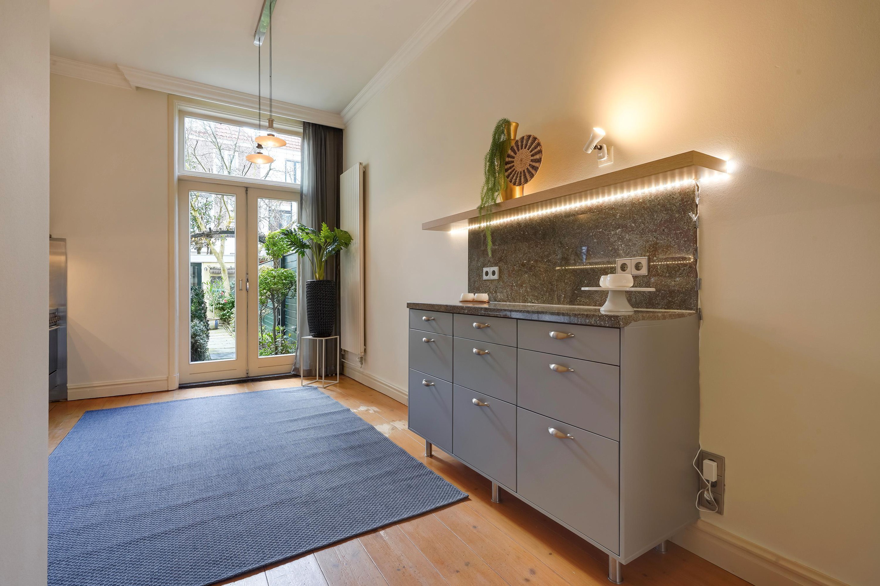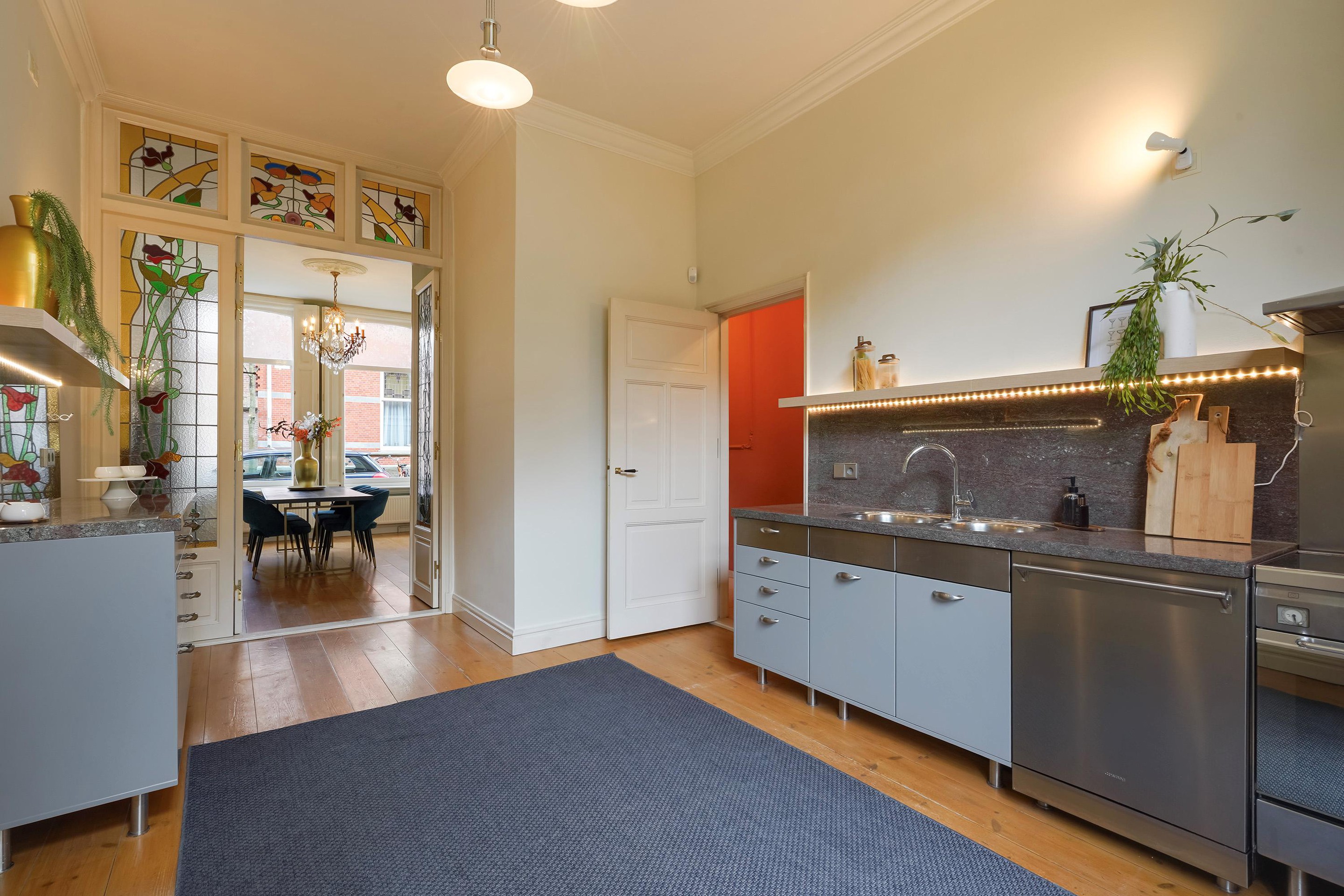 De achterkamer/woonkeuken is voorzien van een moderne keuken met (inbouw)apparatuur van SMEG en een afzuigkap met extra grote afzuigcapaciteit. Onder het keukenblok is een Itho Daalderop-cooker geplaatst, waardoor vrijwel direct bijna kokend water uit de kraan beschikbaar is. Openslaande deuren geven direct toegang tot de achtertuin.