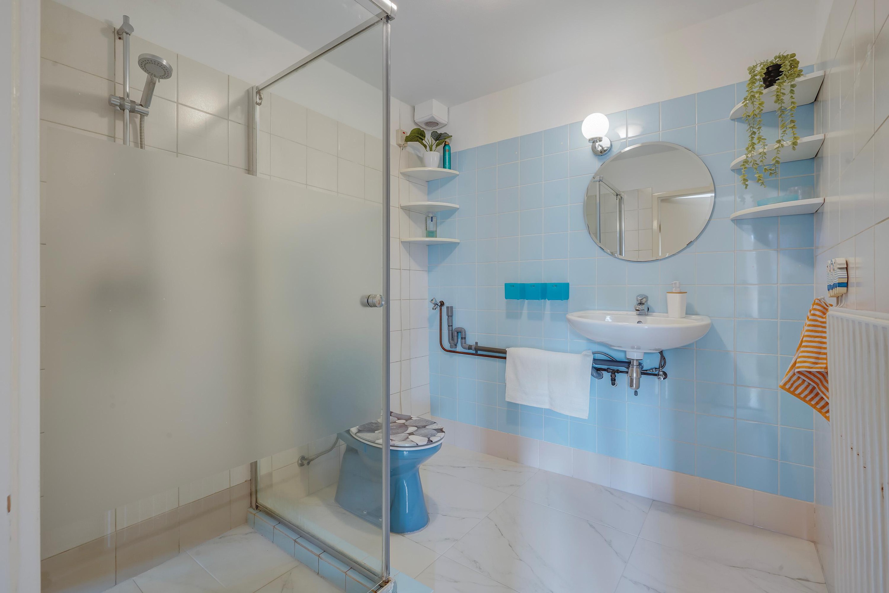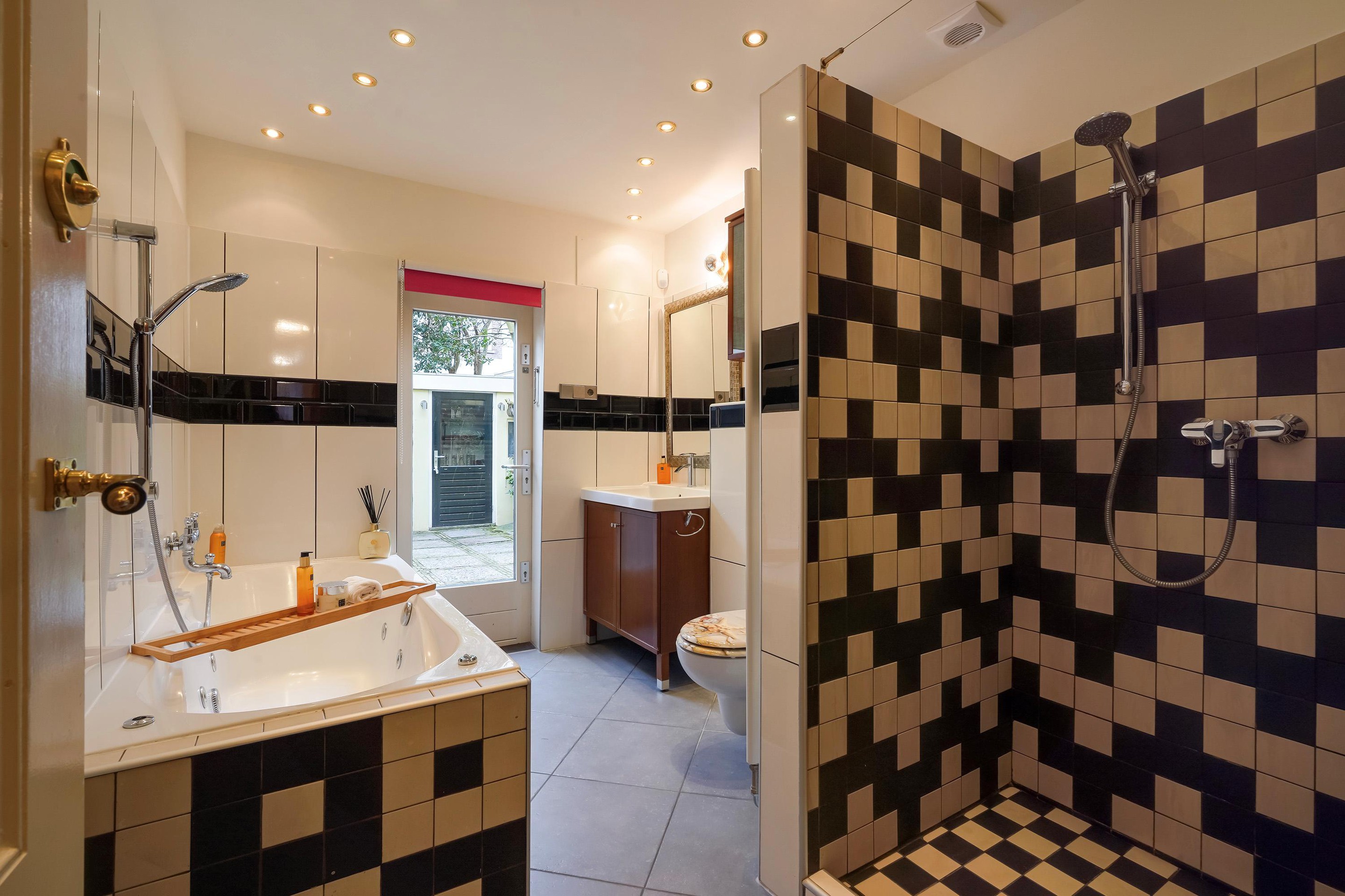 De badkamer beschikt over een extra ruime douche, een bad, een toilet, een wastafel, vloerverwarming en eveneens toegang tot de achtertuin. De fraai aangelegde achtertuin biedt een heerlijk terras, een royale tuinkast voor tuingereedschap en een schuur. In de schuur bevinden zich de opstelplaats van de cv-ketel en de elektrische boiler, die wordt opgewarmd met zonnestroom. Deze boiler kan tevens indirect worden verhit via de 45 kW Remeha Quinta. Daarnaast zijn hier twee groepen aanwezig met aansluitingen voor een wasmachine en een wasdroger.