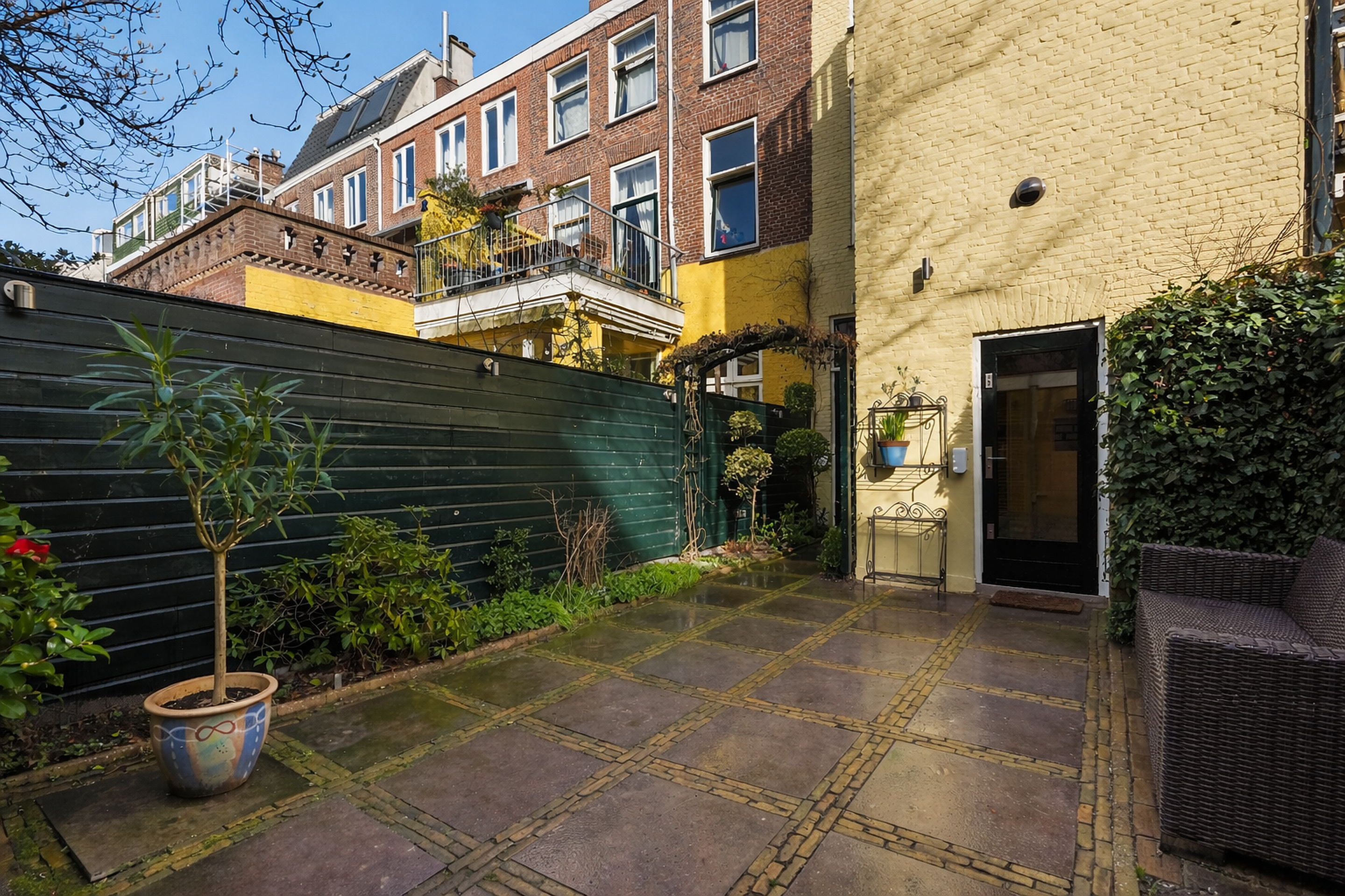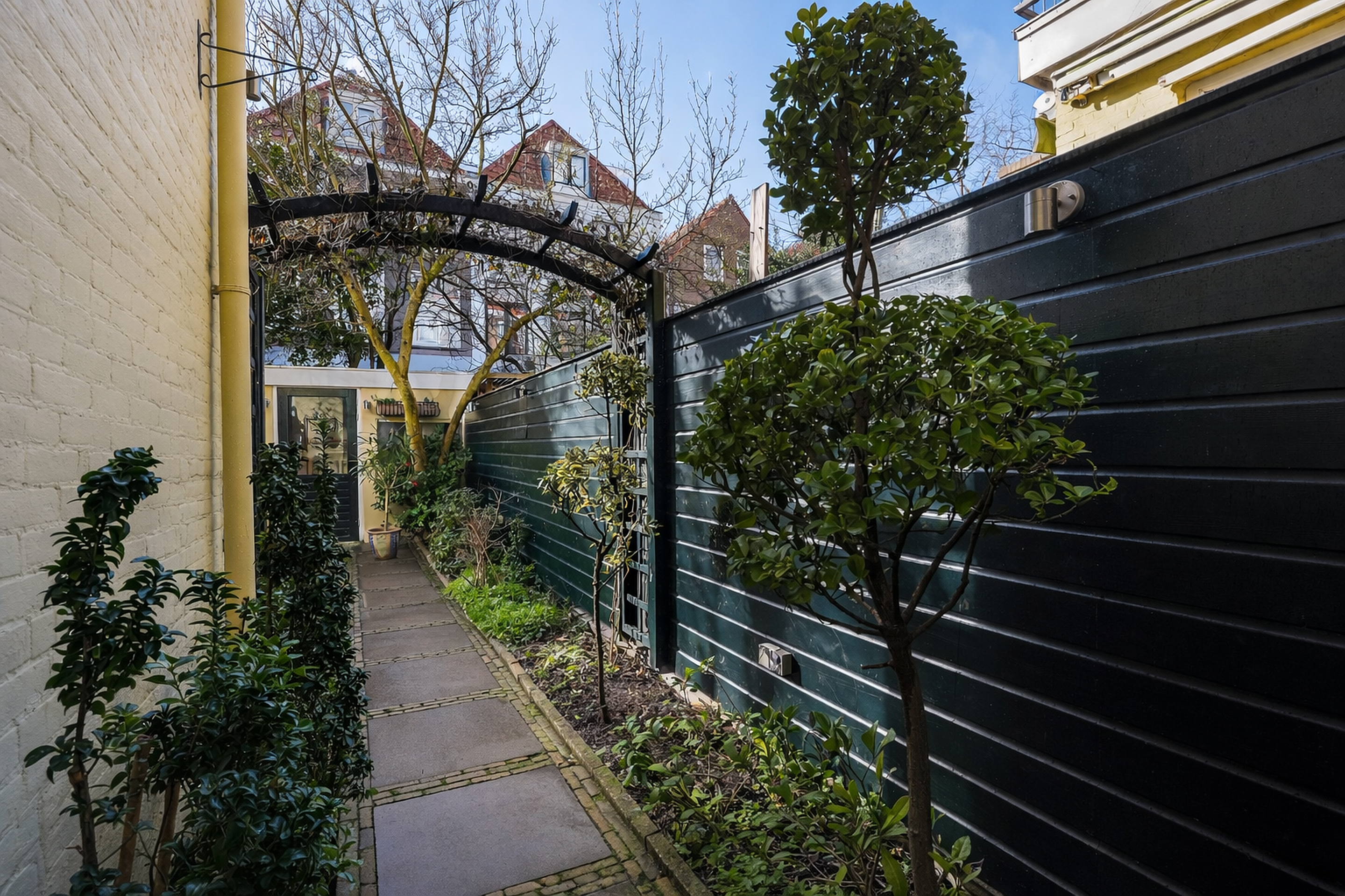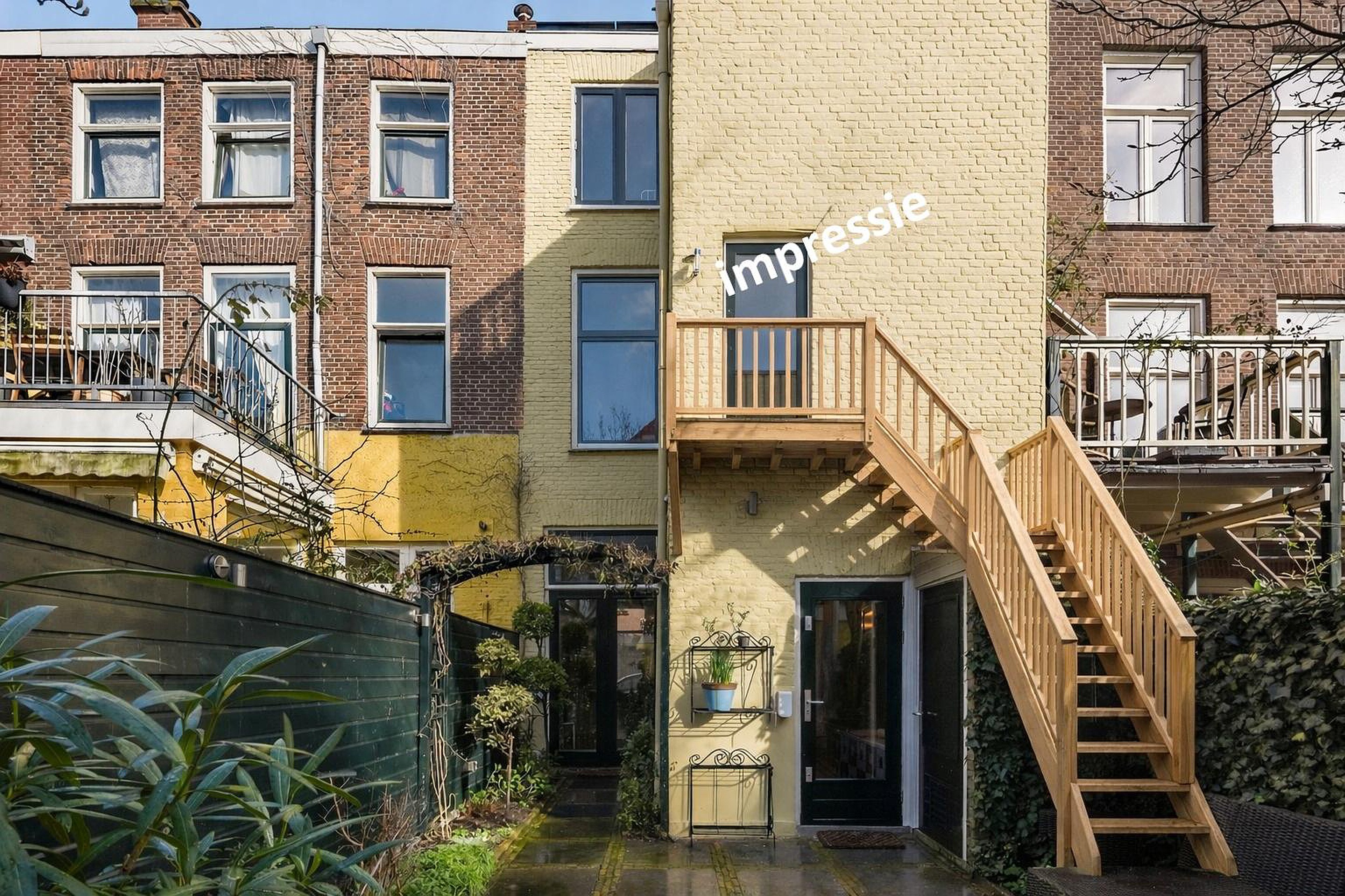 De voorgevel heeft een monumentale uitstraling met originele, gerestaureerde schuiframen en een prachtige erker met balkon. Aan de achterzijde beschikt het herenhuis over een beschermde binnentuin op het zuidwesten en een dubbele uitbouw met dakterras. Het dakterras op de tweede verdieping ligt beschut en biedt bij zonnig weer de mogelijkheid om vanaf 10 uur ’s ochtends tot zonsondergang van de zon te genieten. In de achtertuin bevinden zich een ruime tuinkast voor tuingereedschap en een schuur met de opstelplaats voor de cv-ketel en de 256 liter elektrische boiler, die wordt opgewarmd met zonnestroom.