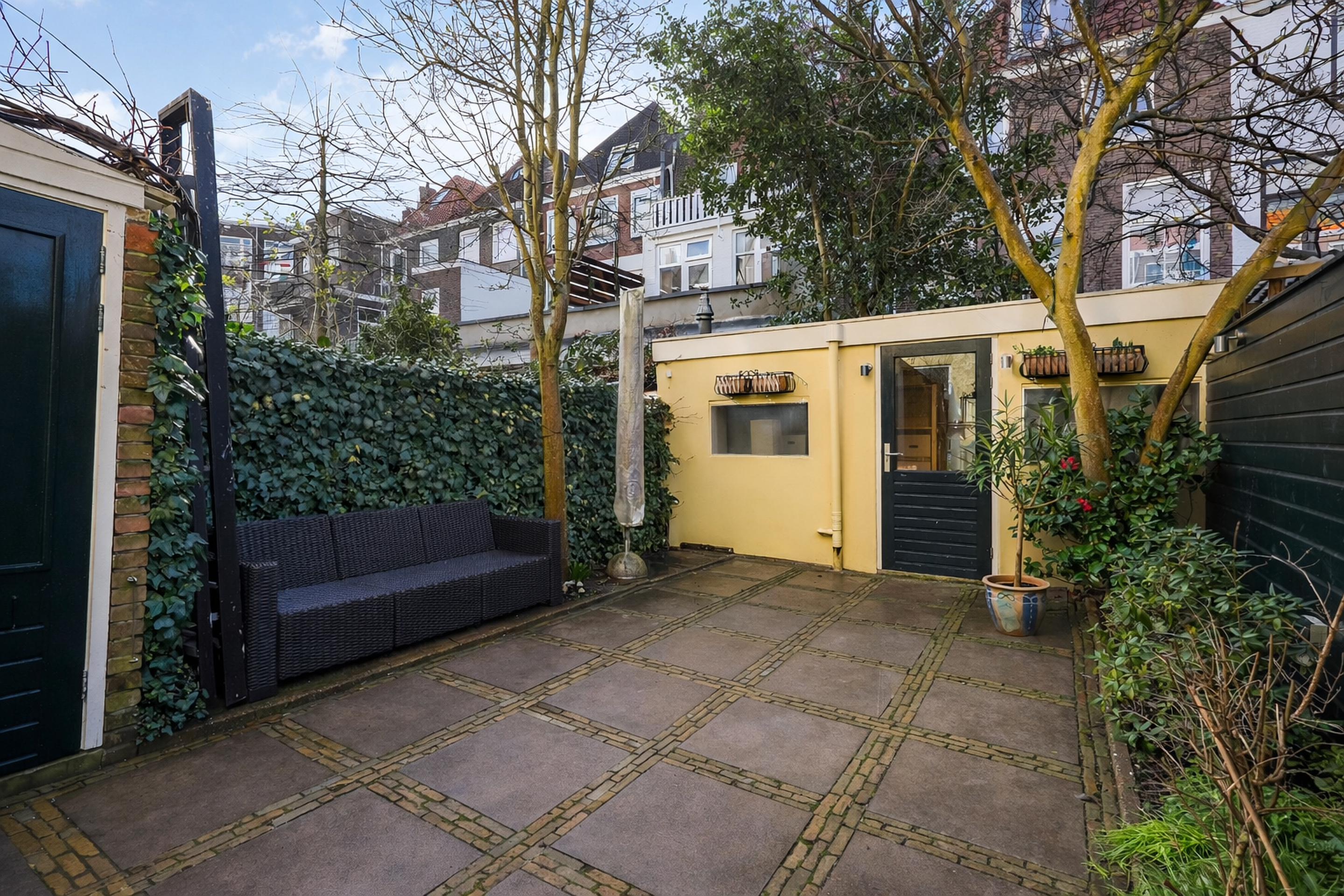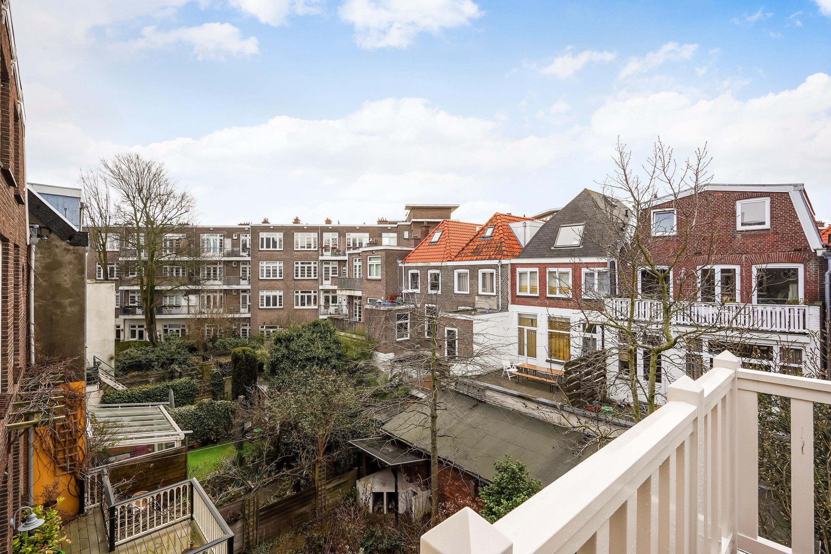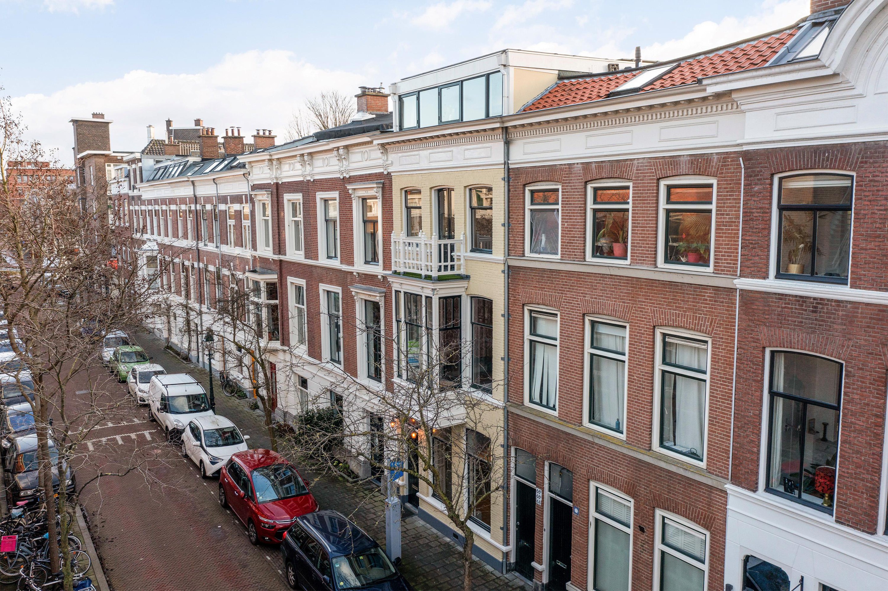 De voorgevel heeft een monumentale uitstraling met originele, gerestaureerde schuiframen en een prachtige erker met balkon. Aan de achterzijde beschikt het herenhuis over een beschermde binnentuin op het zuidwesten en een dubbele uitbouw met dakterras. Het dakterras op de tweede verdieping ligt beschut en biedt bij zonnig weer de mogelijkheid om vanaf 10 uur ’s ochtends tot zonsondergang van de zon te genieten. In de achtertuin bevinden zich een ruime tuinkast voor tuingereedschap en een schuur met de opstelplaats voor de cv-ketel en de 256 liter elektrische boiler, die wordt opgewarmd met zonnestroom.