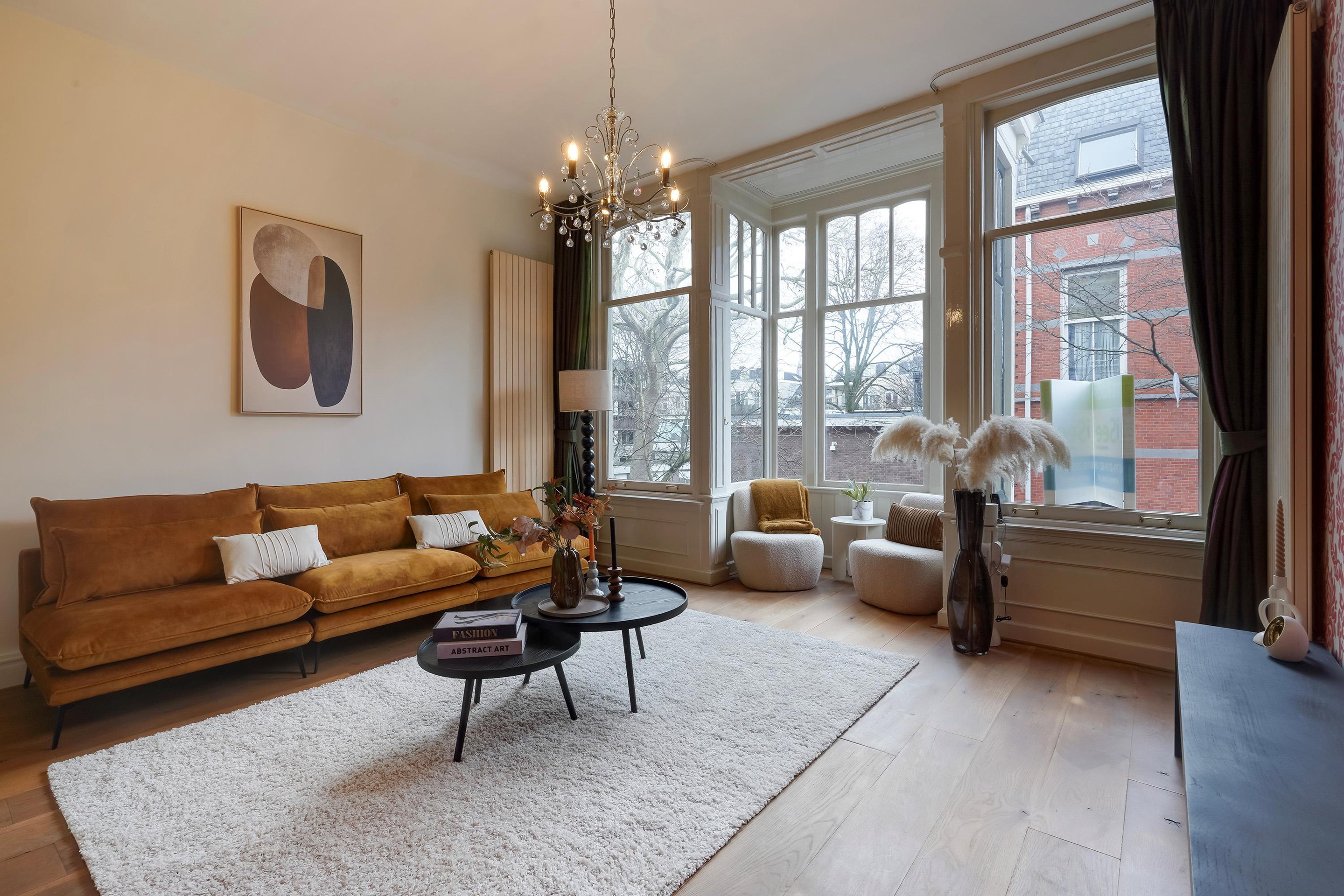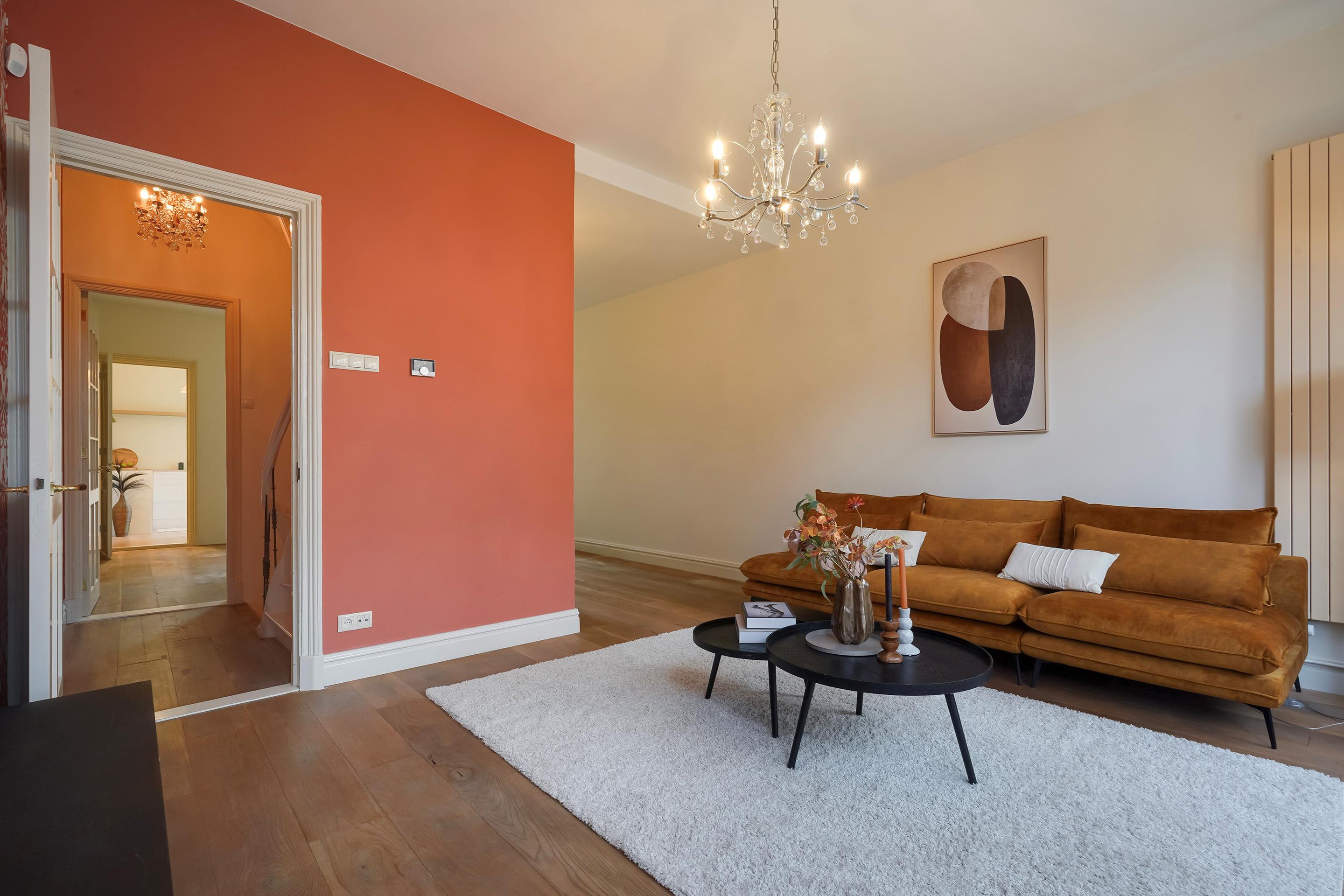 Overloop met toegang via de monumentale trap naar de bel-etage met stijlvolle erker. De voorkamer met erker en de achterkamer vormen samen één royale woonkamer. Deze lichte ruimte biedt uitzicht op de binnentuin van het voormalige klooster.