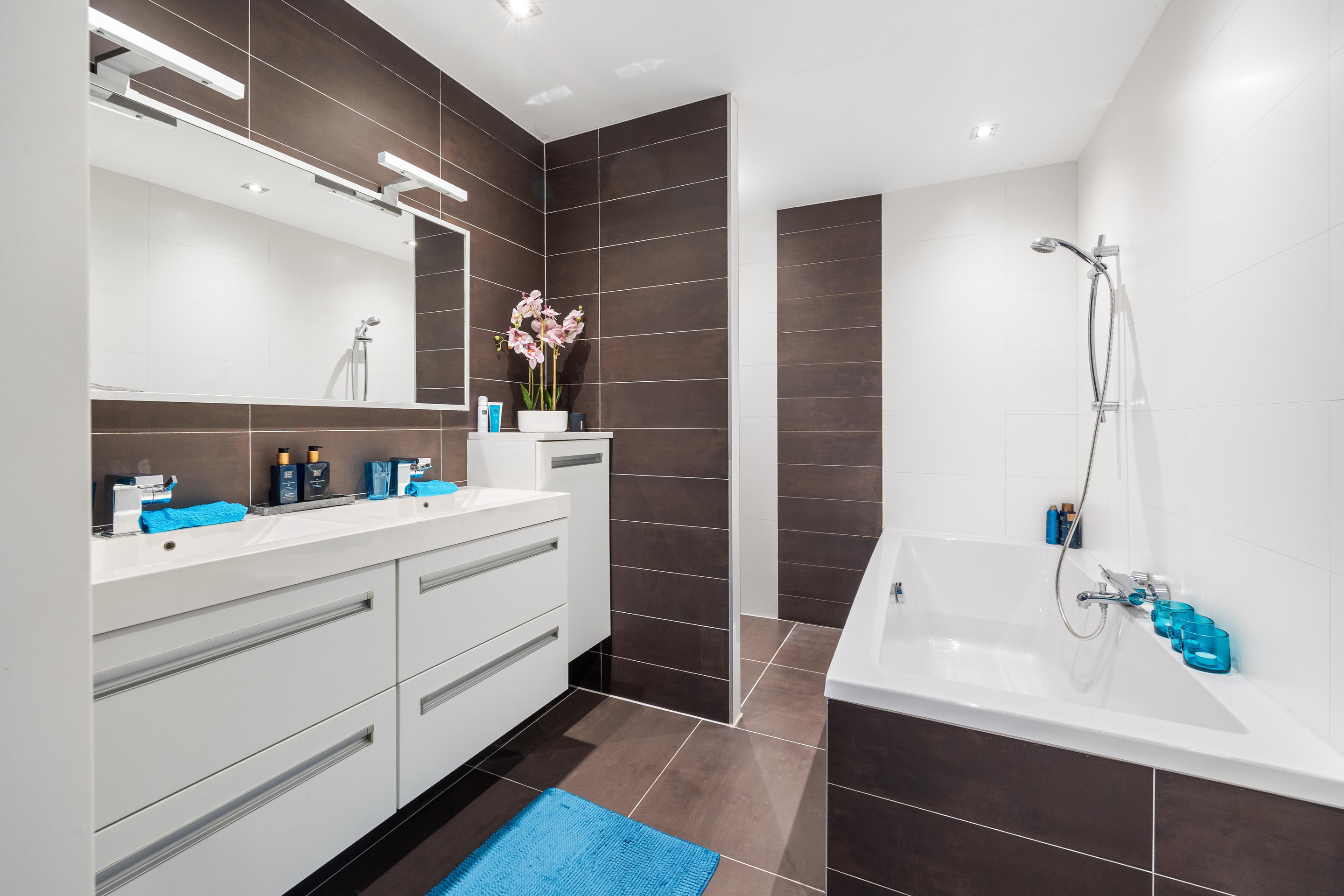 Centraal tussen de slaapkamers in vindt u de badkamer, die is uitgevoerd in een combinatie van donkerbruine en witte tegels. U beschikt hier over een douche-/ligbadcombinatie, inloopdouche met rain shower en een breed wastafelmeubel met dubbele wastafel en brede spiegel.