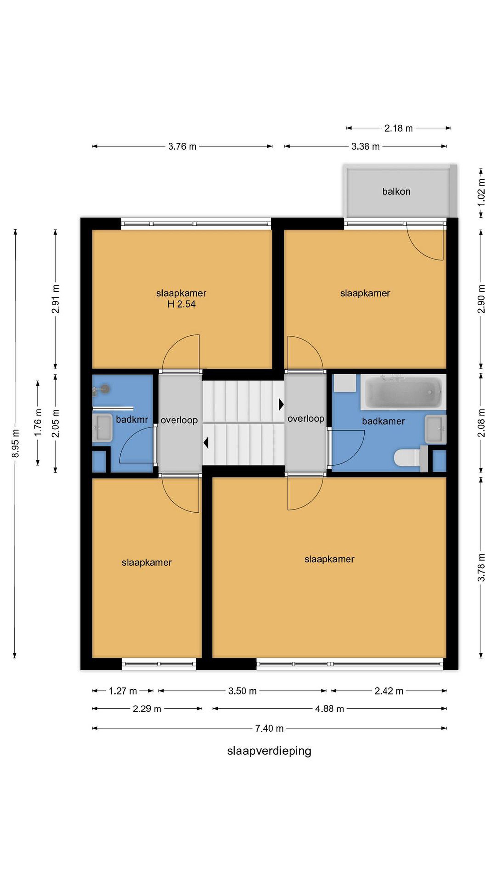 Overloop, gastenbadkamer met inloopdouche en wc, voorslaapkamer, slaapkamer aan de achterzijde (tuinzijde).
