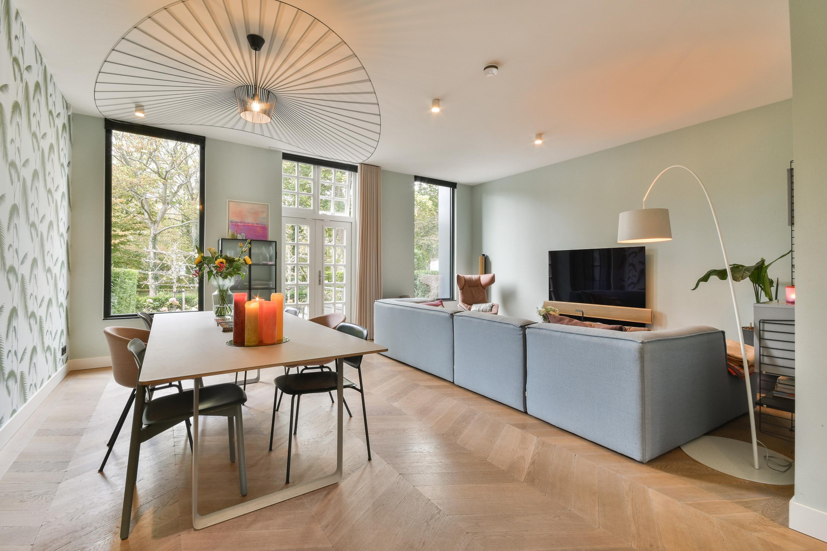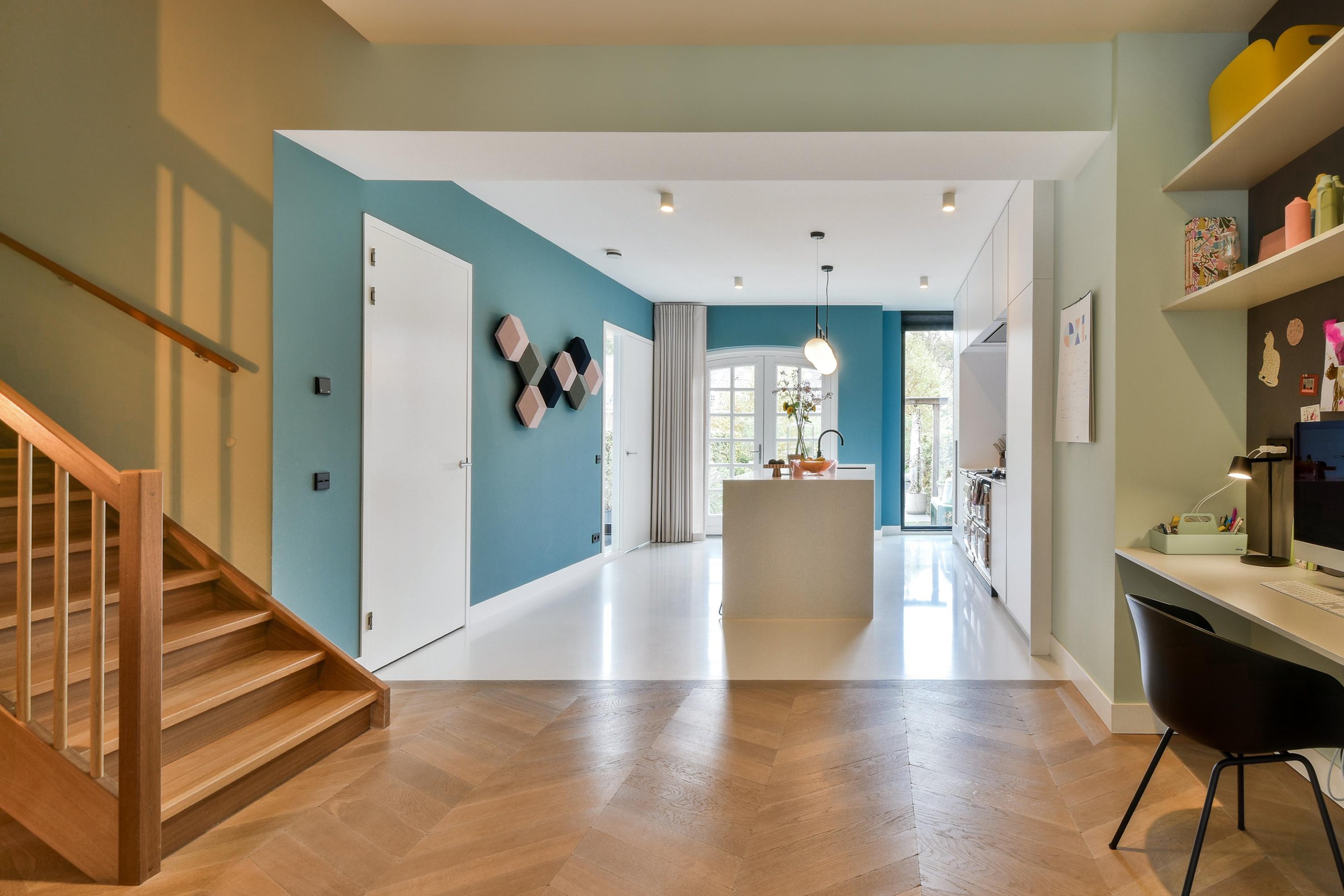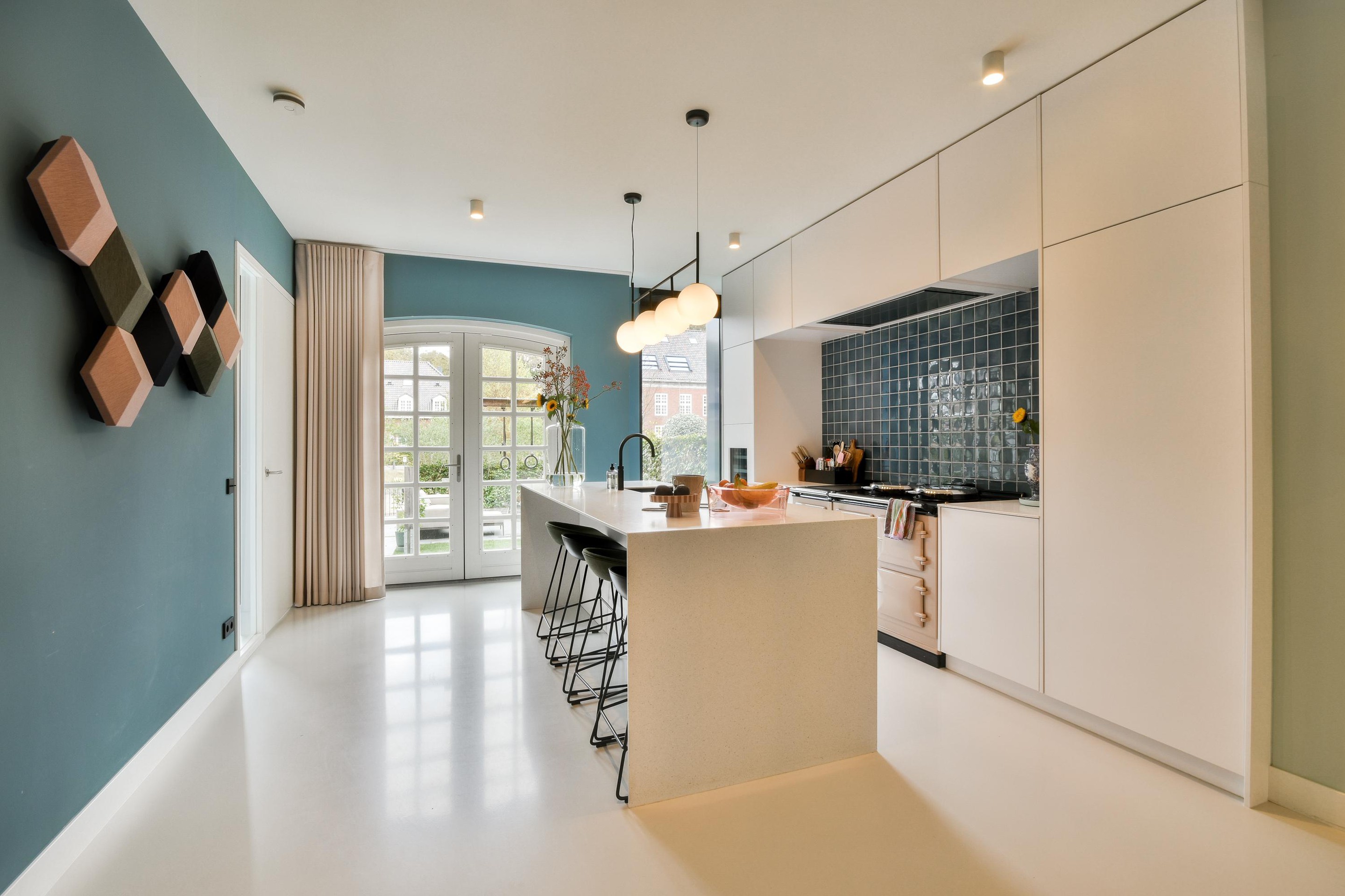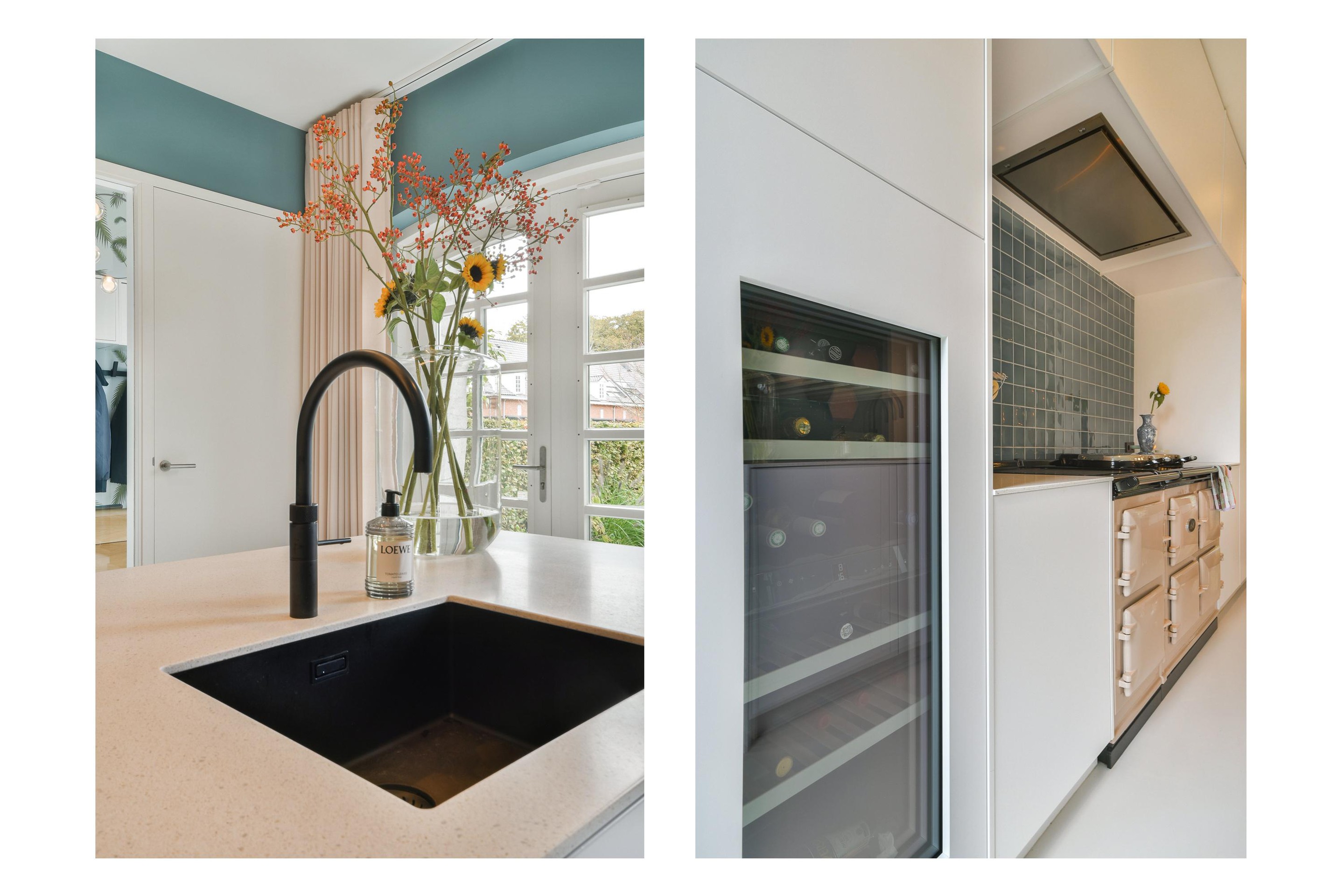 Upon entering through the spacious hall, you step into a bright and stylish living area with Hungarian point wooden flooring. The luxurious designer kitchen features a central cooking island, a classic AGA with a cast iron core. This core retains heat exceptionally efficiently and slowly transfers it to the four ovens and cooktops, ensuring it's always ready to use. A built-in climate control cabinet for wine lovers, a refrigerator and freezer, a dishwasher, and a Quooker are also available. The adjacent living room exudes elegance and warmth, with high ceilings (2.93m), large windows, and French doors leading to the beautiful southeast-facing garden (approx. 52m2) – a perfect place to relax or entertain guests.