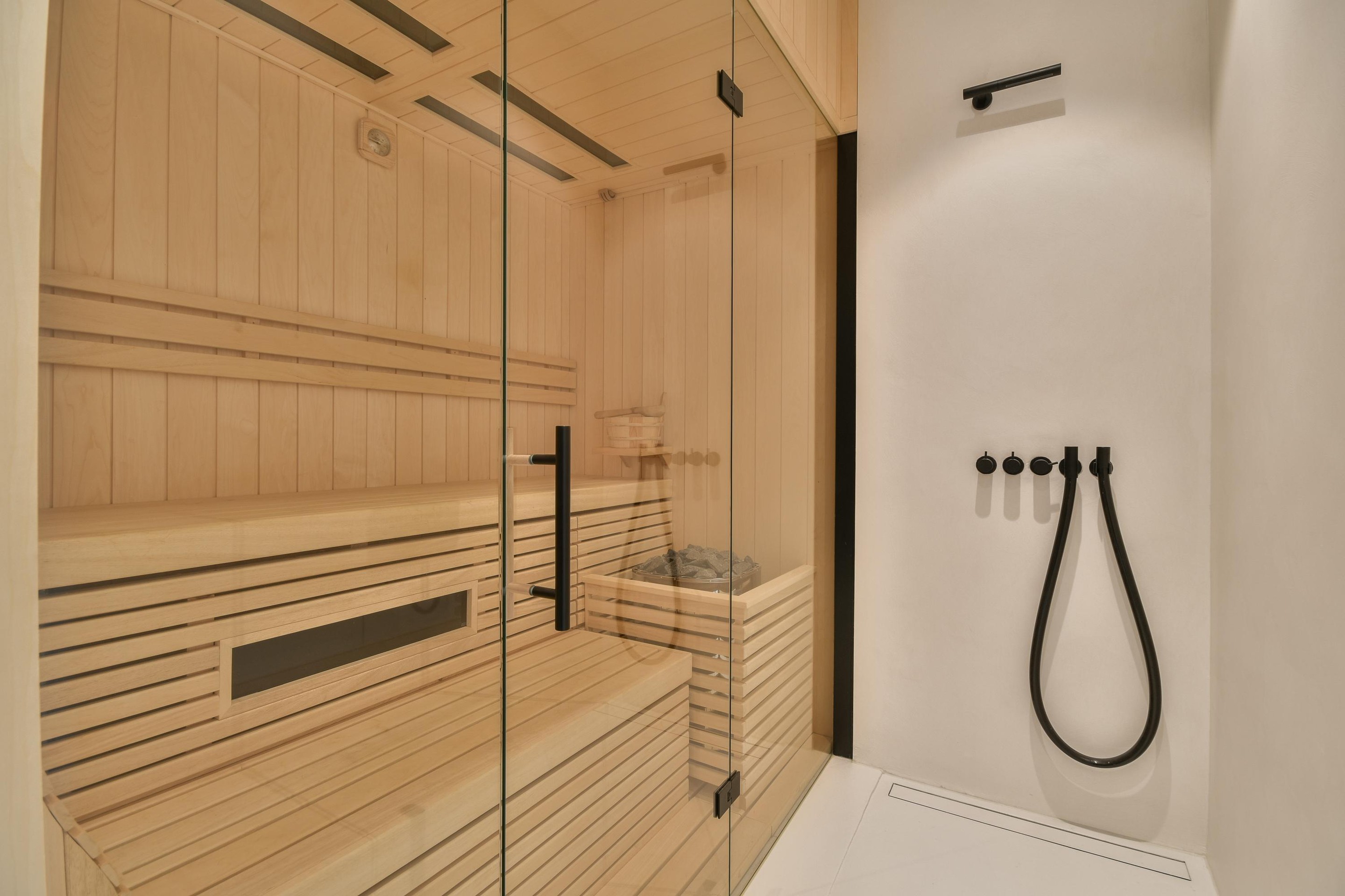 - Three bathrooms, one with a sauna
