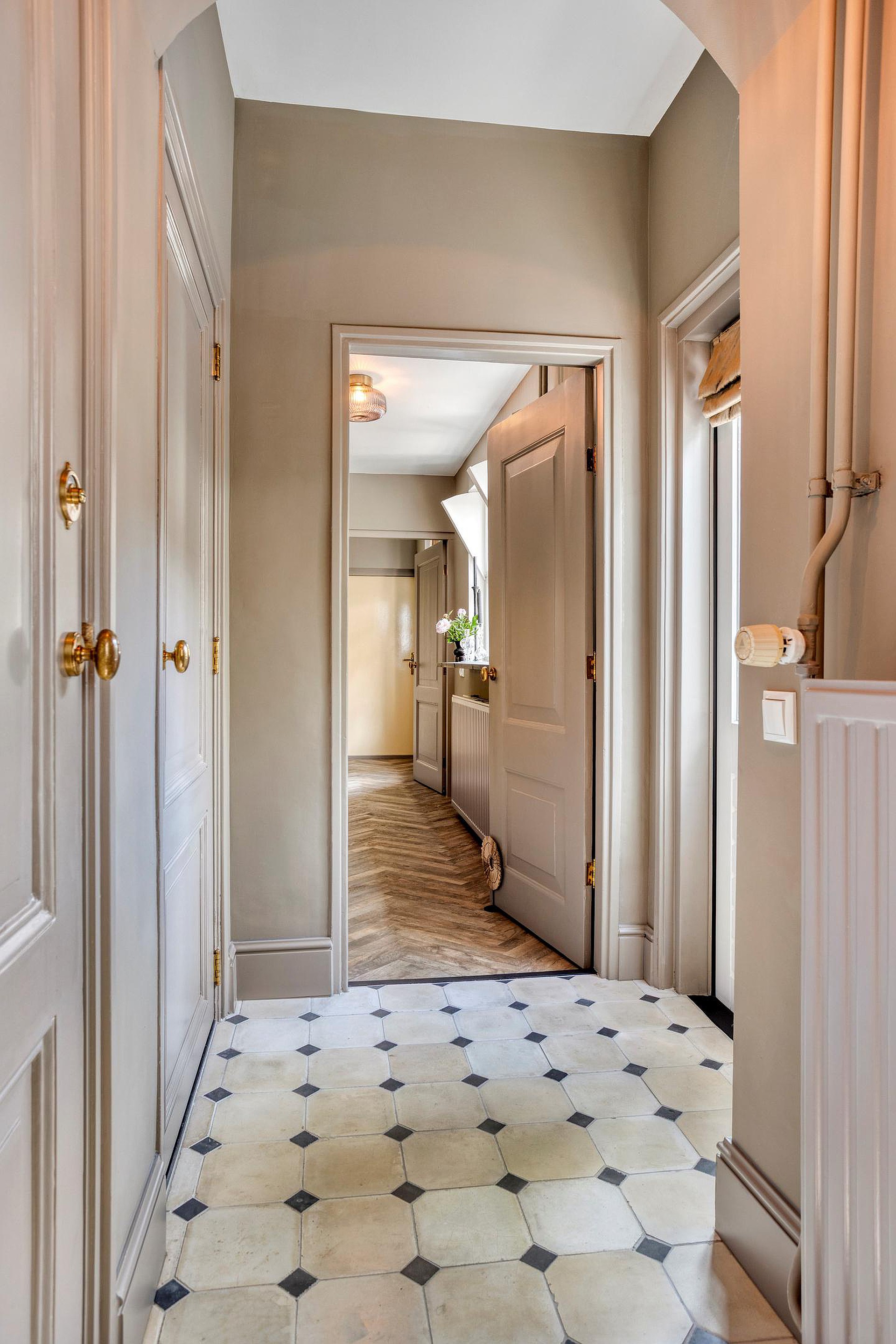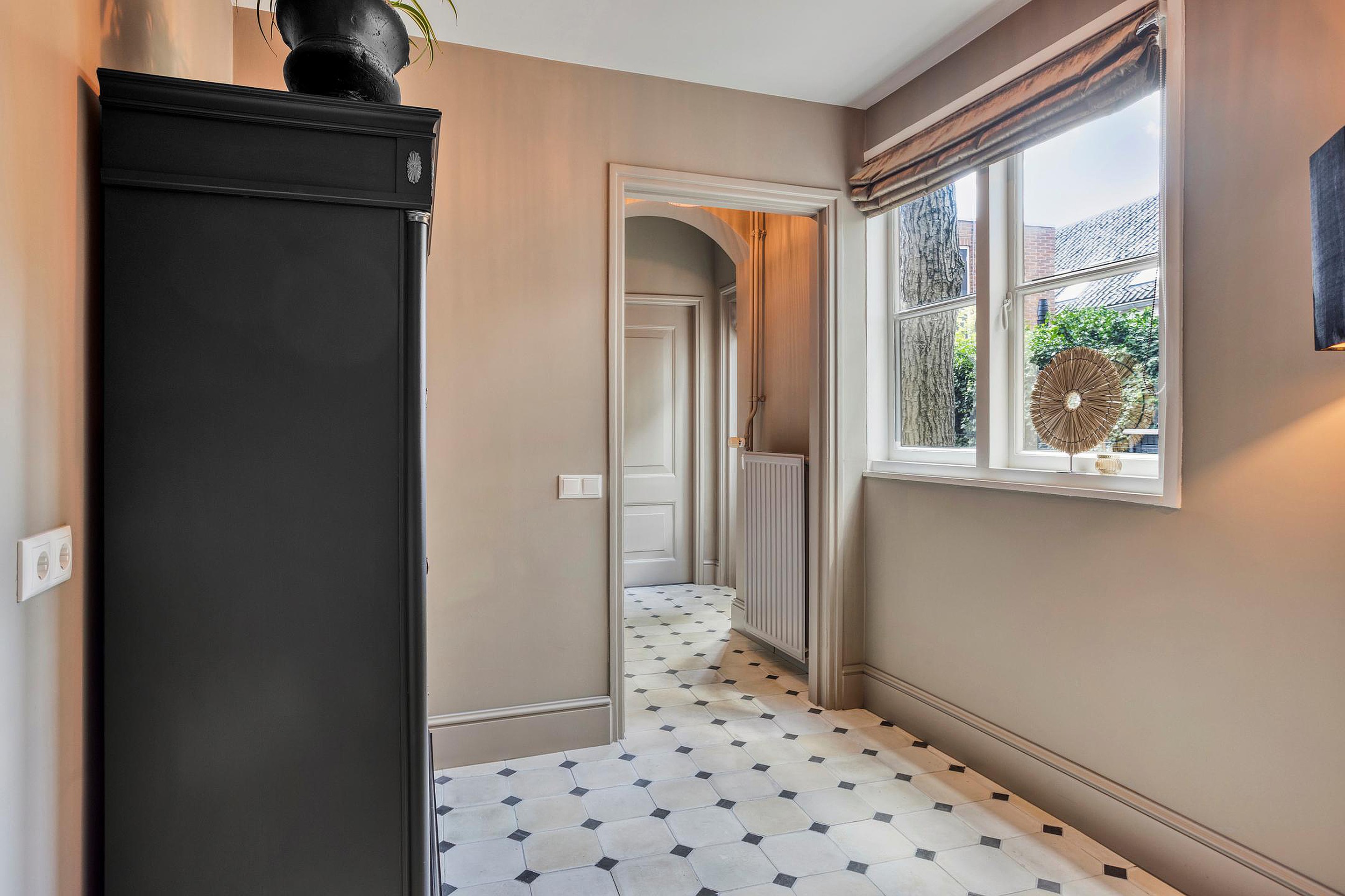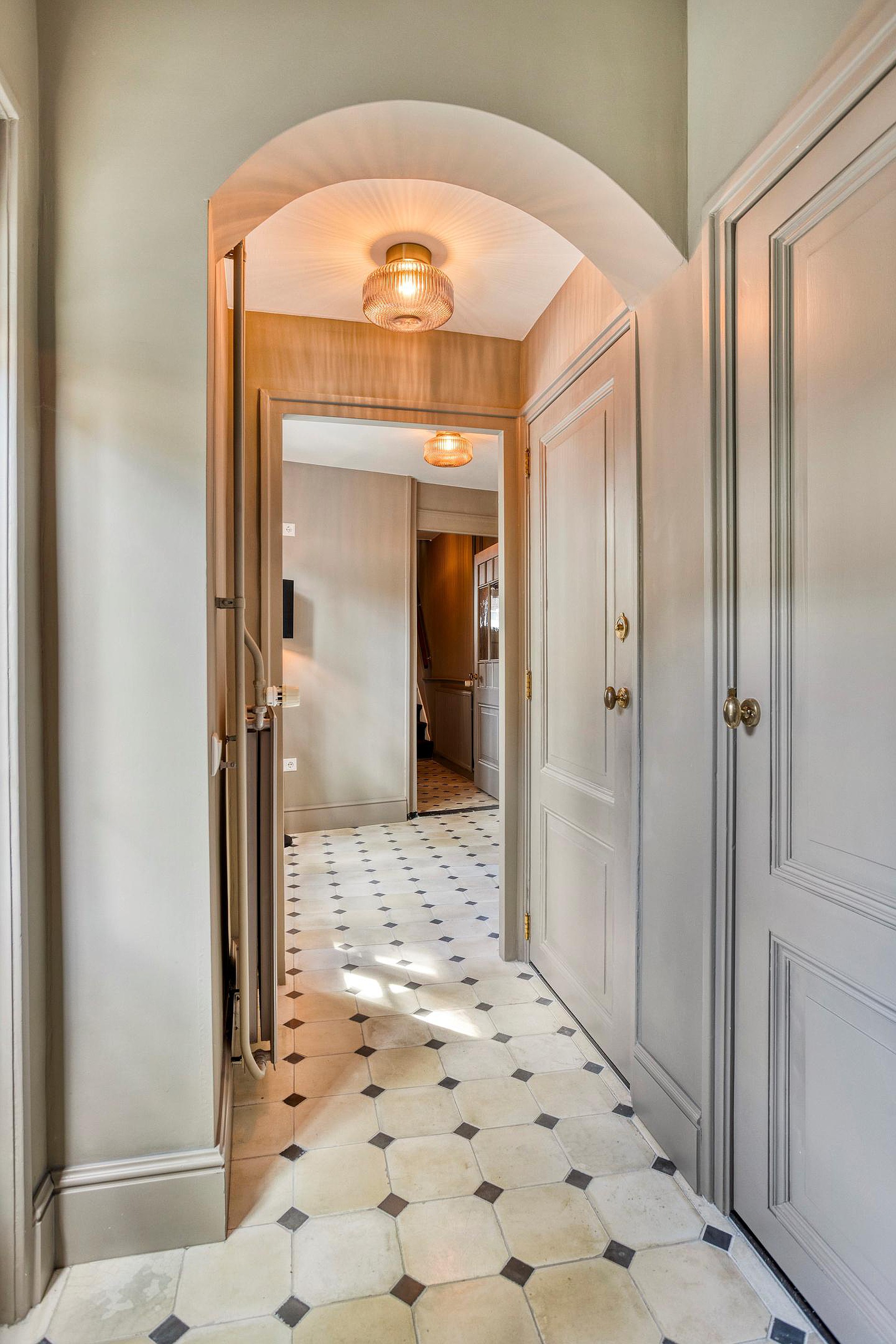 De royale hal geeft meteen de toon aan: hoog plafond, een combinatie van klassieke tegeltjes en strak afgewerkte wanden, stijlvolle trapopgang, paneeldeuren en een authentieke sfeer. Vanuit hier loopt u door naar diverse ruimtes, waaronder de woonkamer, eetkamer, het toilet met fonteintje en de keuken.