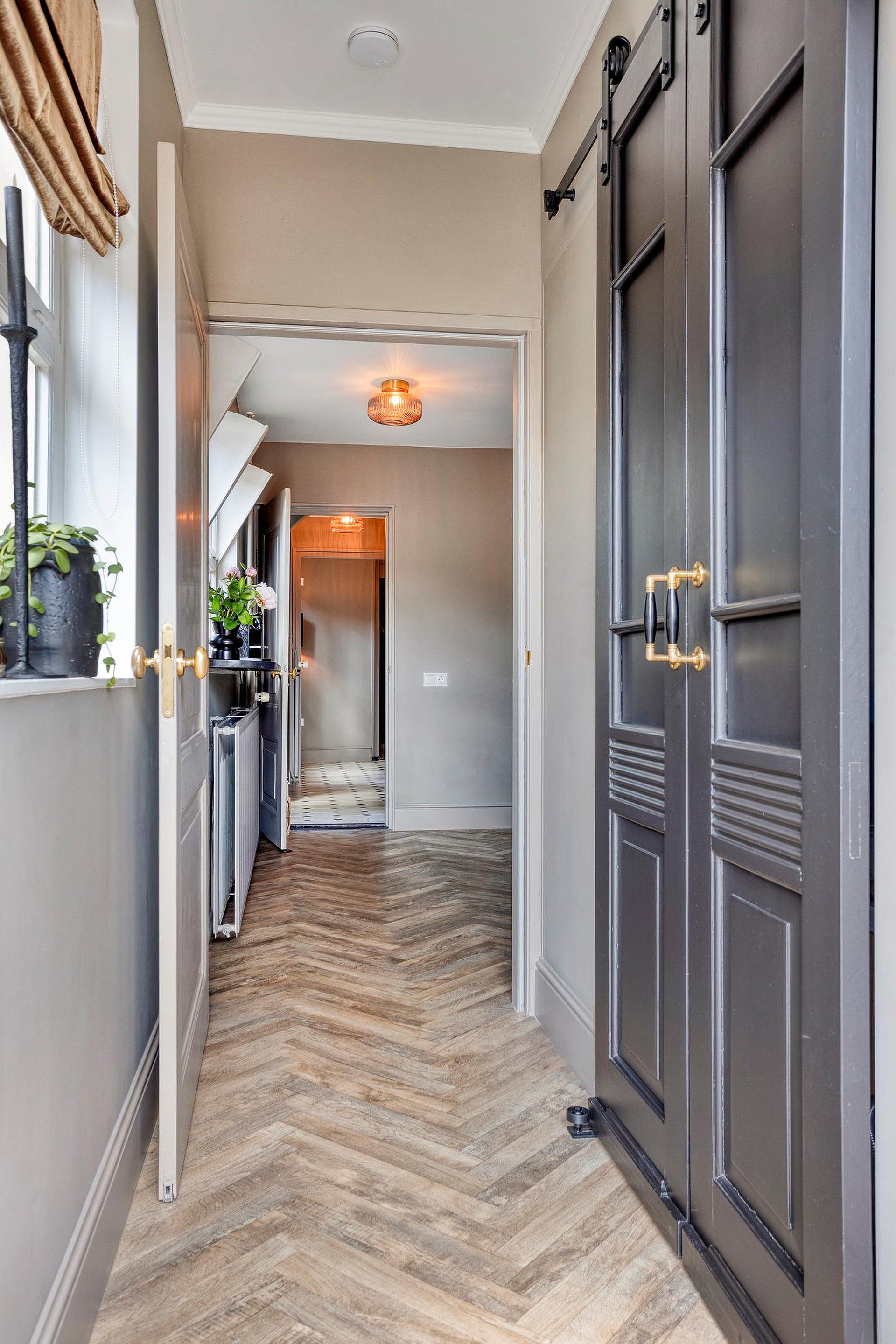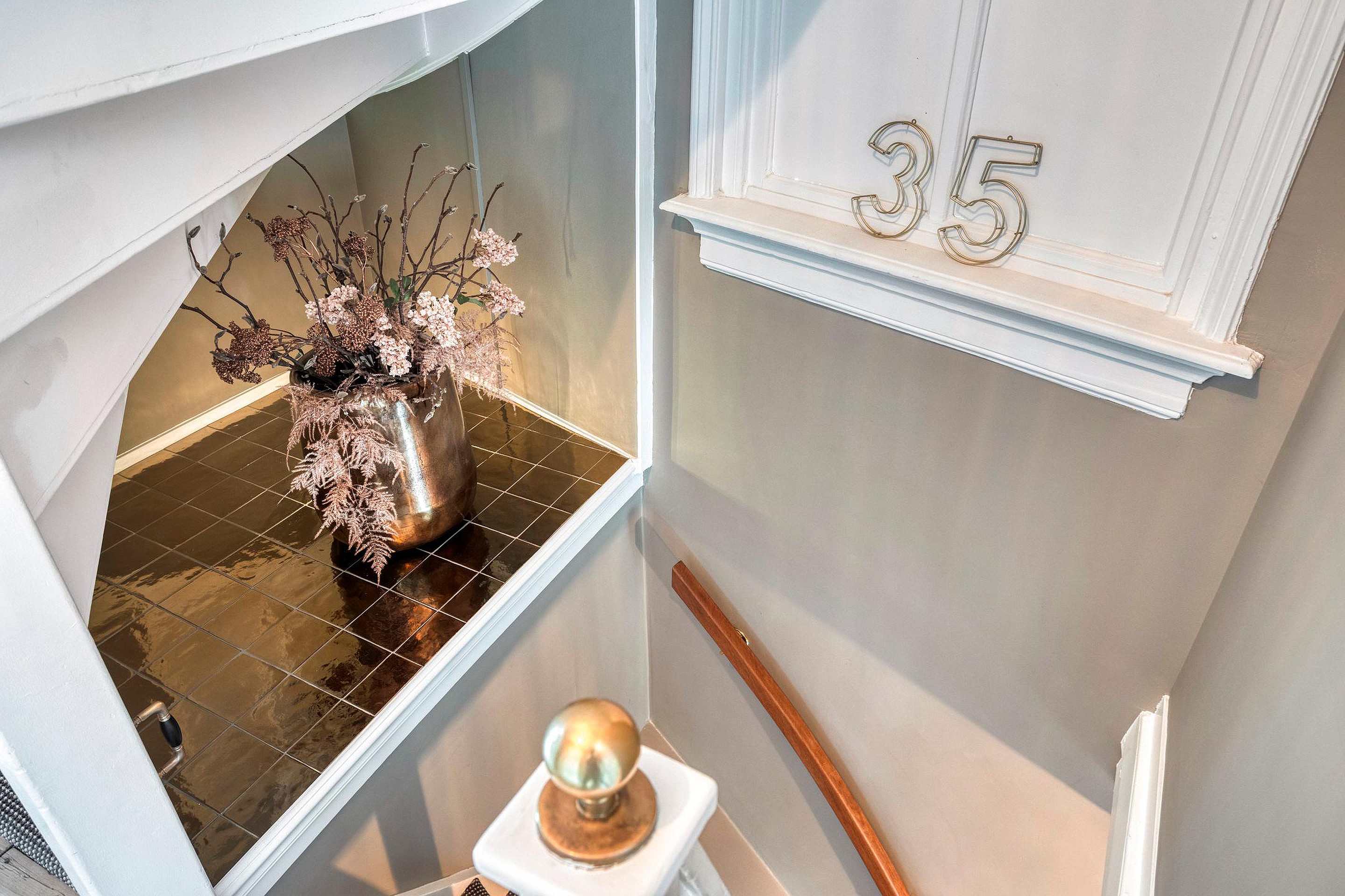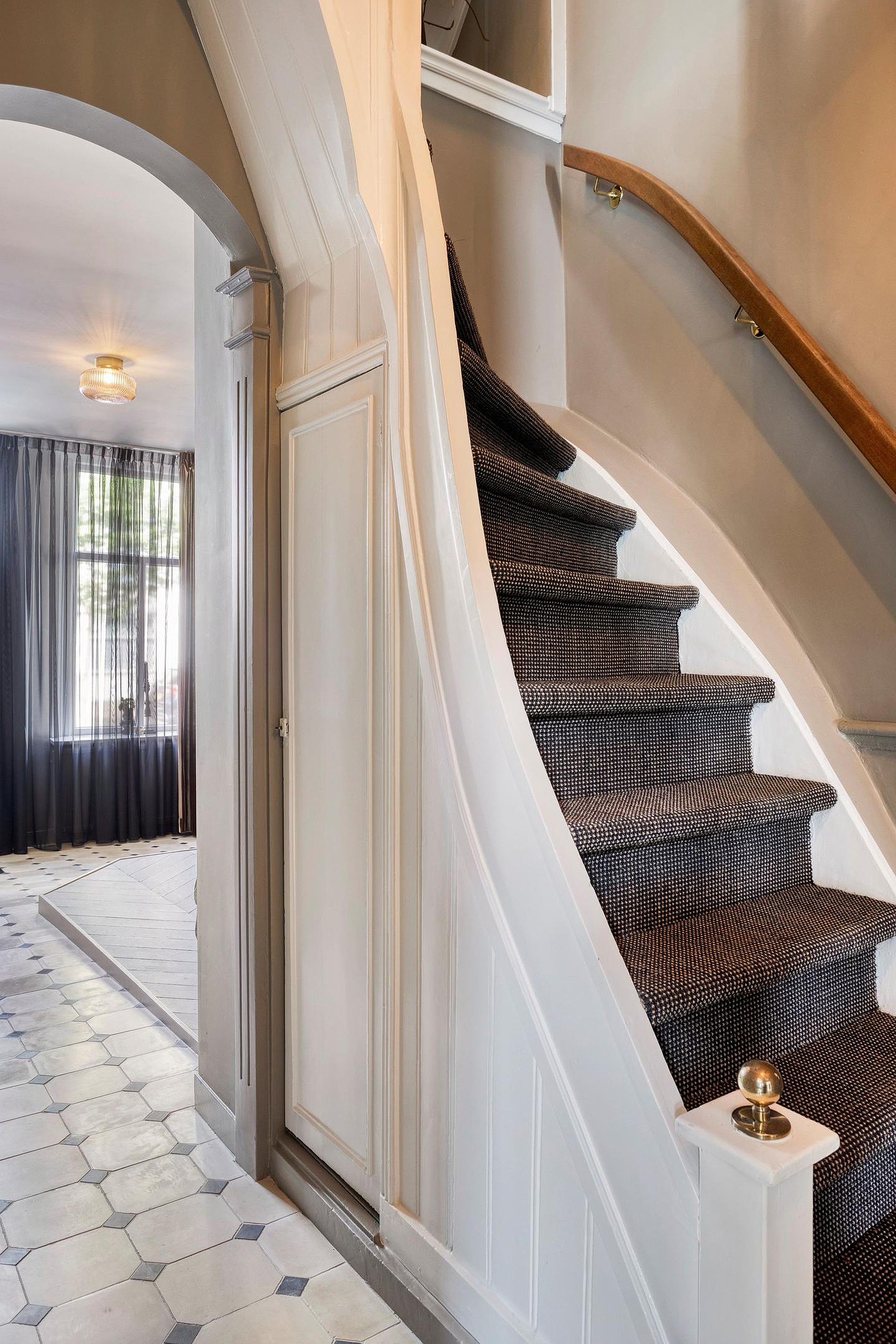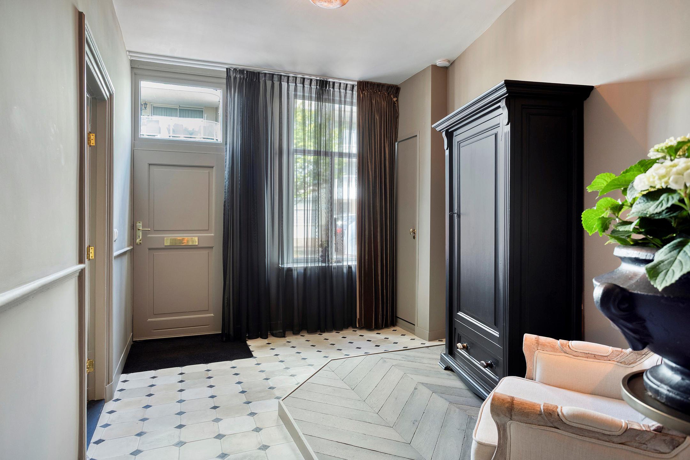 De royale hal geeft meteen de toon aan: hoog plafond, een combinatie van klassieke tegeltjes en strak afgewerkte wanden, stijlvolle trapopgang, paneeldeuren en een authentieke sfeer. Vanuit hier loopt u door naar diverse ruimtes, waaronder de woonkamer, eetkamer, het toilet met fonteintje en de keuken.