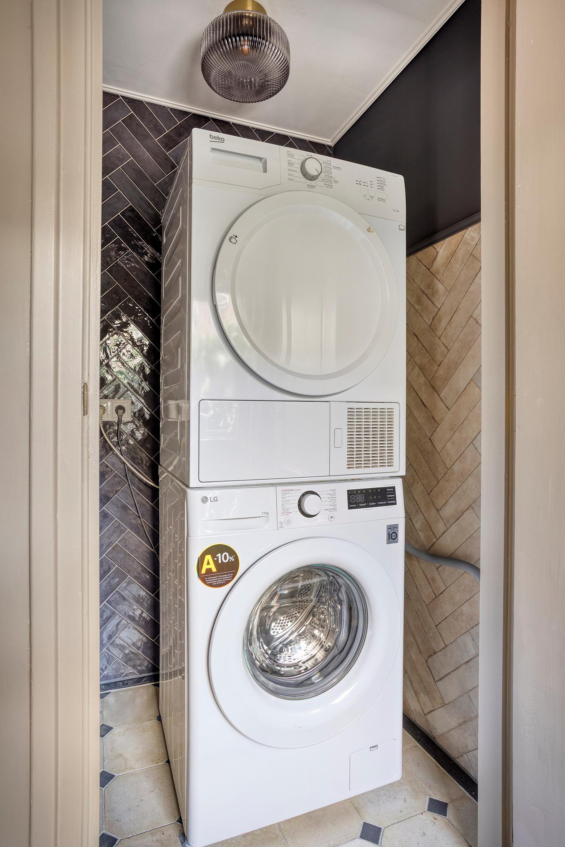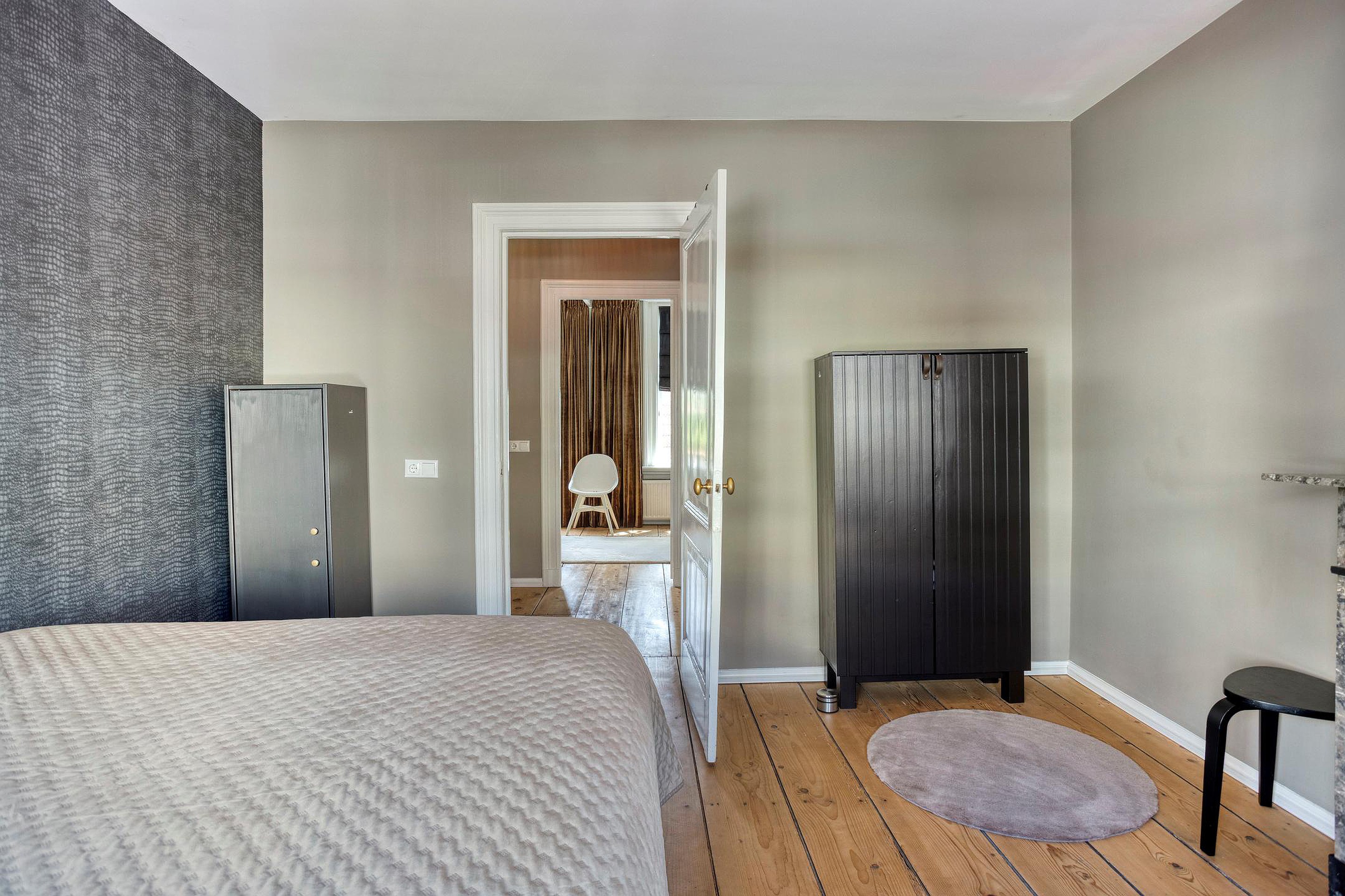 De kamer heeft een rustige uitstraling, perfect om u terug te trekken na een lange dag. Ook de andere kamers worden heerlijk verlicht door de grote raampartijen en hebben nog de prachtige originele houten vloer. De badkamer is stijlvol betegeld en uitgerust met een regendouche, een robuust eiken meubel met waskom, geïntegreerde kraan en een tweede toilet. Alles is in lichte, natuurlijke tinten uitgevoerd, wat zorgt voor een frisse en luxe uitstraling.
