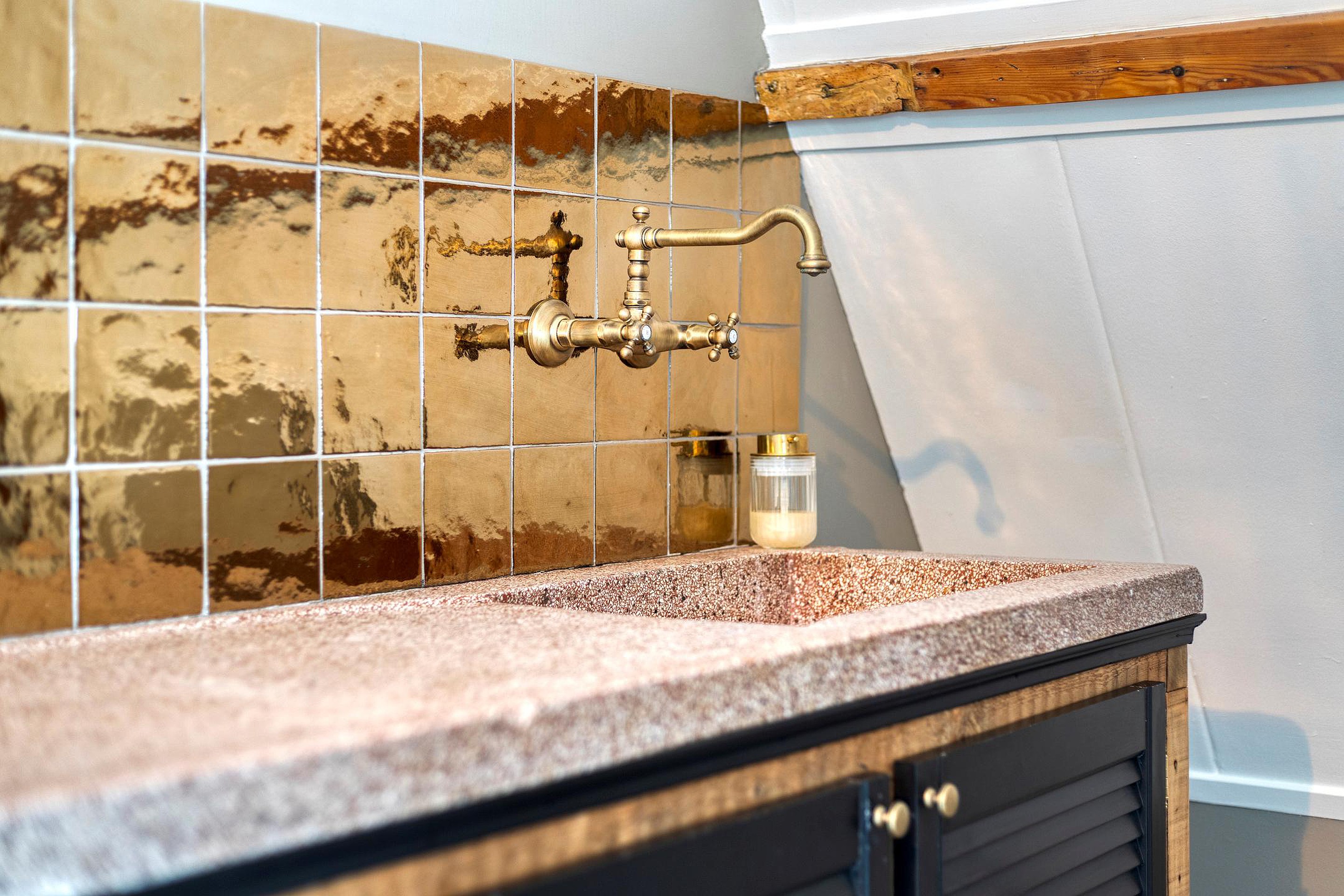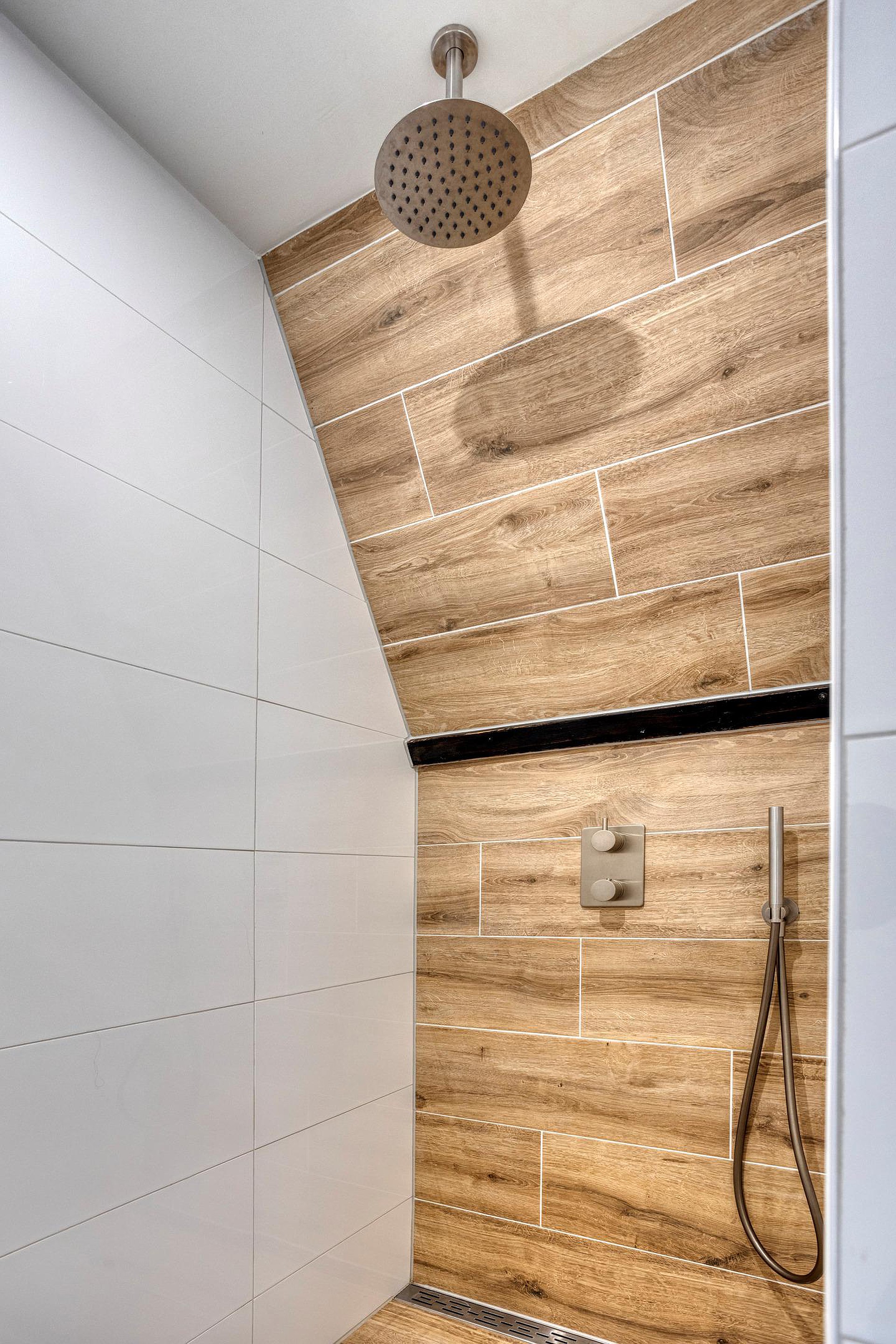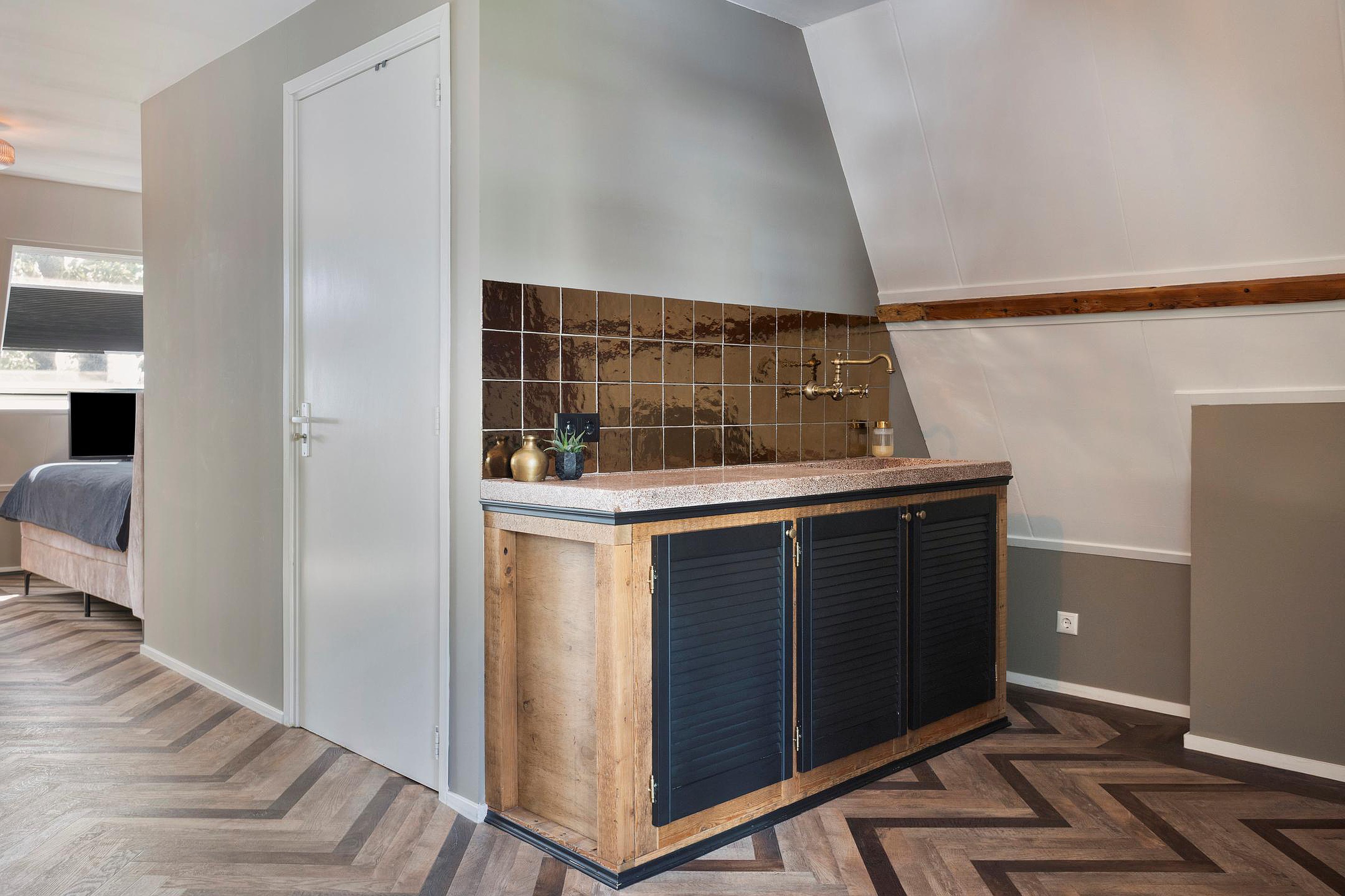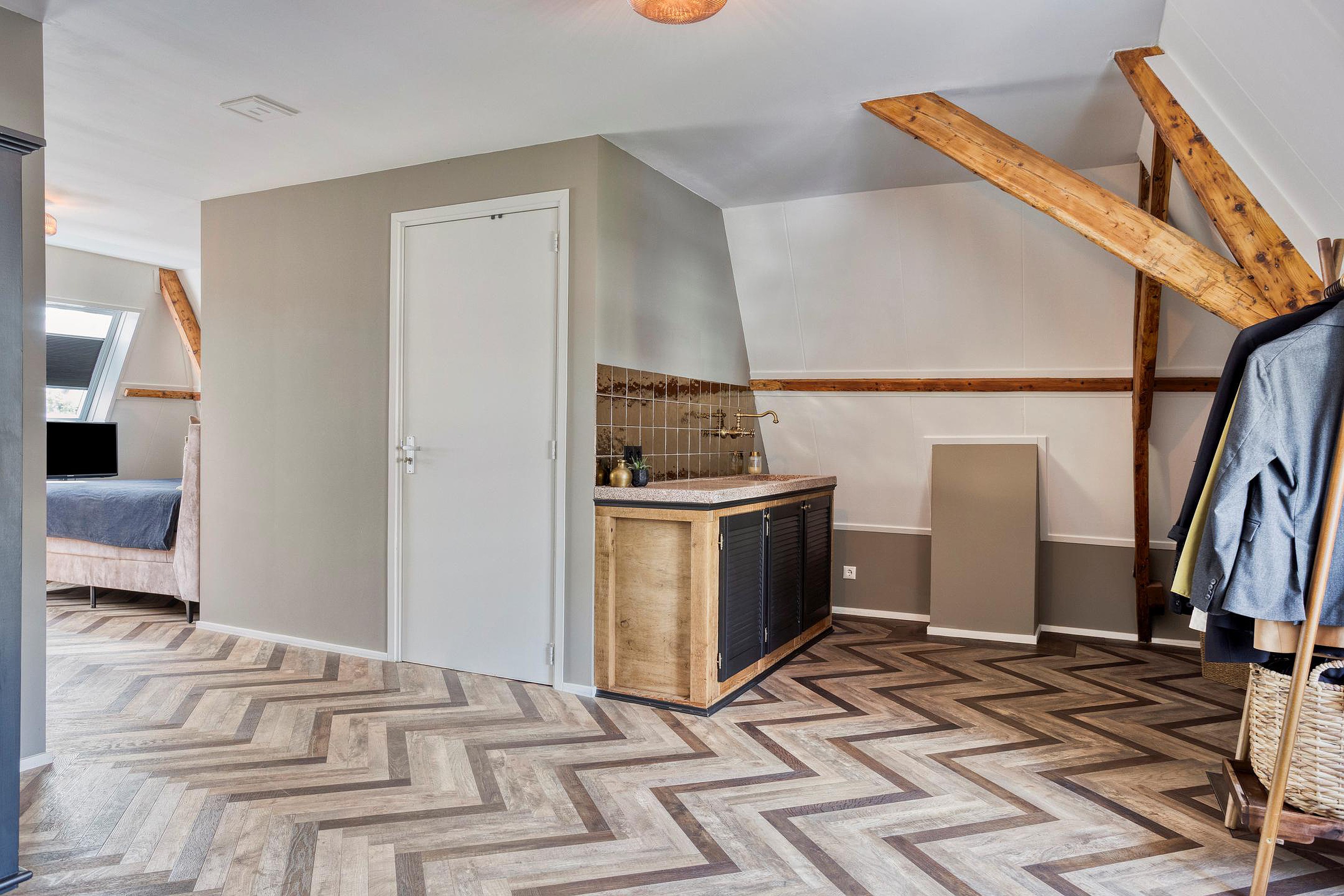 Op de tweede verdieping wordt u verrast door een royale, open ruimte met een bijzondere indeling. Meteen valt de warme uitstraling op dankzij de fraaie vloer en de zichtbare houten spanten die deze etage een bijzonder karakter en aangename sfeer geven. De verdieping is zo ingedeeld dat het slaapgedeelte, de loungehoek en werk/studeerplek met elkaar in verbinding staan. Deze verdieping beschikt tevens over een eigen pantry met origineel granito aanrechtblad , een eigen badkamer, stijlvol afgewerkt met houtlook tegelwerk, witte wandtegels en zwarte balkdetails. De badkamer is uitgerust met een inloop regendouche, een wandcloset en ook hier vindt u een waskom op een robuust eiken blad en geïntegreerde kraan. Een heerlijke luxe toevoeging, waardoor deze verdieping uitstekend kan functioneren als thuiskantoor, zelfstandig (gasten)verblijf , loft voor één van uw kinderen, of uw royale master suite!
