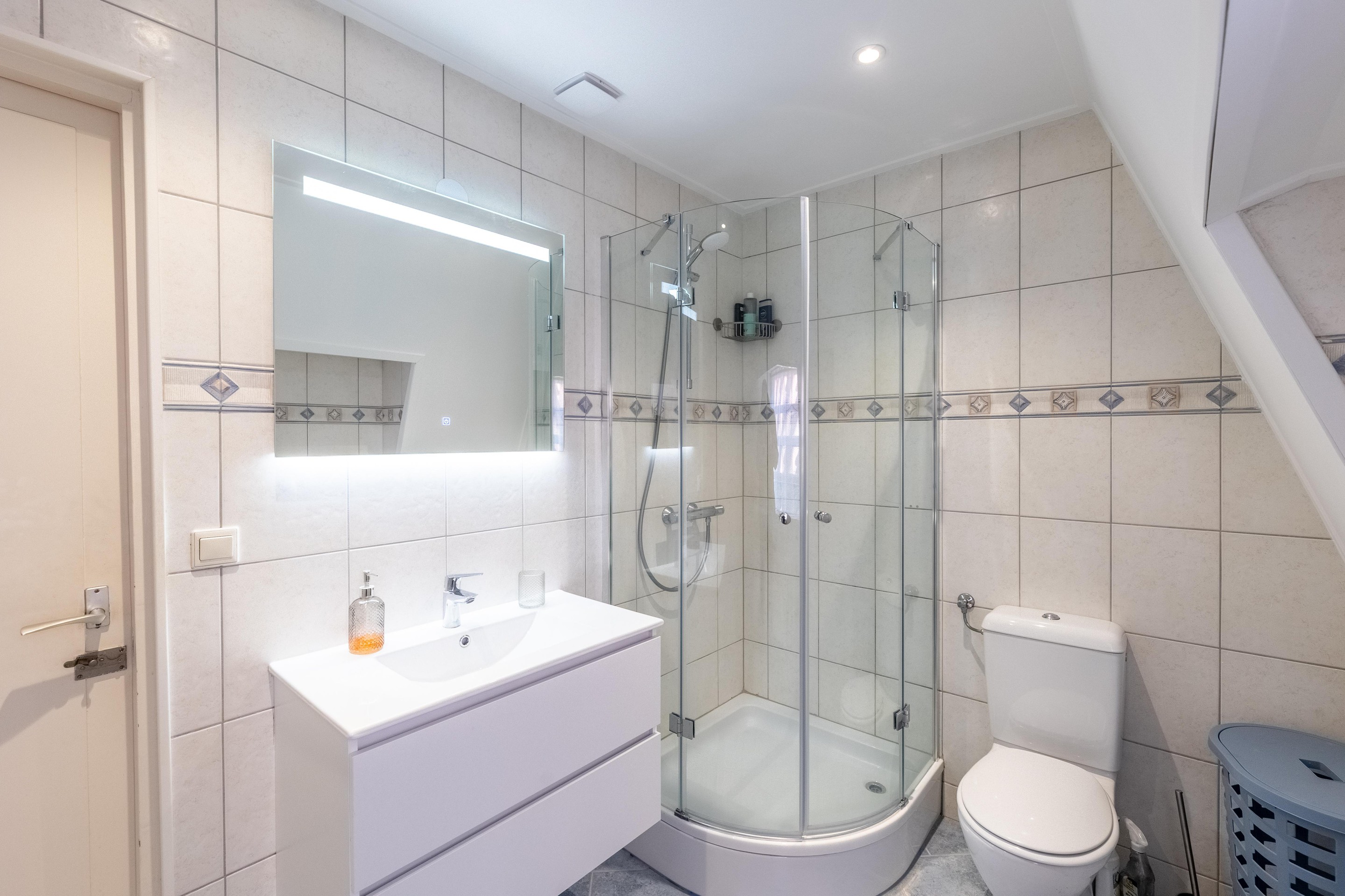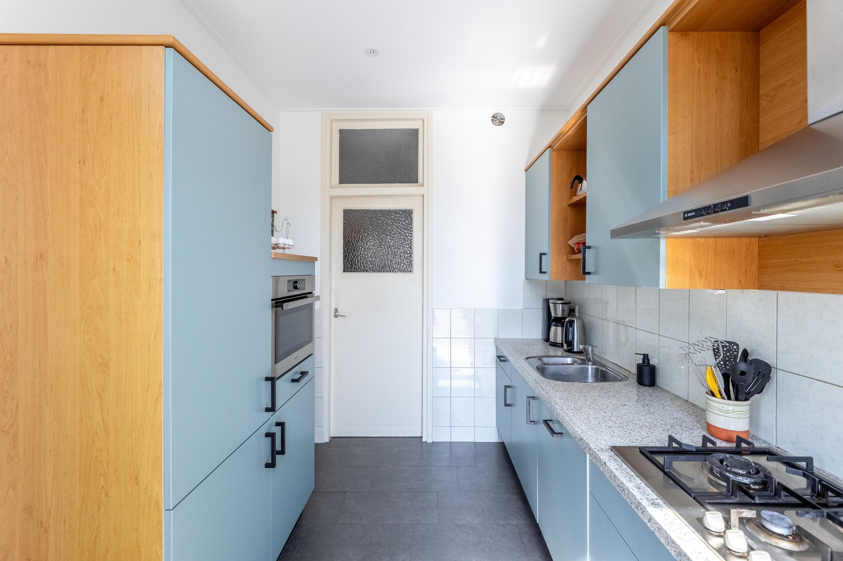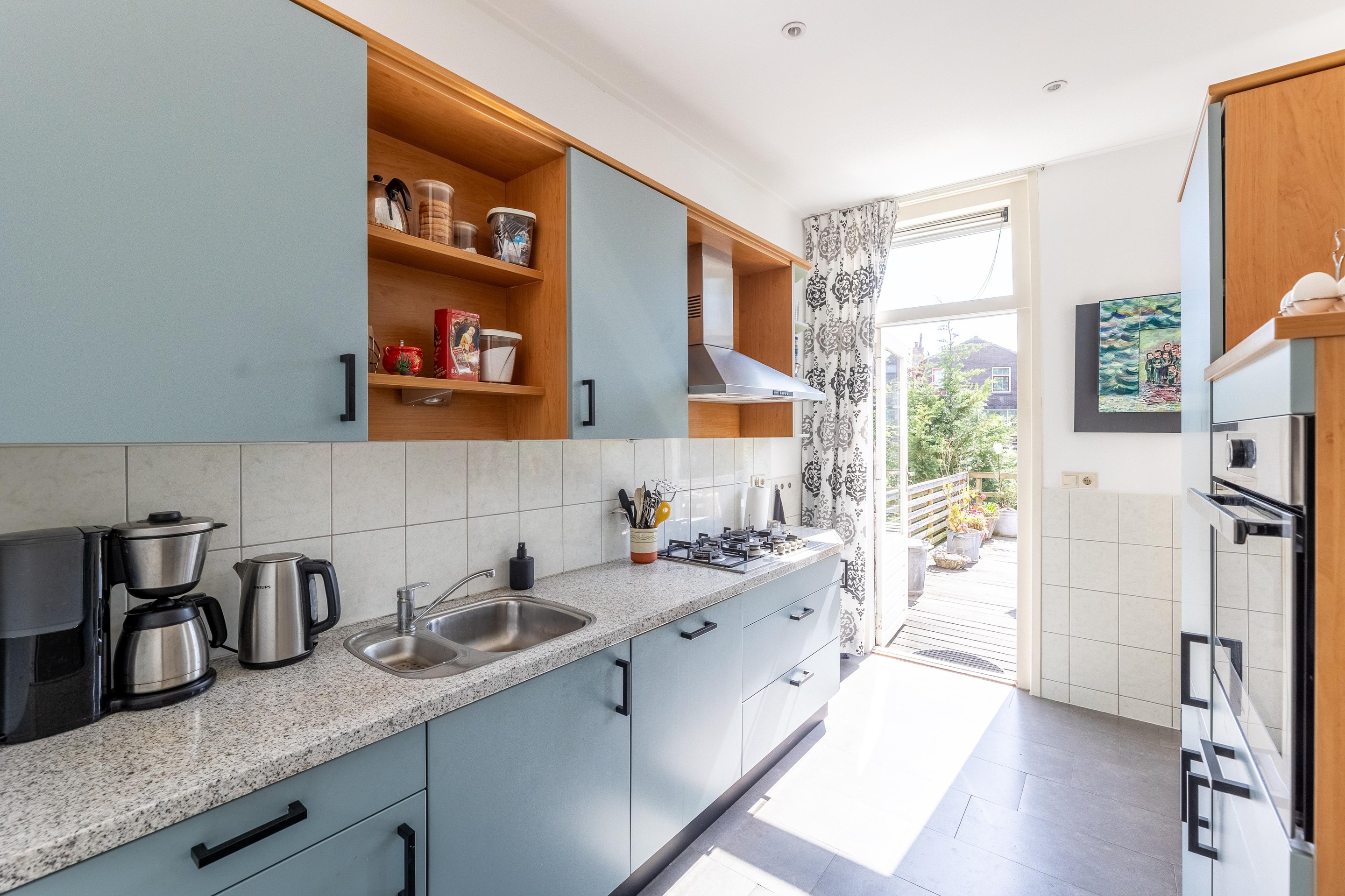 De keuken is voorzien van gaskookplaat, afzuigkap, vaatwasser, koelkast en vriezer. Vanuit de keuken heeft u toegang tot het zonnige dakterras (22 m2) aan de achterzijde.