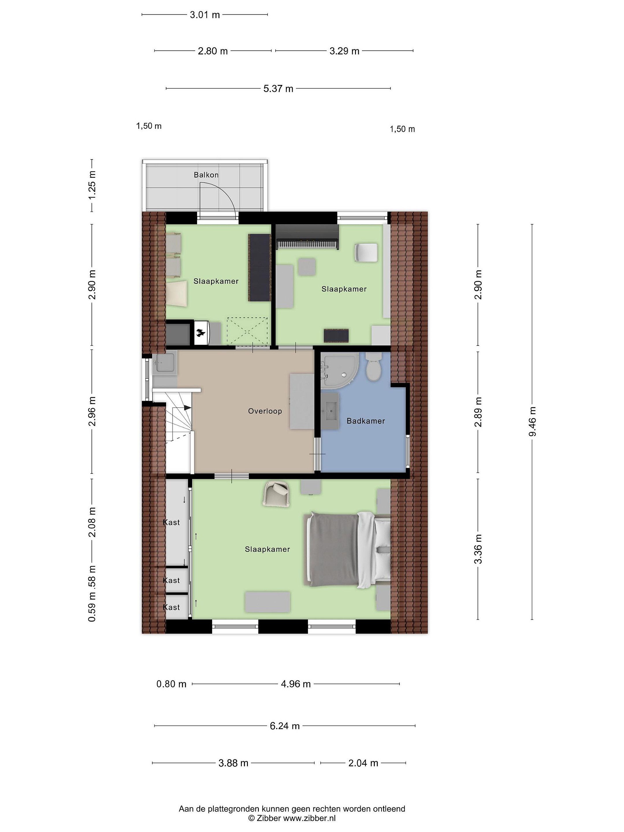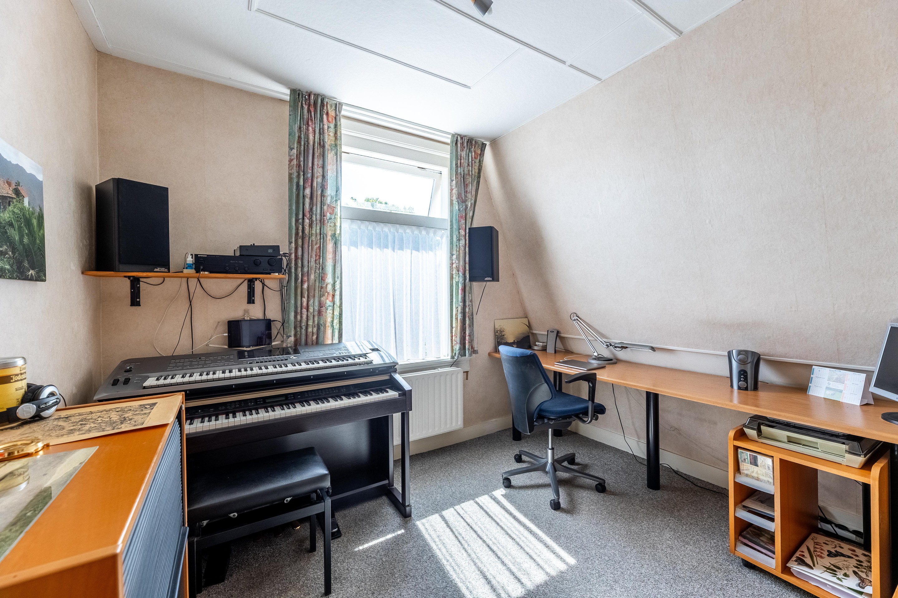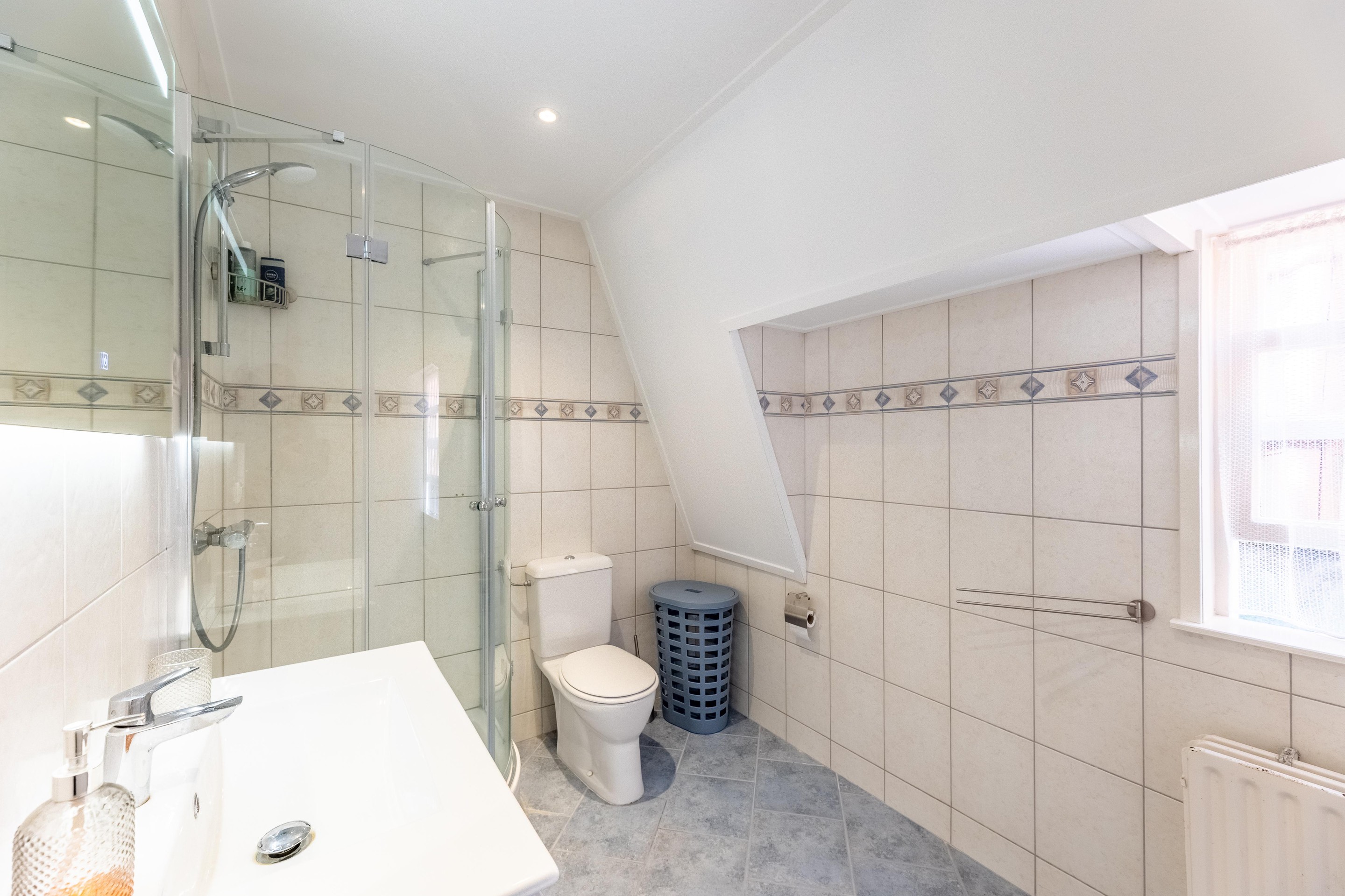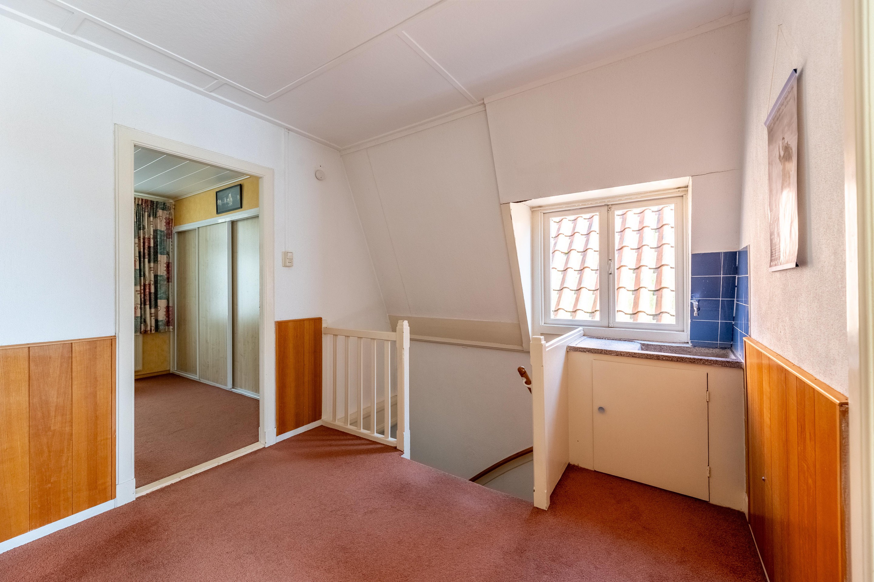 Tweede verdieping Op deze verdieping zijn de overloop, één ruime slaapkamer aan de voorzijde met vaste kast en twee kleinere slaapkamers aan de achterzijde. Eén van de kleinere slaapkamers geeft toegang tot de vliering. De badkamer is voorzien van een douchehoek, toilet en wastafel in meubel.
