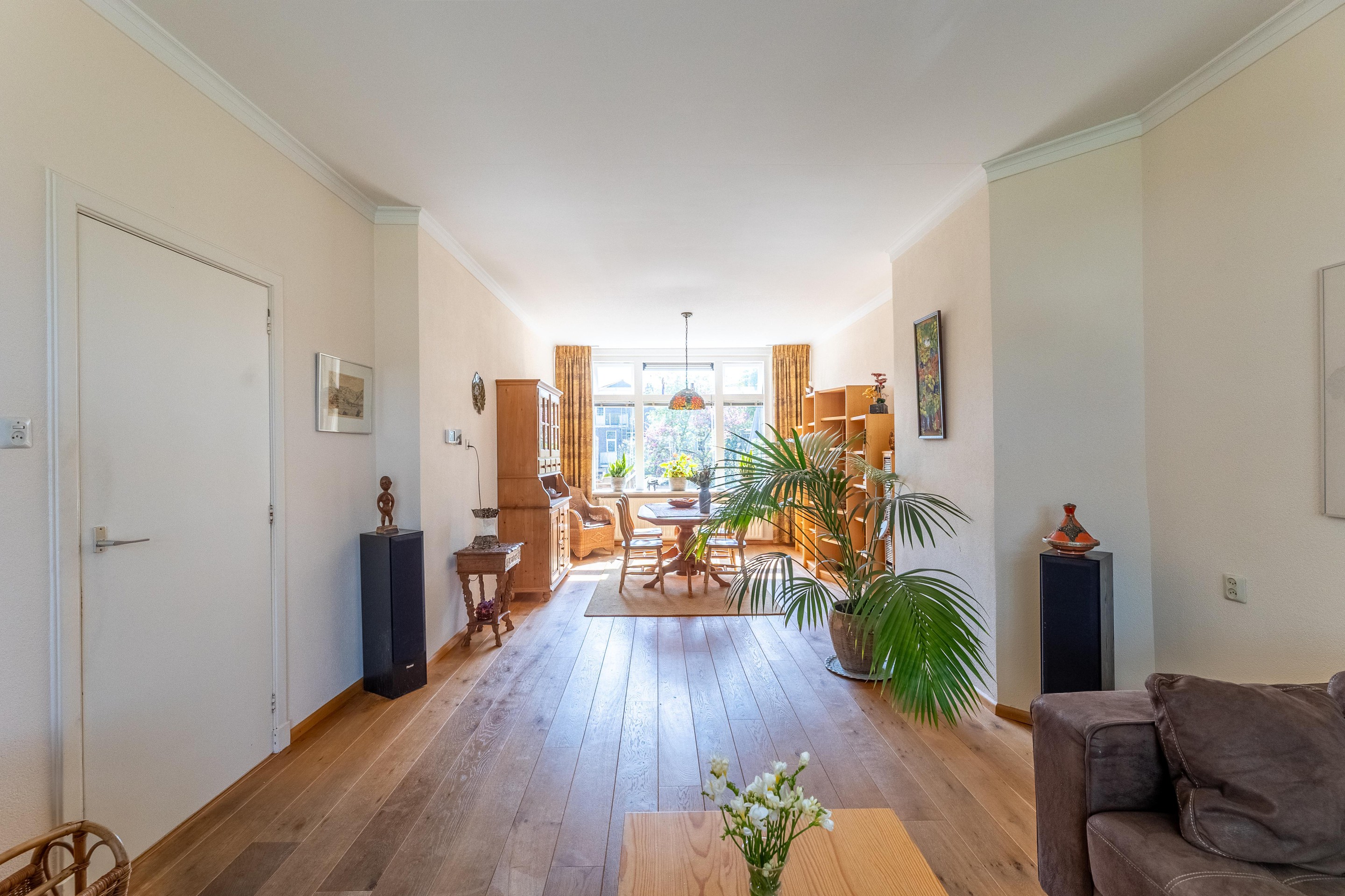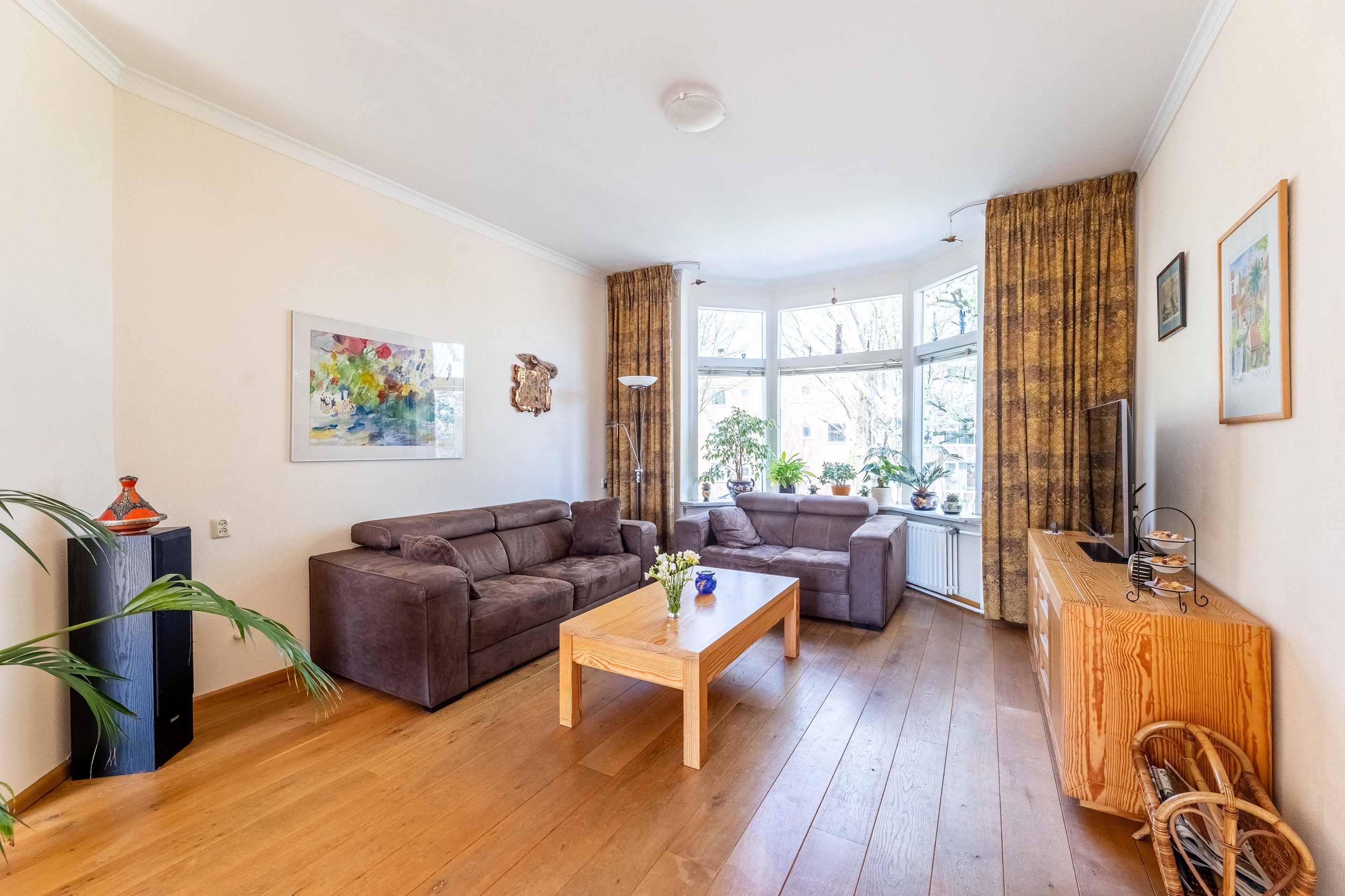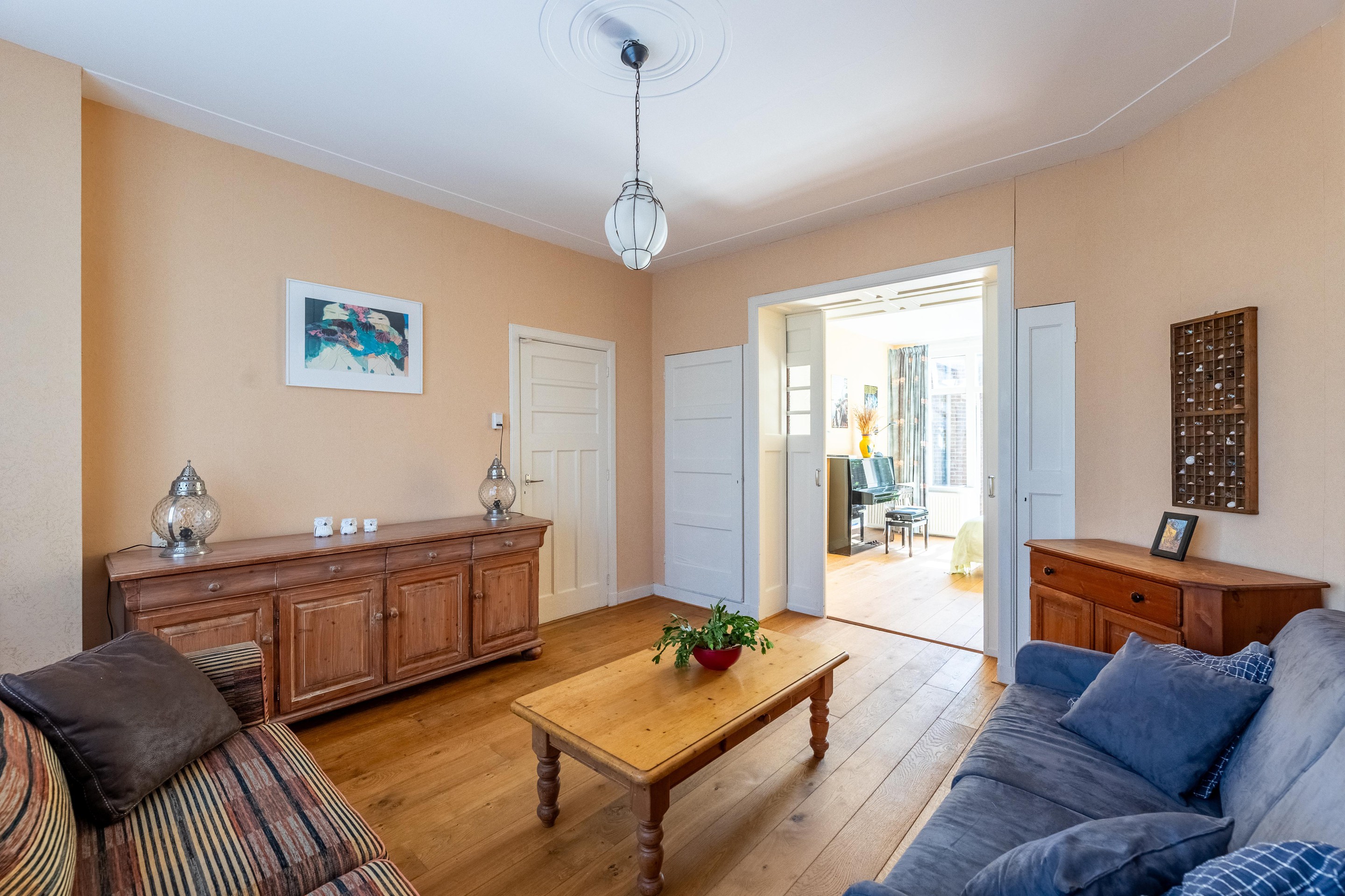 Eerste verdieping Overloop met de trapopgang naar de tweede verdieping, een toiletruimte met fonteintje en een kamer aan de voorzijde. De zeer royale woonkamer heeft hoge plafonds, veel lichtinval en een gezellige erker. De vloer is mooi afgewerkt met een eiken parketvloer.