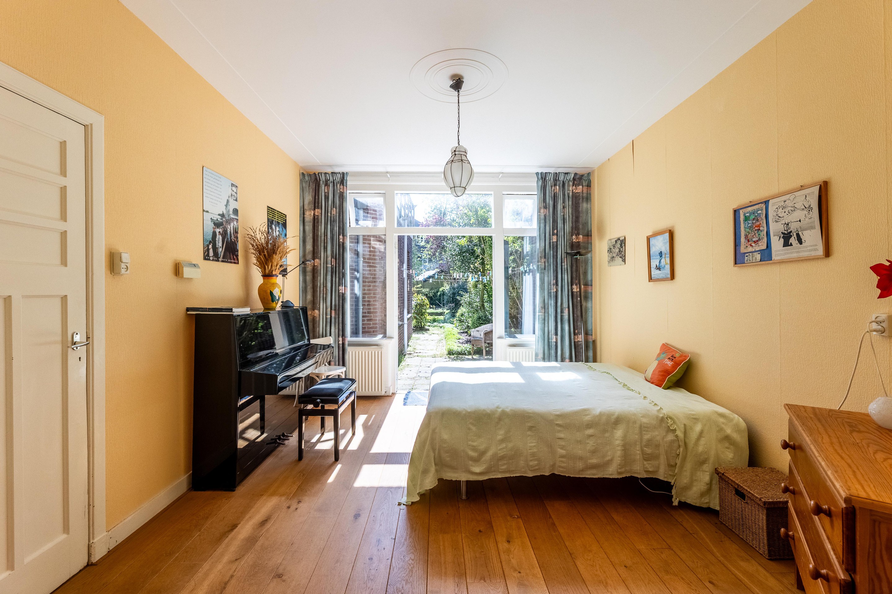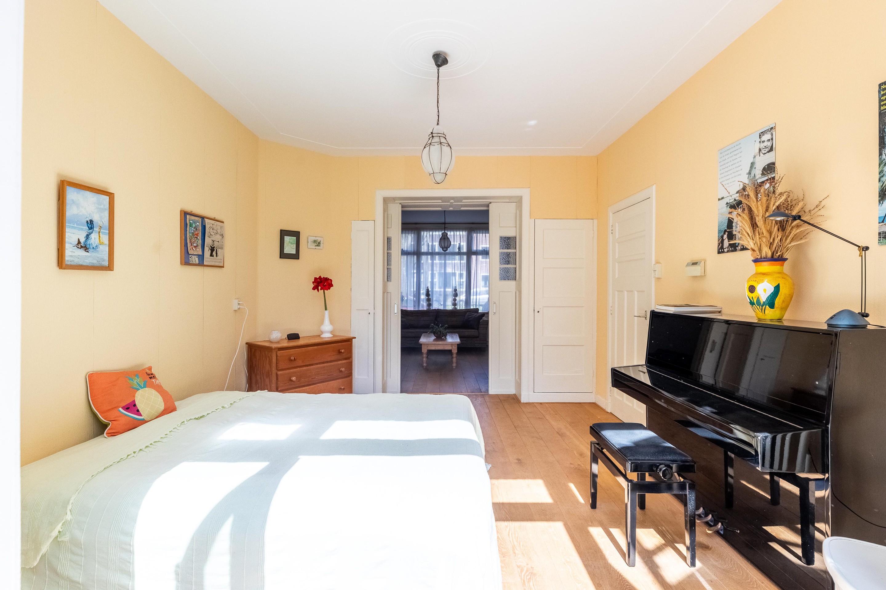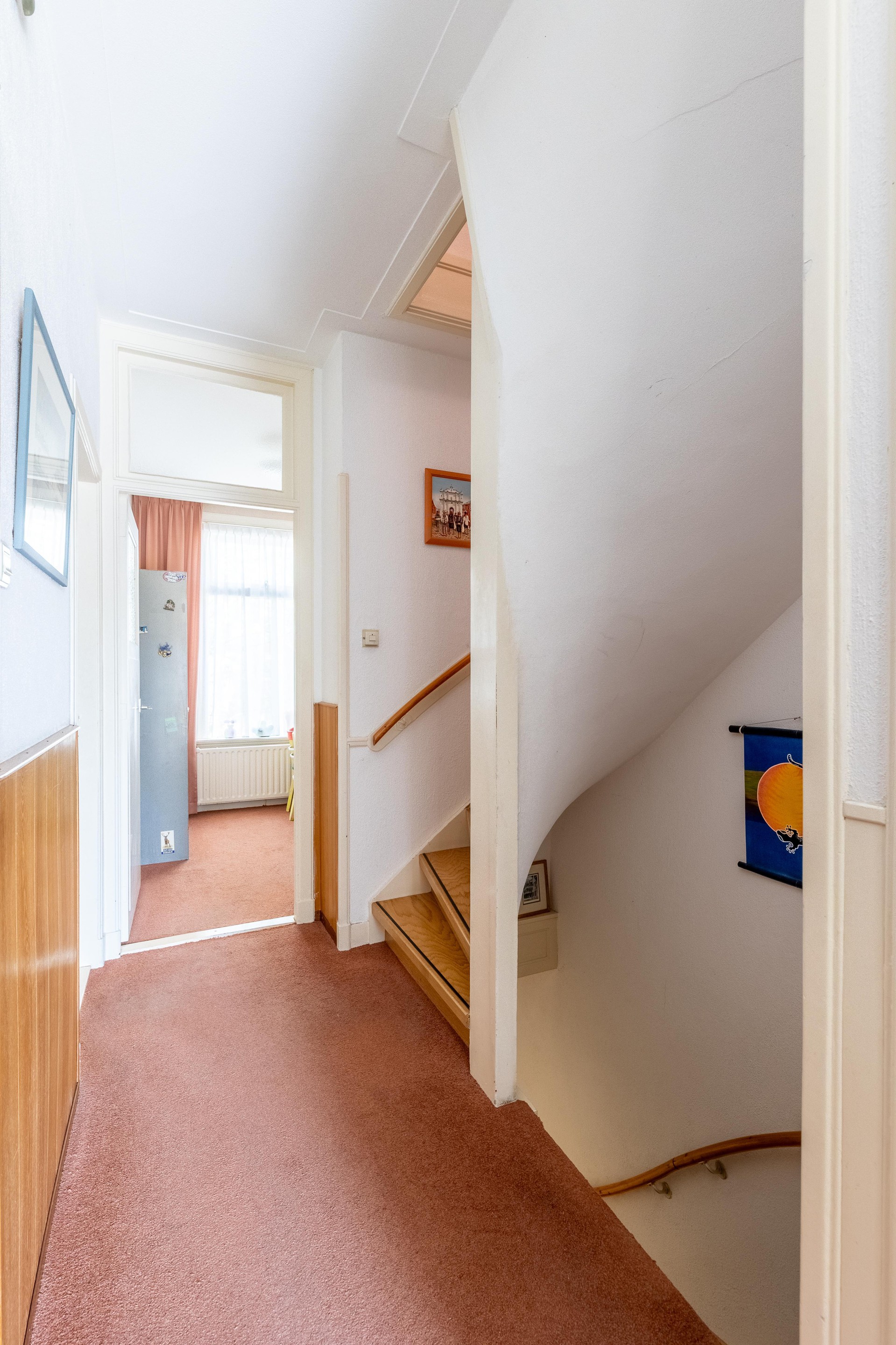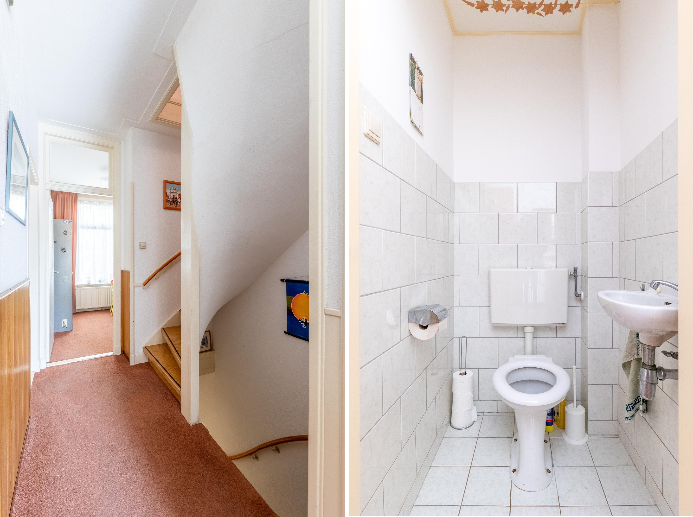 Begane grond Entree met de lange hal. Op de begane grond is al direct de fraaie en zo kenmerkende jaren ‘30 indeling terug te vinden. Er zijn twee kamers die middels de en-suitedeuren met vaste kastruimte apart van elkaar te gebruiken zijn. De kamer aan de achterzijde heeft openslaande deuren naar de achtertuin. In de hal is er een toiletruimte en de trapopgang naar de verdieping. In het verlengde van de hal is een (voormalige) keukenruimte met c.v.-installatie en aansluitend een badkamer met ligbad, douche en wastafelmeubel. Vanuit de badkamer loopt u door naar een extra (slaap)kamer.