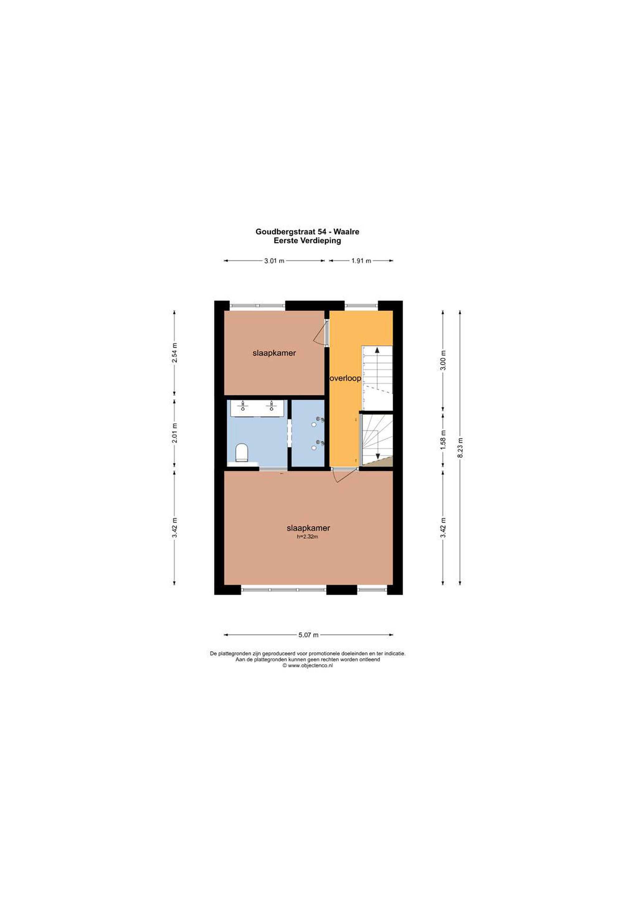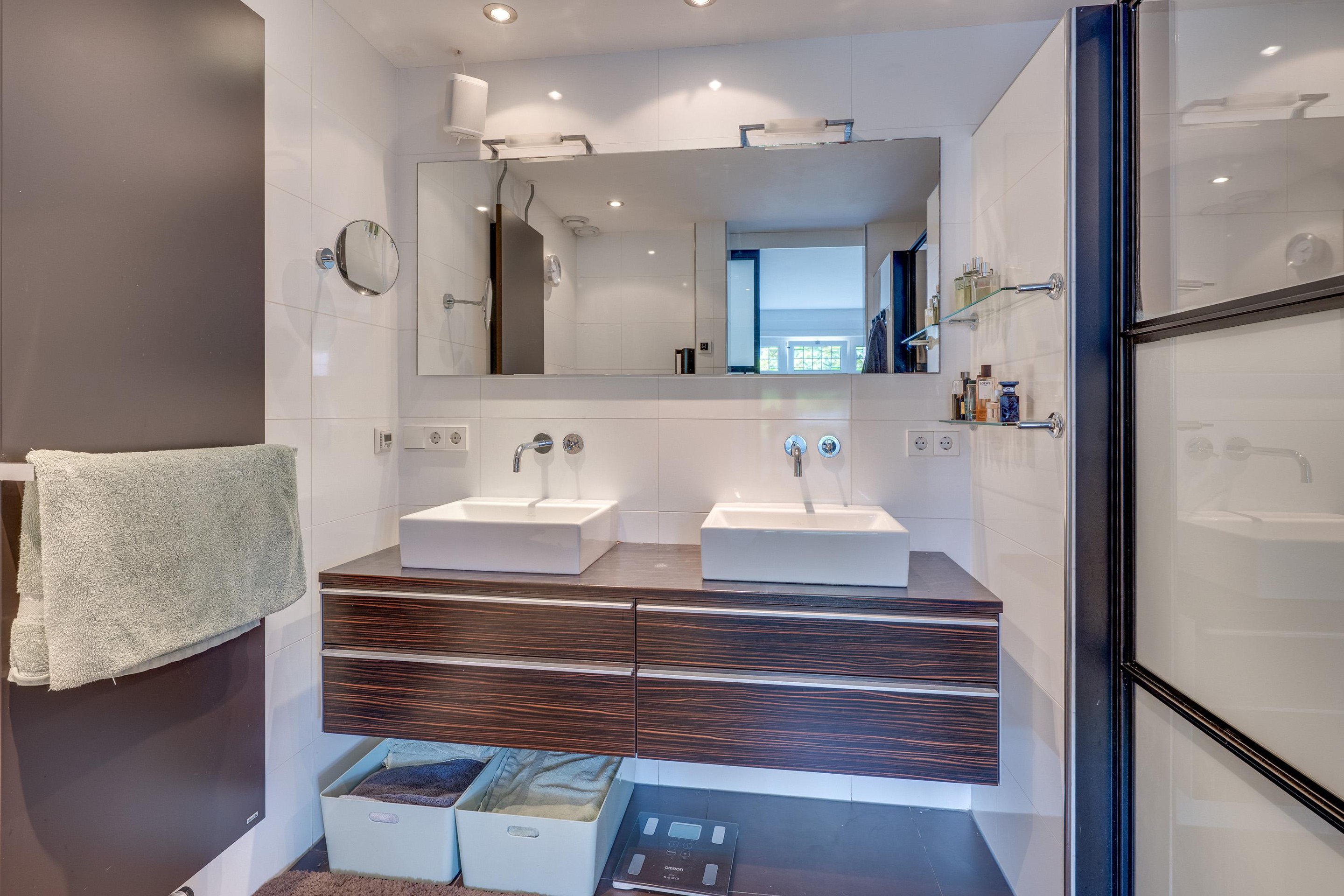 Eerste verdieping Overloop welke toegang biedt aan een tweetal slaapkamers. Aan de voorzijde ligt de grote slaapkamer over de gehele breedte van de woning. Deze slaapkamer is voorzien van een royale, moderne kastenwand. Daarnaast is boven het bed een sfeervolle lichtkoof gerealiseerd. De badkamer is geheel betegeld en uitgerust met een extra grote douche (voorzien van een tweetal regendouches), een luxe wasmeubel met twee wastafels, toilet, designradiator en vloerverwarming. Aan de achterzijde is de tweede slaapkamer gelegen. Alle slaapkamers op de eerste verdieping zijn v.v. airconditioning/inverter die zowel kunnen koelen als verwarmen! De gehele eerste verdieping is voorzien van houten vloeren, strakke wandafwerking in moderne kleurstelling en stucwerk plafonds met diverse inbouwspots.