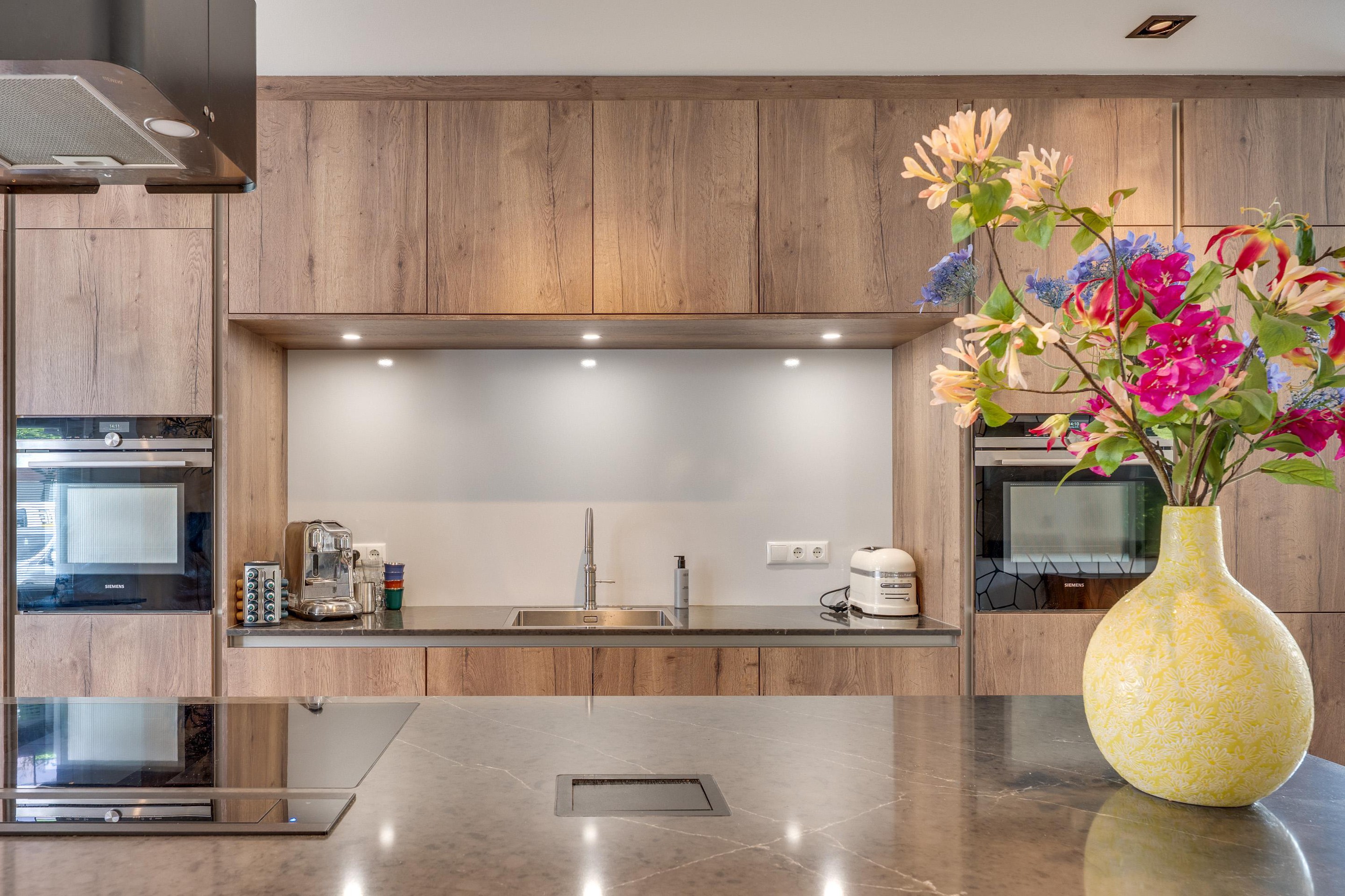 Begane grond Karakteristieke entree met hal voorzien van garderobenis, meterkast en trapopgang. Vanuit de hal bereikt u de recent vernieuwde leefkeuken. De keuken bevindt zich aan de voorzijde van de woning en is voorzien van een nieuwe luxe keukeninrichting in eilandopstelling met de nodige inbouwapparatuur; o.a. met een inductie kookplaat met randafzuiging, extra afzuigkap, koelkast, vriezer, vaatwasser, quooker en een composiet werkblad met een extra grote spoelbak. De opstelling van de keuken voor de erker zorgt voor een speels en ruimtelijk effect. De leefkeuken met eetgedeelte is centraal in de woning gelegen en vormt het hart van de woning waar je gezellig met z’n allen kunt ontbijten maar ook heerlijk kunt tafelen in een sfeervolle ambiance. Vanuit de keuken zijn de living en de kelder bereikbaar. In 1996 is de woning uitgebreid met een moderne, stijlvolle aanbouw. Door de transparantie van deze aanbouw wordt de vooroorlogse sfeer van de oorspronkelijke woning gerespecteerd en in de afgelopen jaren zijn de vloer- en wandafwerking volledig vernieuwd en is de woning voorzien van airconditioning en deels van vloerverwarming. De living is zo goed als in de tuin gelegen. De grote raampartijen rondom geven een prachtig zicht op de tuin en zorgen voor een prettige lichtinval. De extra hoge plafonds geven nog meer ruimte. In de living bevindt zich tevens een grote pellet kachel welke volop warmte biedt op een gure winteravond maar wel CO2 neutraal. Tevens bevinden zich in de aanbouw het royale toilet en de bijkeuken (met aansluitingen voor de was/droog combinatie. De gehele begane grond is voorzien van een strakke wandafwerking in moderne kleurstellingen en stucwerkplafonds met inbouwspots. De hal, leefkeuken en living zijn afgewerkt met een pvcvloer in visgraat motief.