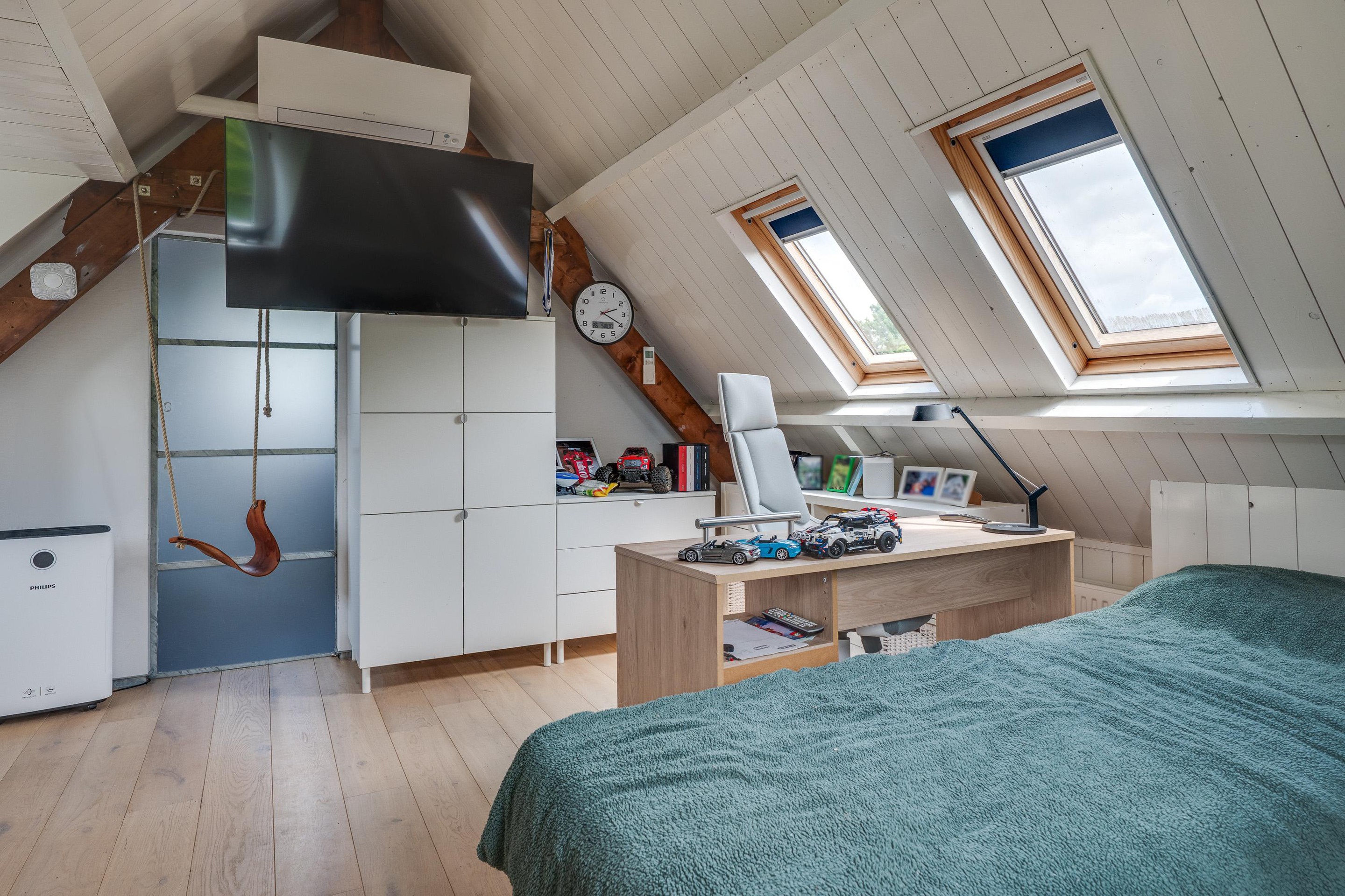Tweede verdieping Op de zolderverdieping is een derde slaapkamer gerealiseerd. De oorspronkelijke kapconstructie is zichtbaar gebleven waardoor deze kamer een karakteristieke sfeer heeft. Ook deze kamer is voorzien van een airconditioner/inverter die kan koelen in de zomer en verwarmen in de winter. Vanuit deze zolderkamer heeft men een fraai uitzicht op de groene achtertuin. Tevens is op de tweede verdieping een bergruimte waar de CV-installatie gesitueerd is. De moderne en recent vernieuwde HR cv ketel is uitgevoerd met een warmtepomp boiler voor de warmwatervoorziening.
