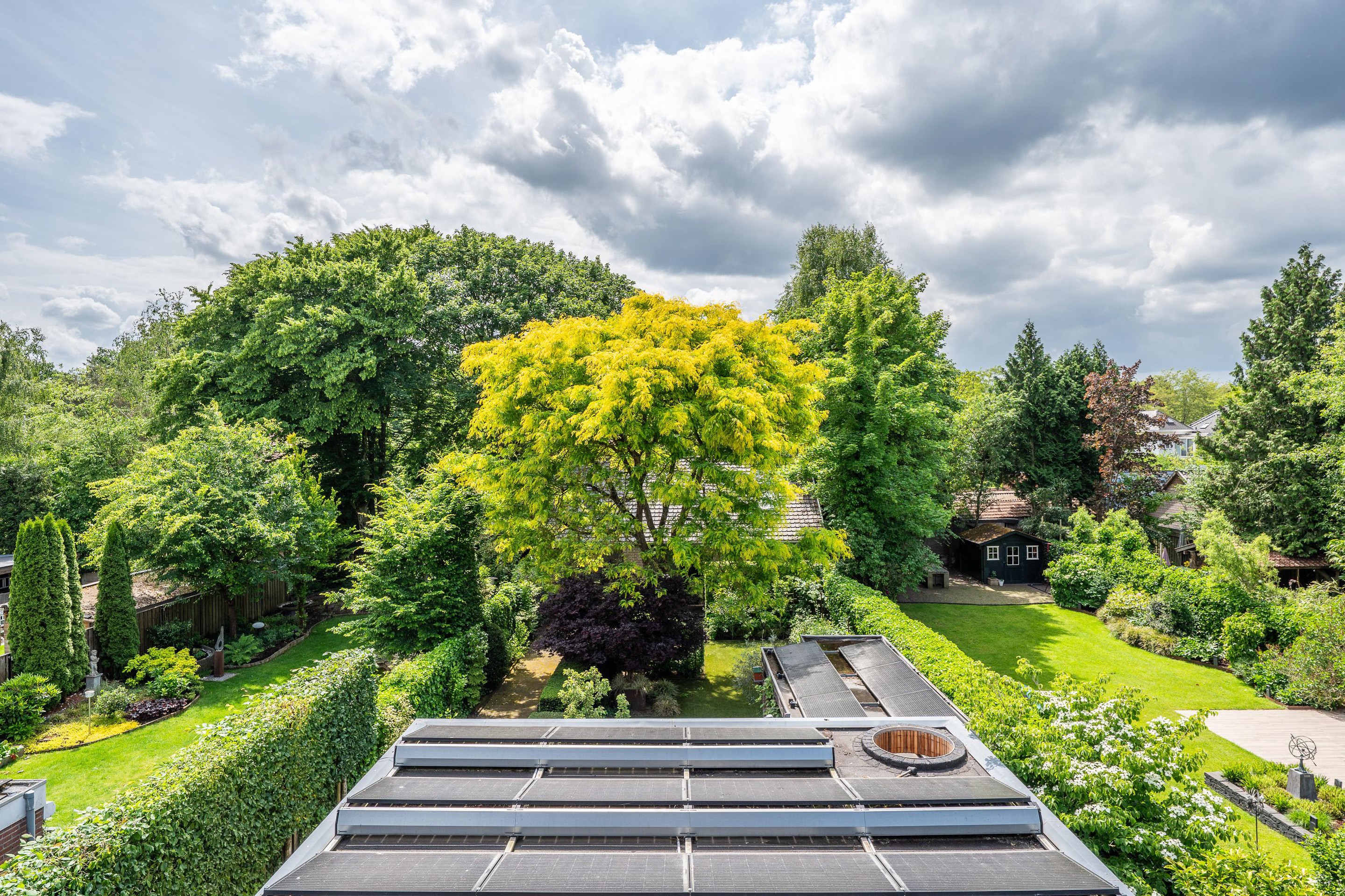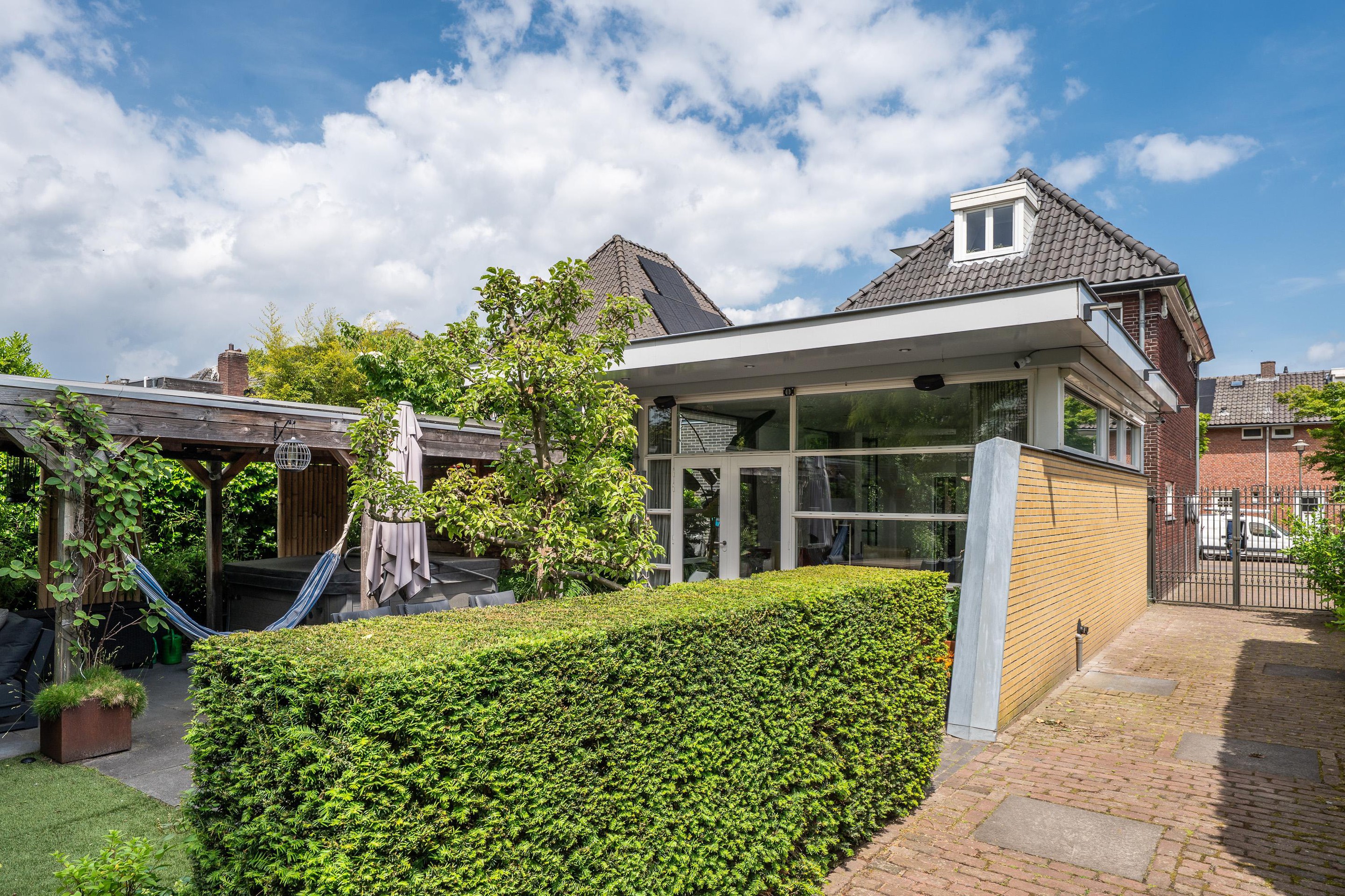 Tuin De woning is gelegen aan een rustige woonstraat in de dorpskern van Aalst, direct nabij het Tongelreepdal en natuurgebied De Hurken. Enerzijds zijn alle voorzieningen op loopafstand, anderzijds loopt u rechtstreeks het buitengebied in. De veel privacy biedende tuin is op het zuid-westen gelegen. De achtertuin biedt gevarieerde gebruiksmogelijkheden; van de gezelligheid van de terrassen tot de riante overkapping met jacuzzi en gezellige zit. De twee opritten zorgen voor meer dan voldoende parkeer-mogelijkheden op eigen terrein v.v laadinfrastructuur voor het opladen van elektrische en hybride voertuigen. Achter op het perceel is de enorme garage annex hobby-/atelierruimte gelegen. De oppervlakte bedraagt op de begane grond alleen al ca 100 m2 (11 X 9 meter), met in de kap de nog een extra verdieping welke ook gebruikt kan worden t.b.v. extra slaapvertrekken. Het geheel is in spouw opgetrokken en voorzien van alle denkbare voorzieningen, zoals een kitchenette, een volledig geoutilleerde badkamer, een toilet, geluids- en tv-systeem, airconditioning en alarm. Deze ruimte maakt dit woonobject tot een zeer interessant geheel. Ideaal voor diegenen die extra gebruiksruimte appreciëren of een luxe thuiskantoor wensen.