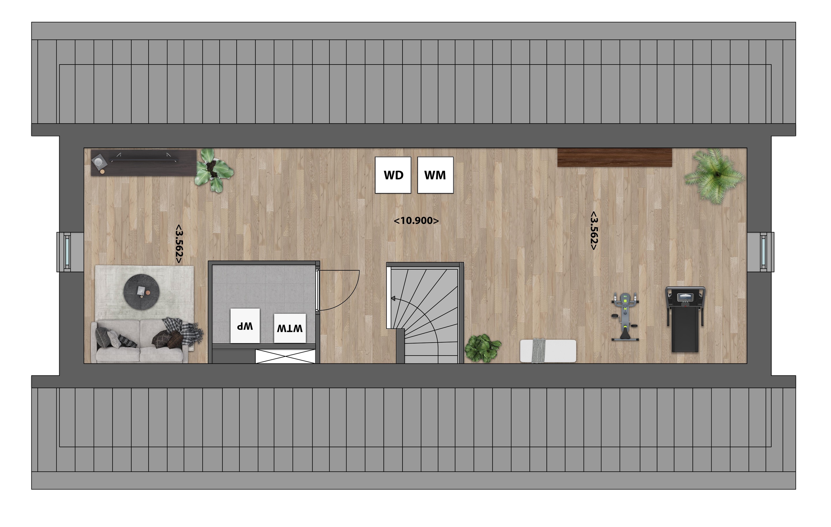 Op de sfeerplattegrond is deze verdieping ingericht met een zitgedeelte, fitnessapparatuur en een werkplek. Dit toont de veelzijdigheid van deze verdieping – een waardevolle aanvulling op het wooncomfort van deze woning.