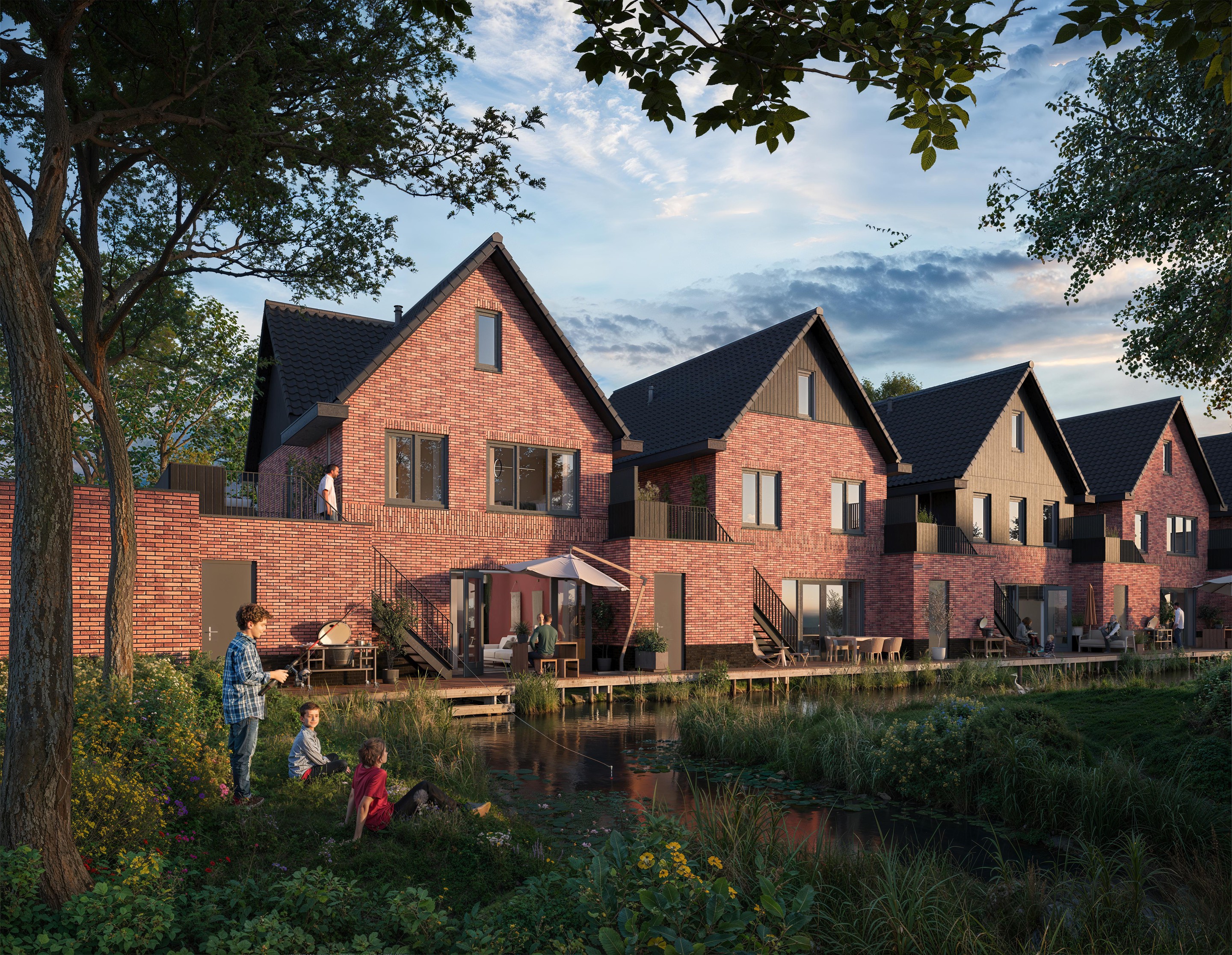 Vlak bij het centrum van Waddinxveen, langs de oevers van de Gouwe, worden binnenkort zes vrijstaande herenhuizen met garage gerealiseerd.